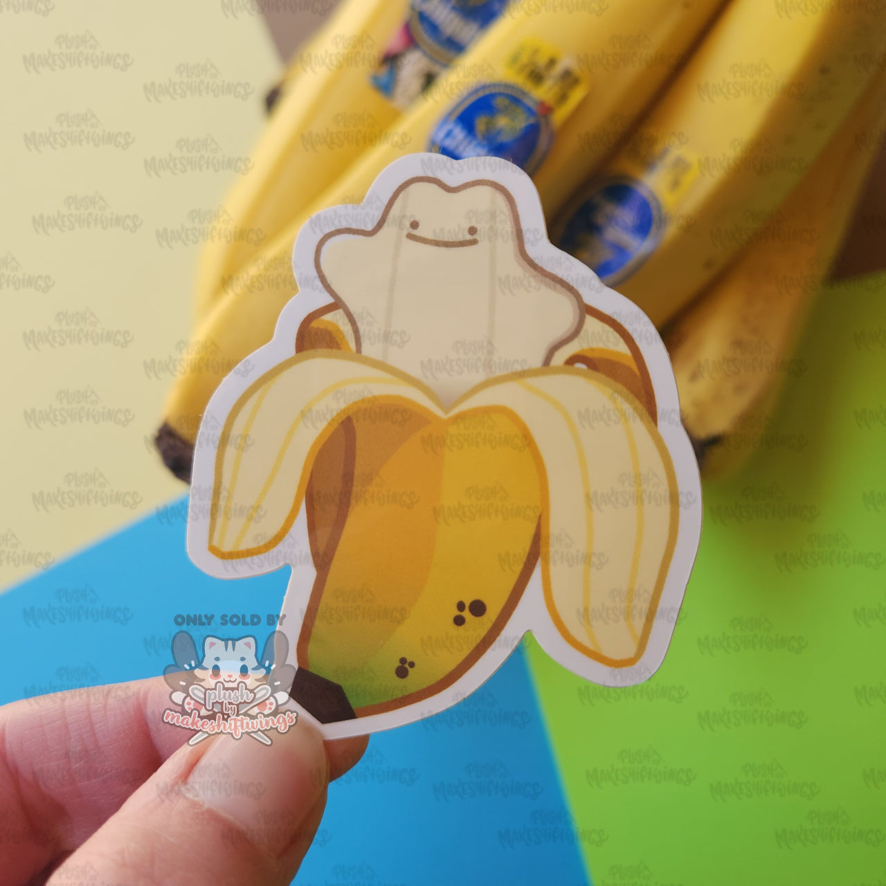This banana sticker is approximately 2.2" wide by 2.5" tall. It has a glossy vinyl finish. This sticker is weatherproof for 2-4 years. This means they will hold up in the rain, sun, snow, dishwashers, microwaves, etc.