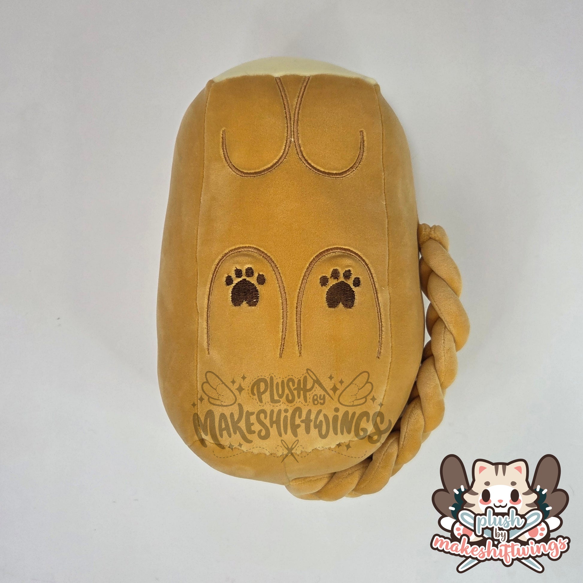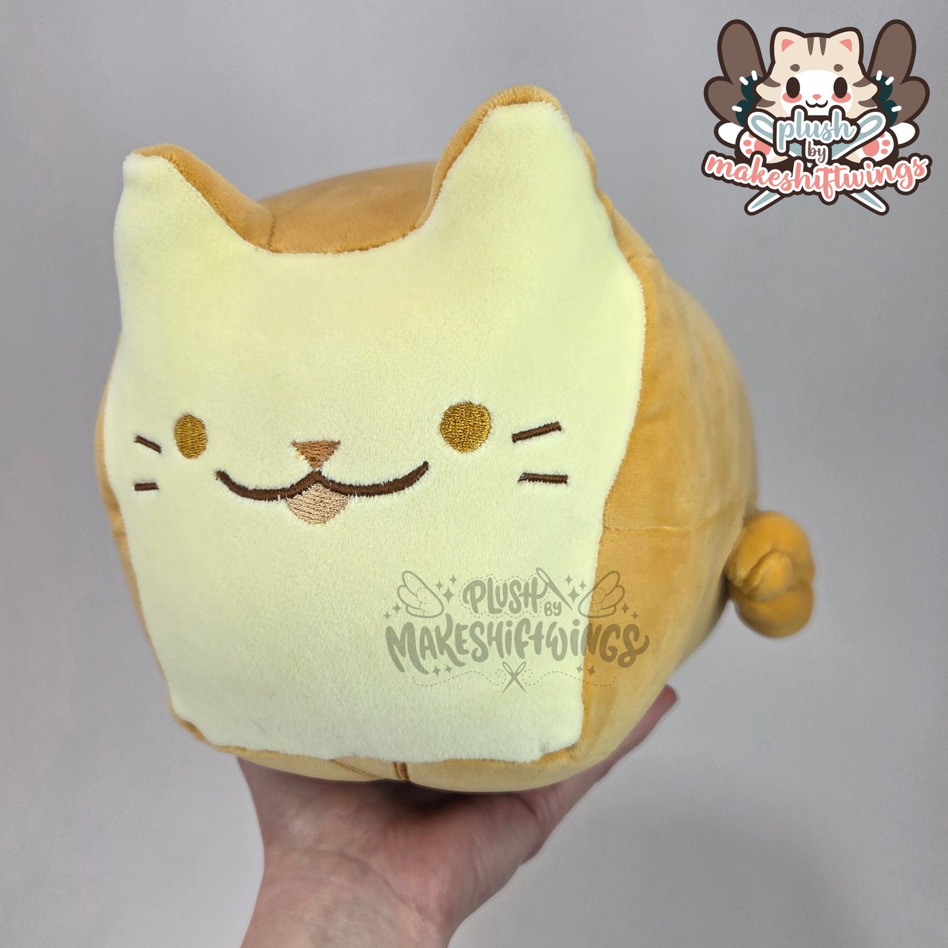 This is a loaf of cat bread! Approximately 11" long and made from mochi minky, so he is VERY soft, fat, and squishy! Features an embroidered face, legs, and applique scoring marks. The tail is plaited and tacked onto the side of the plush. Everything else is machine sewn.