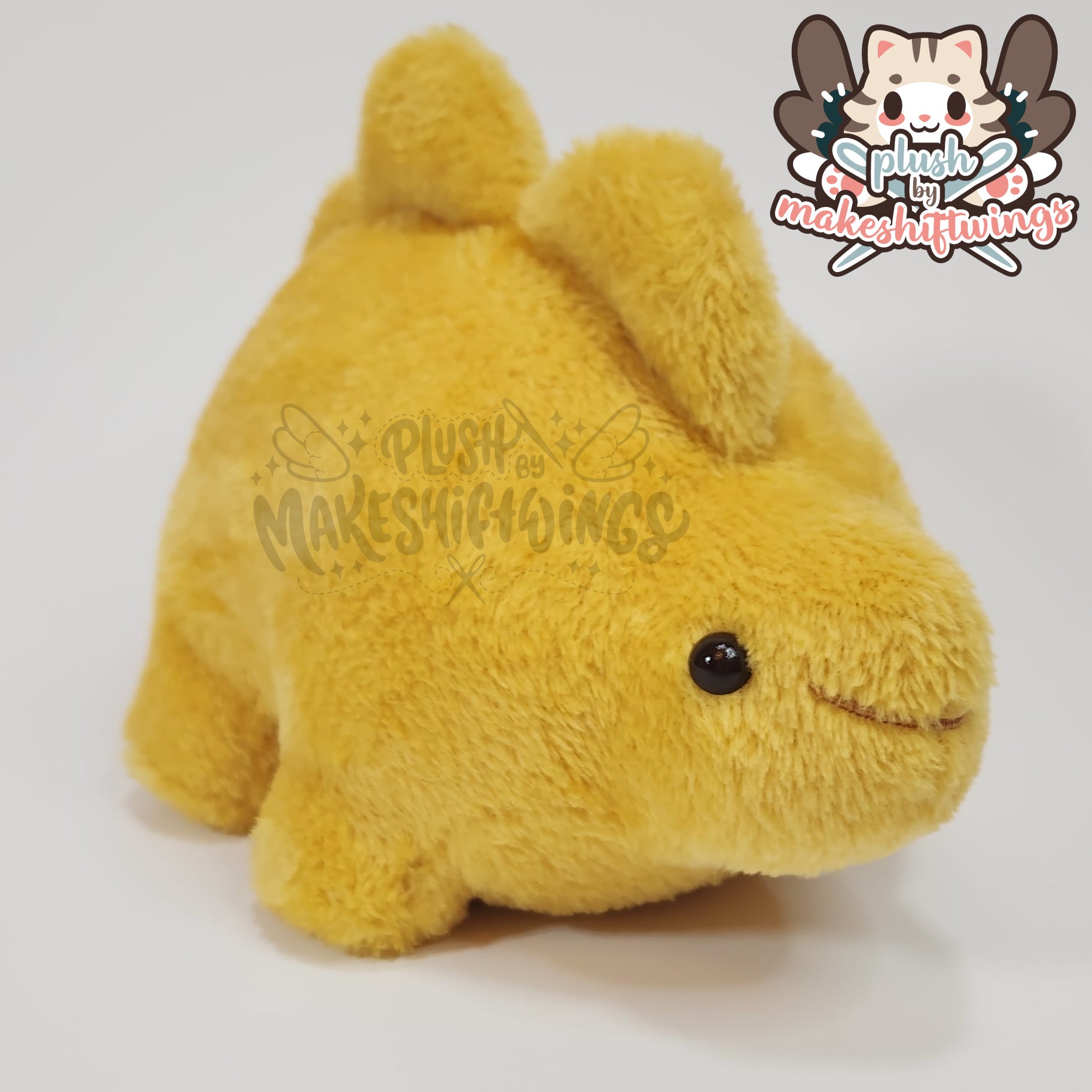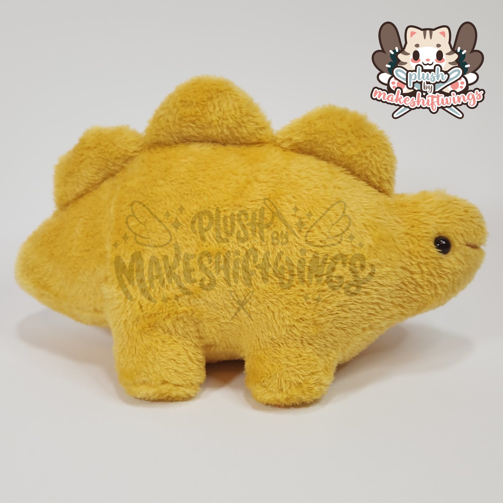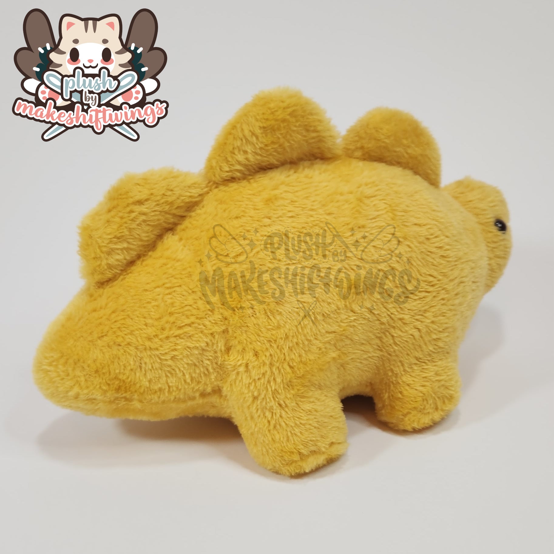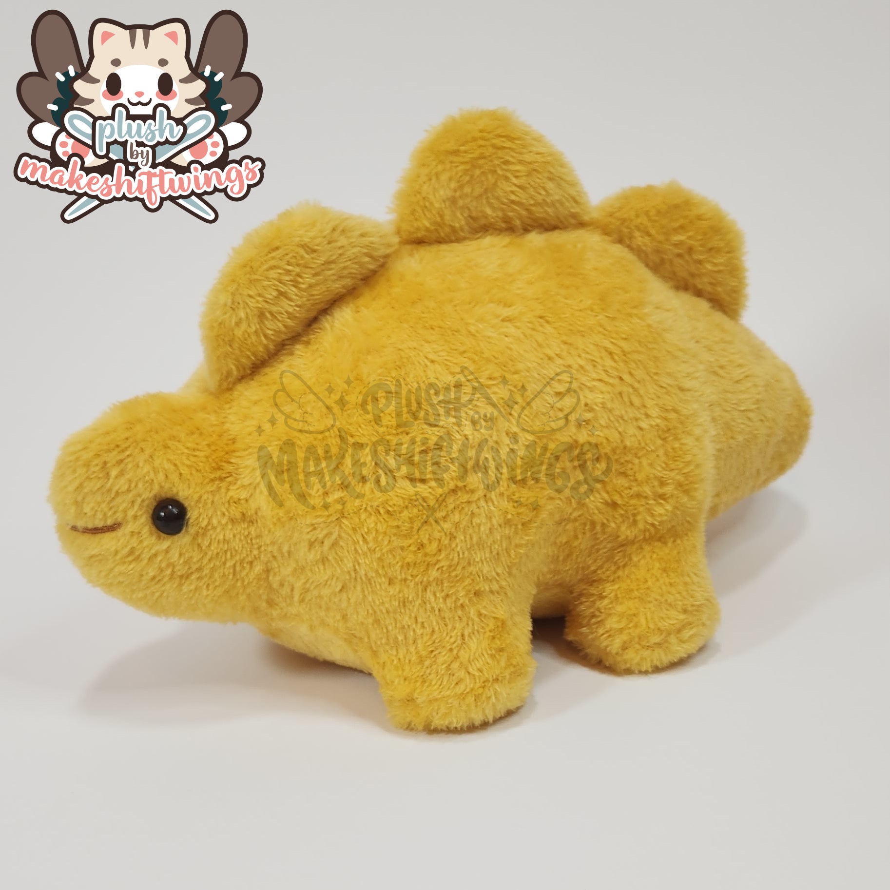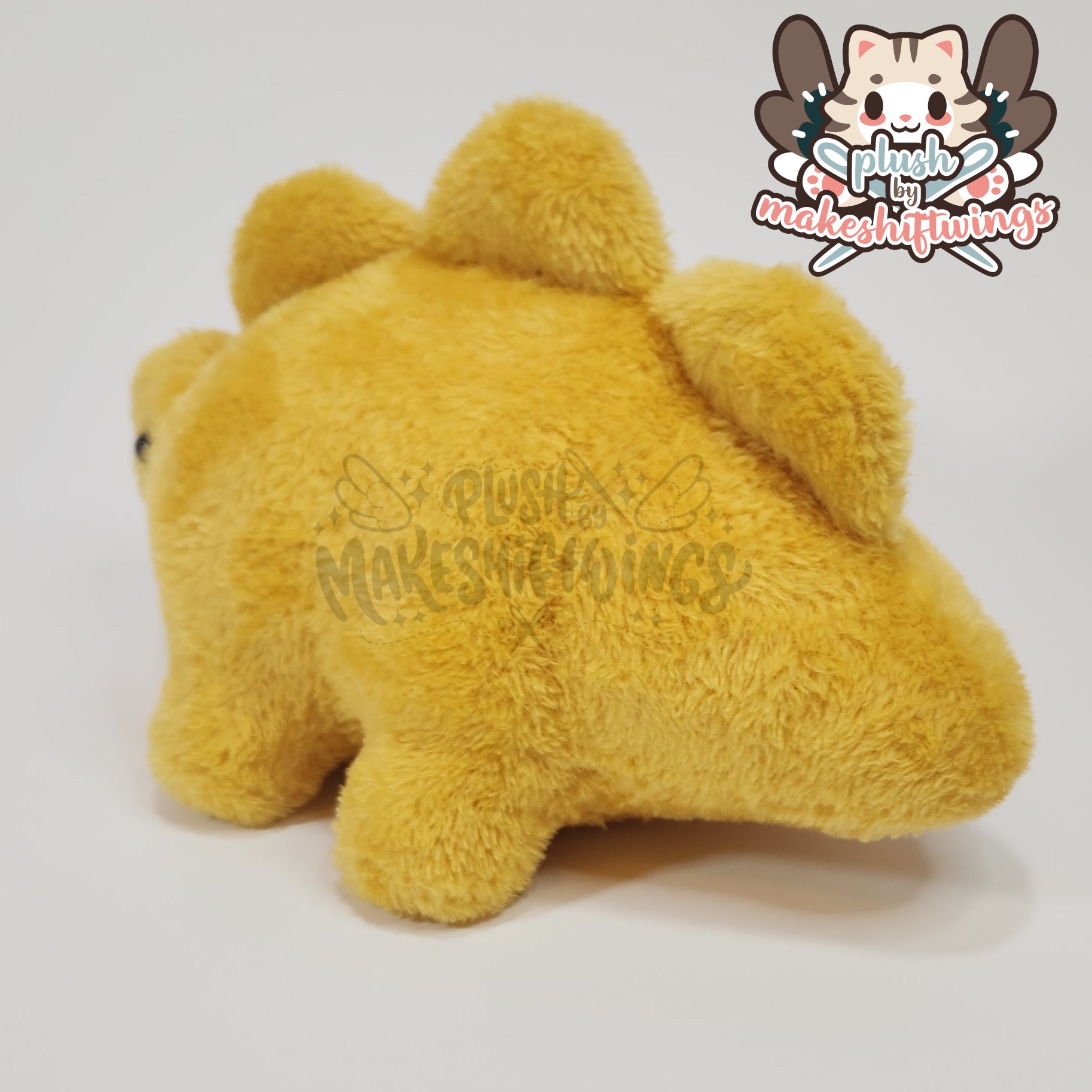 This stegosaurus dino nuggie plush is made from sew lush 5mm minky with safety eyes and a machine embroidered mouth. It is about 5" tall.