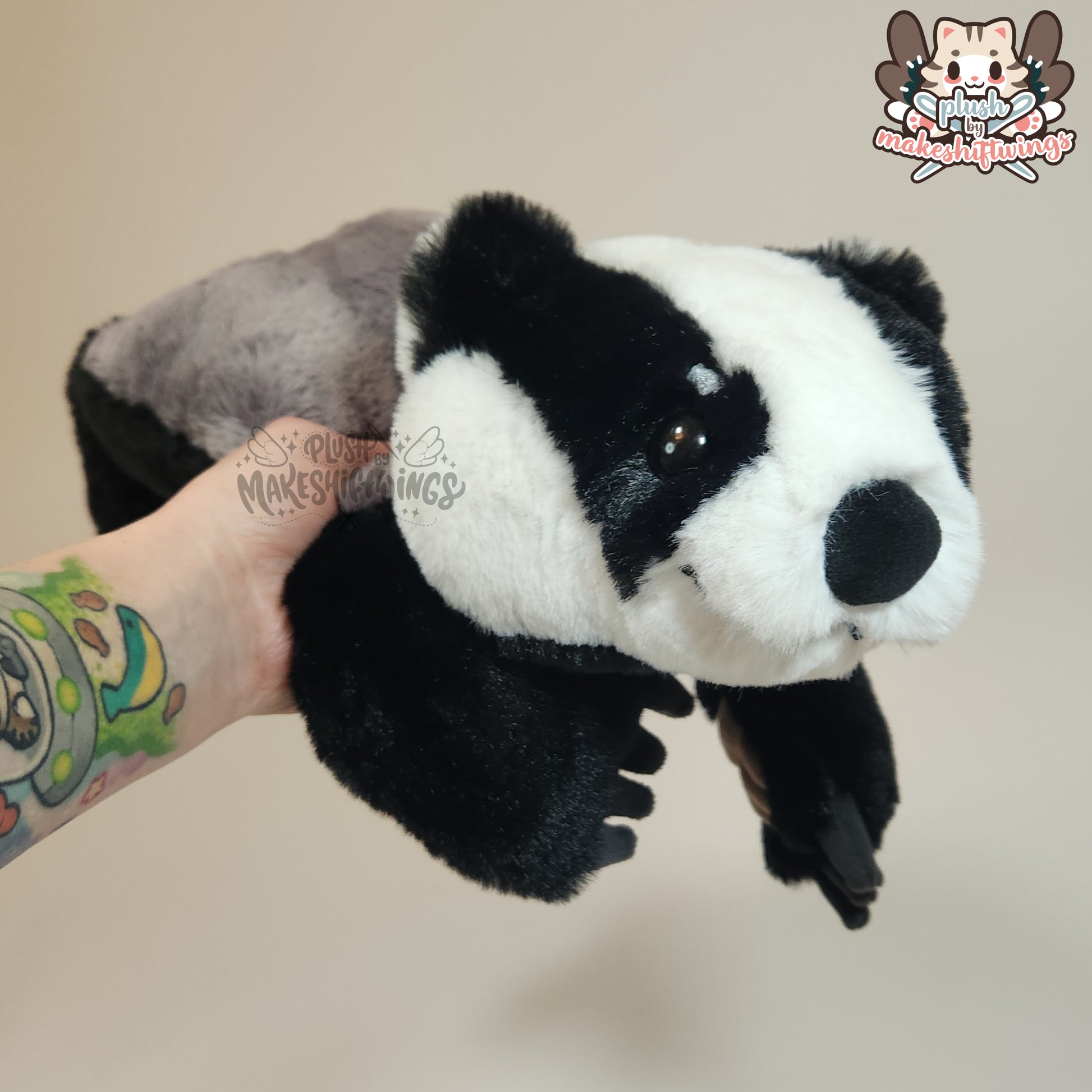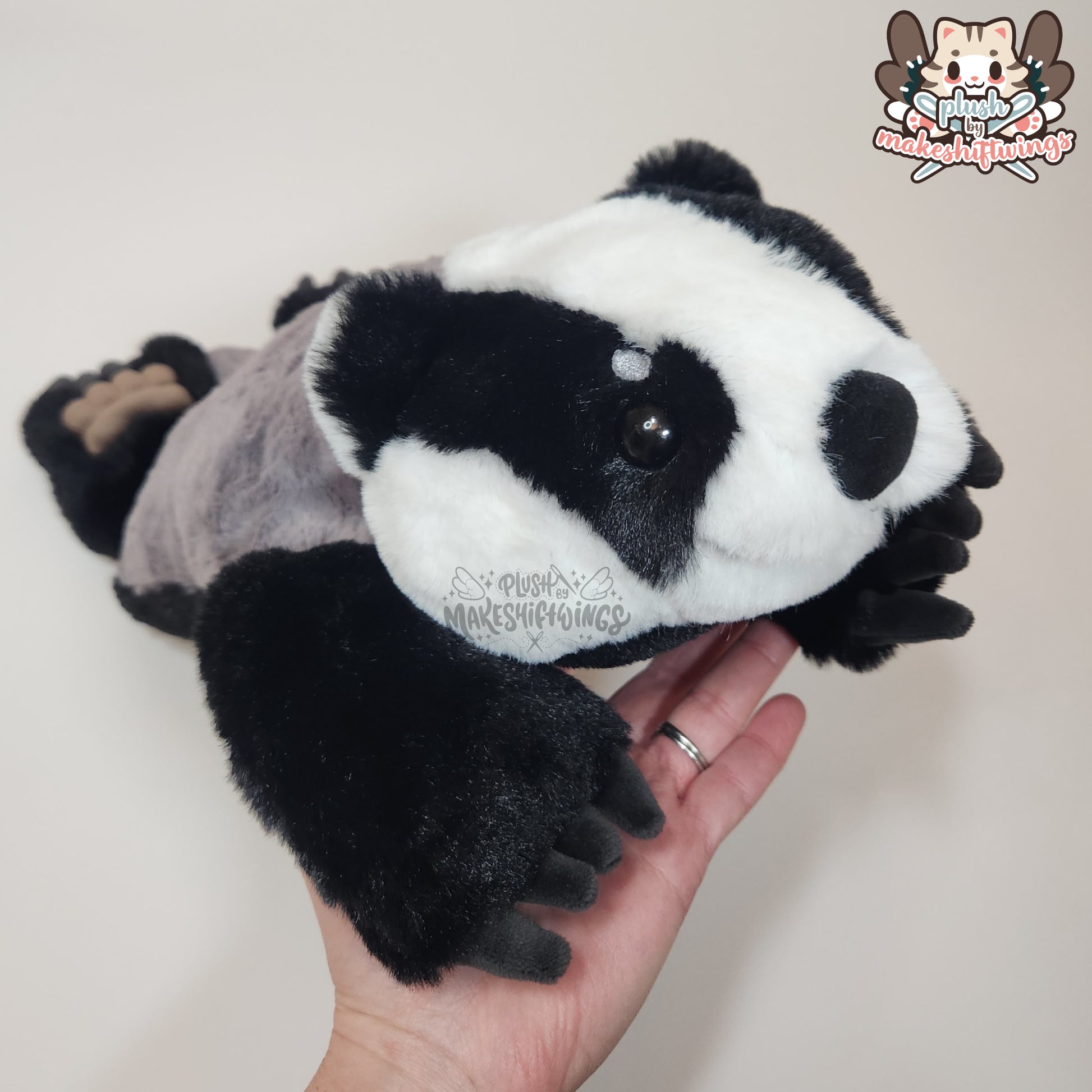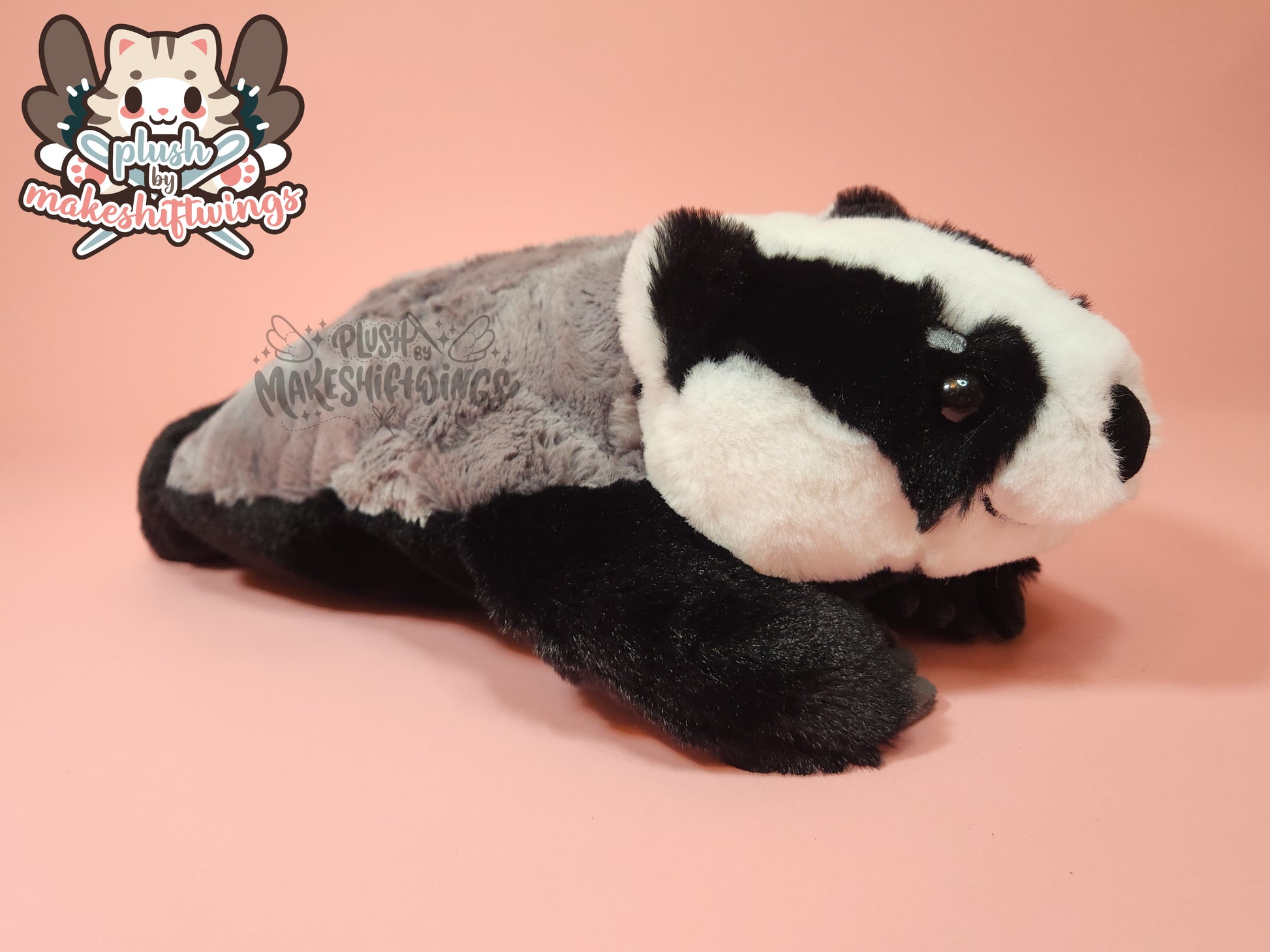 This flat badger plush is made from luxe cuddle minky with mochi minky claws and puffy paw pads. He has safety eyes and an embroidered mouth. He has polypellets in his limbs so he is very soft and floppy! Plush is entirely machine sewn except the nose, which is hand-sewn on. Plush is approximately 17" long.