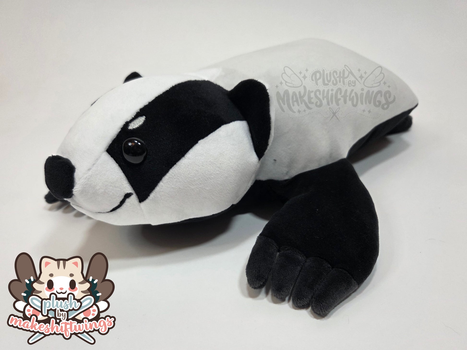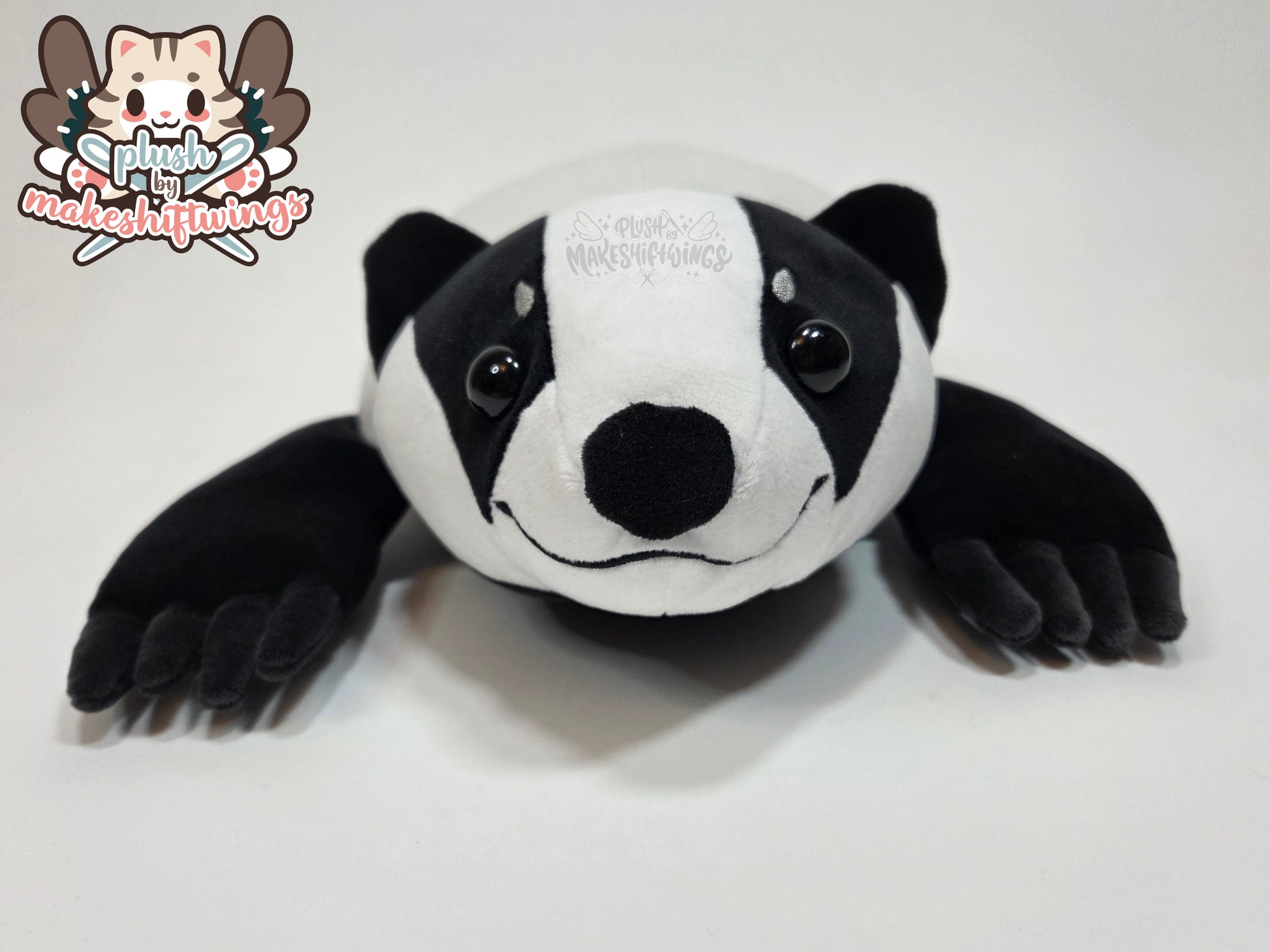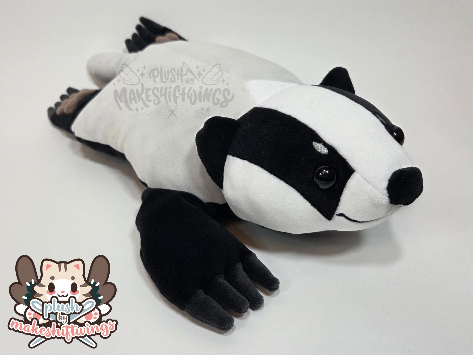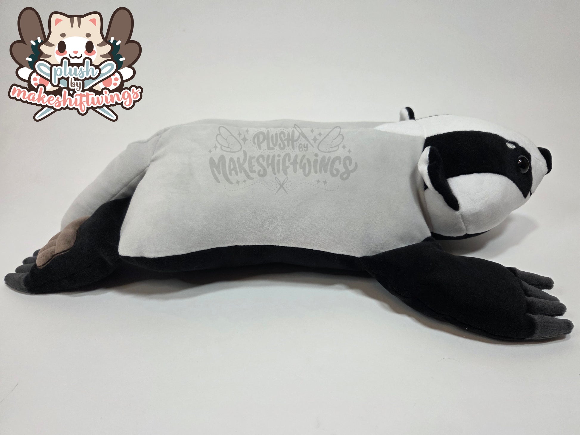 This flat badger plush is made from mochi minky with mochi minky. He has safety eyes and an embroidered mouth. He has polypellets in his limbs so he is very soft and floppy! Plush is entirely machine sewn except the nose, which is hand-sewn on. Plush is approximately 17" long.