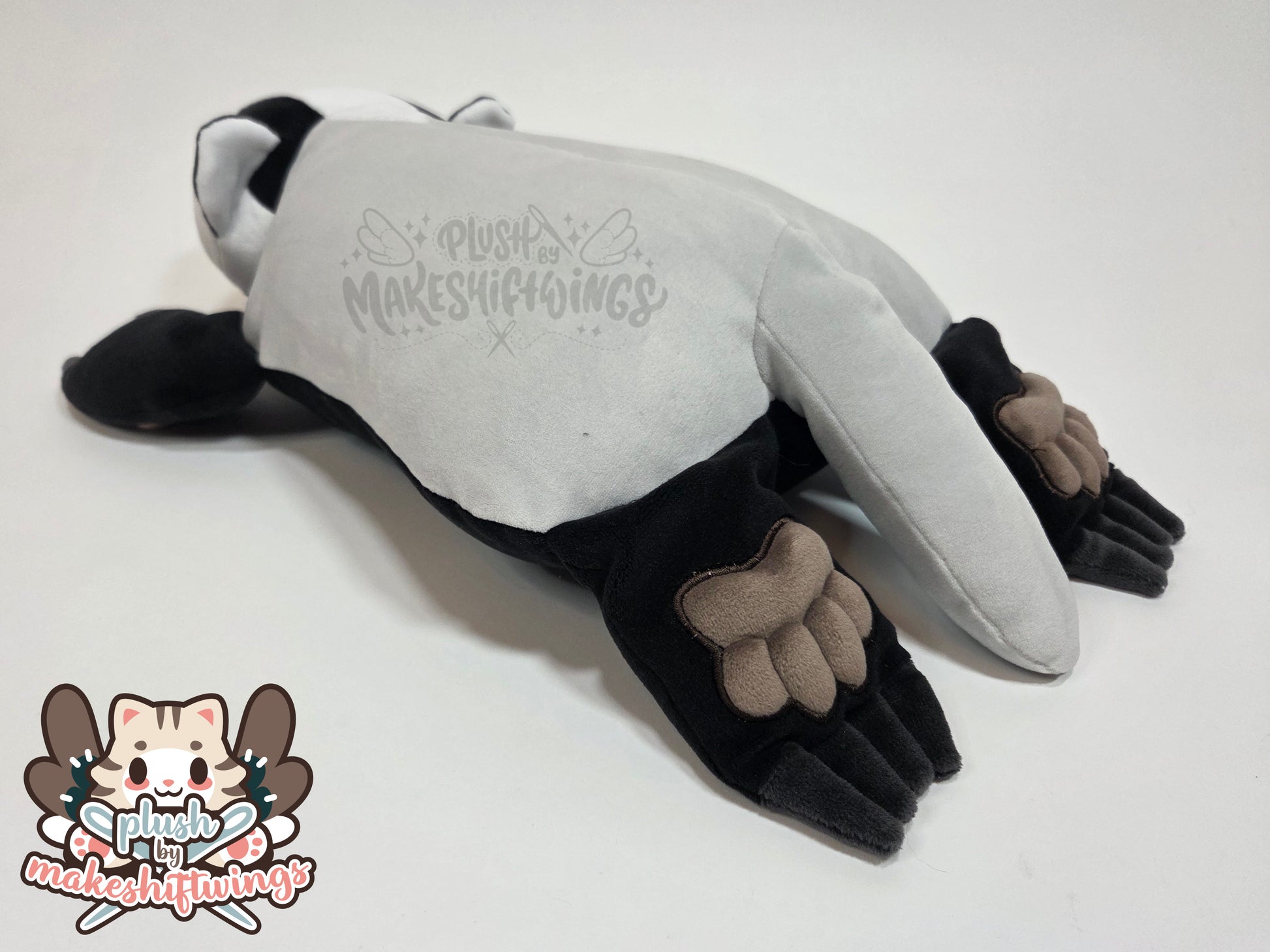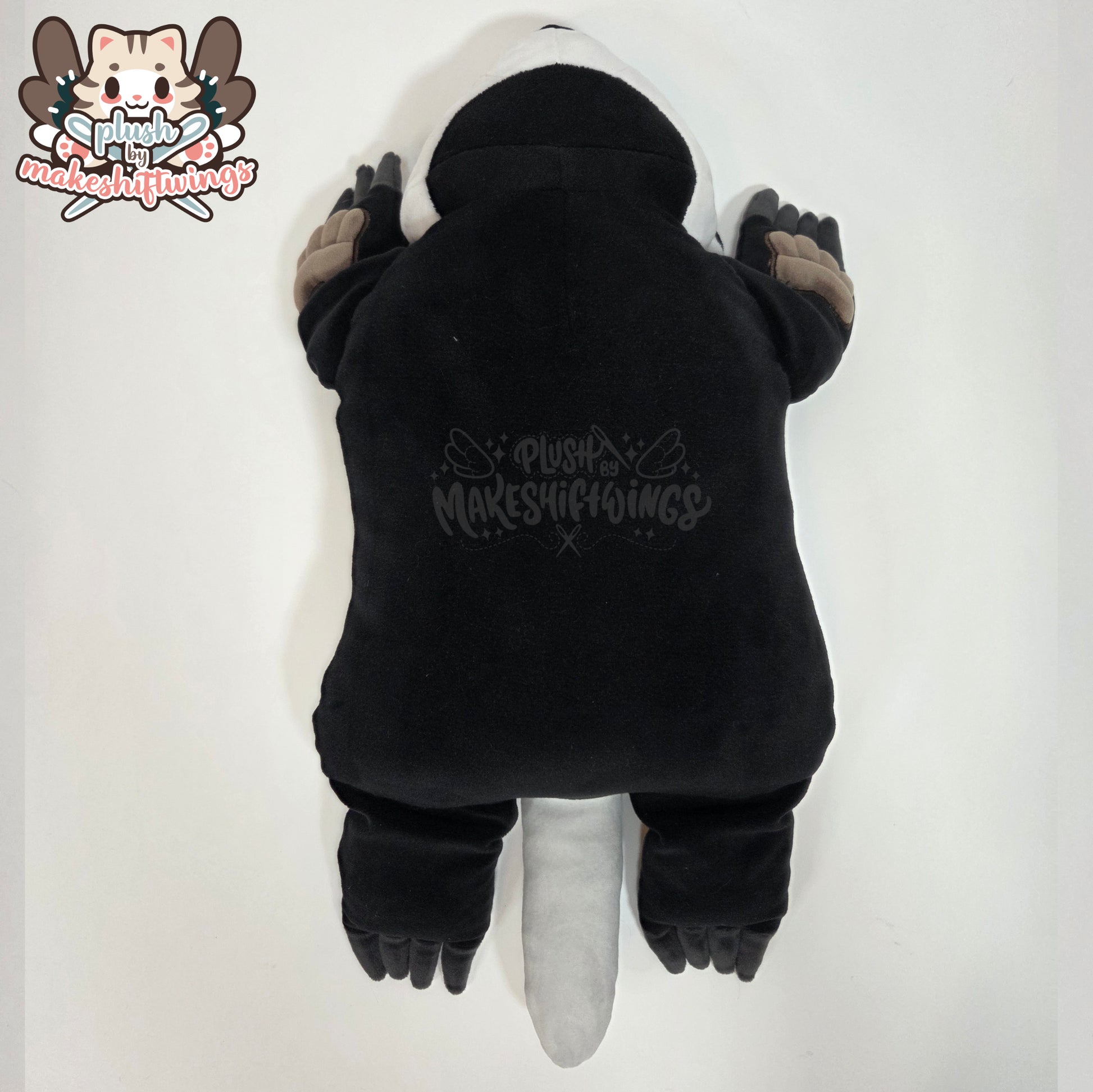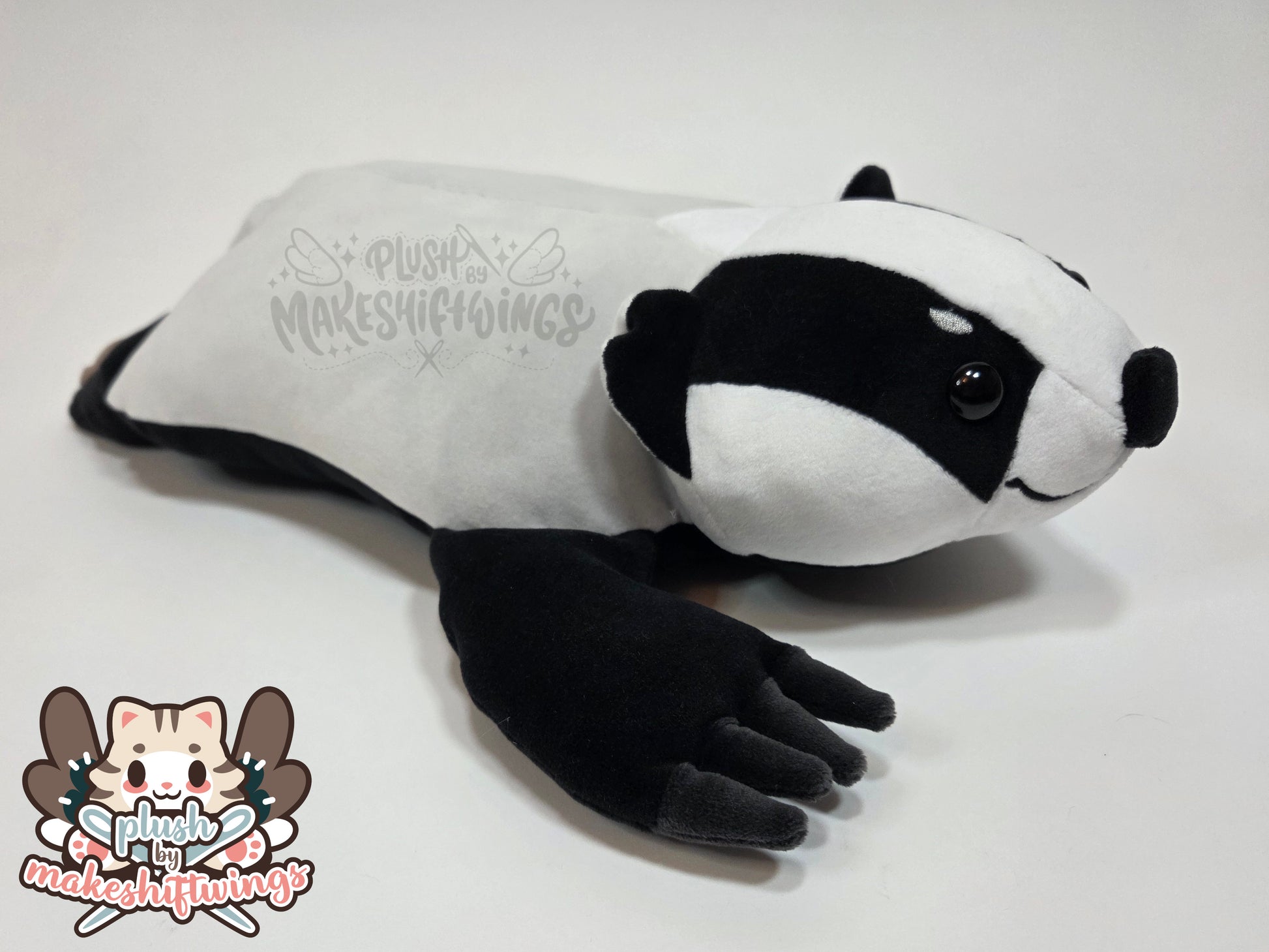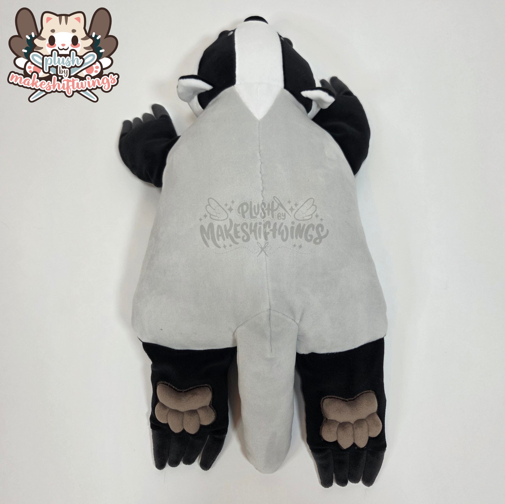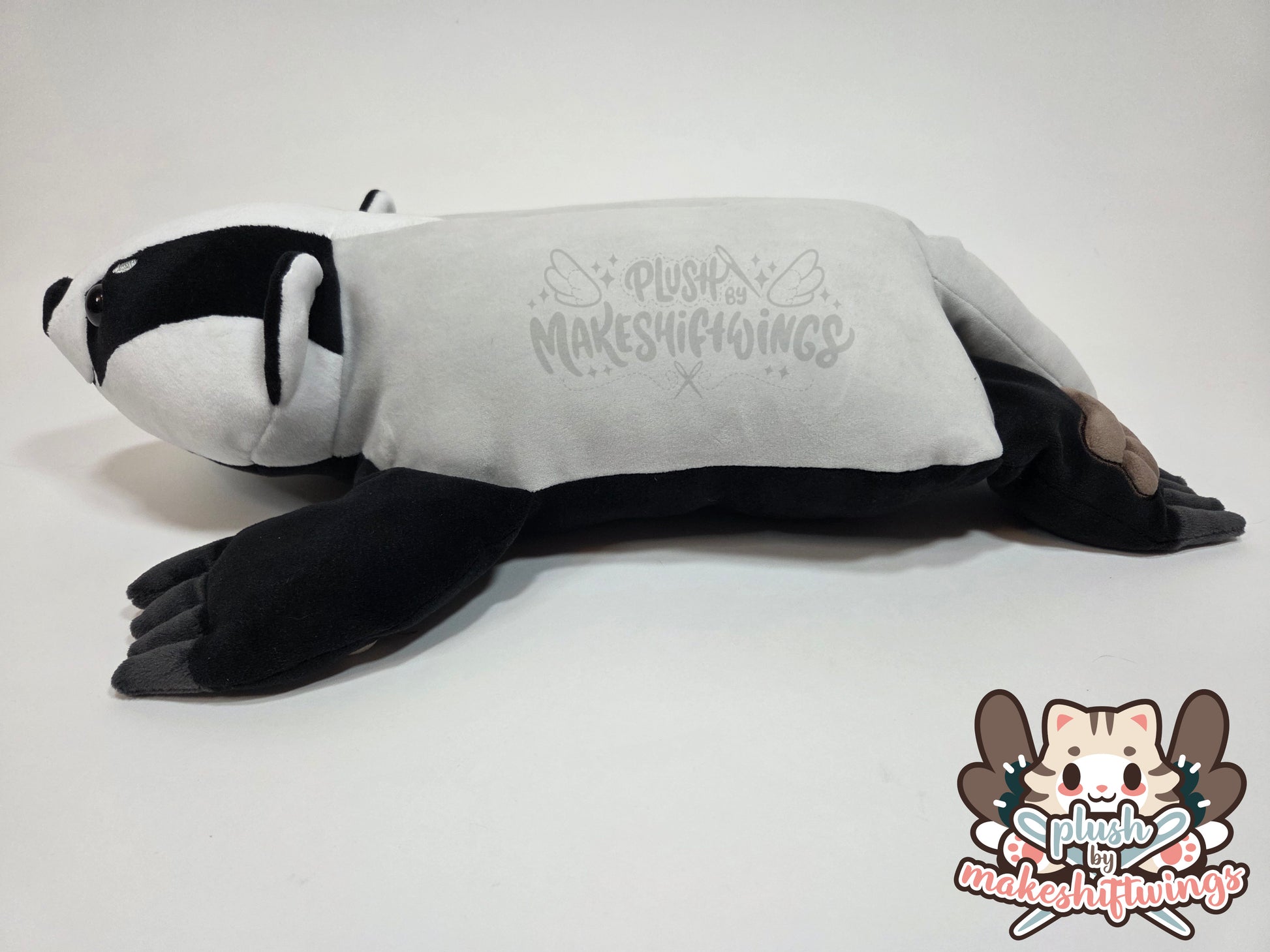 This flat badger plush is made from mochi minky with mochi minky. He has safety eyes and an embroidered mouth. He has polypellets in his limbs so he is very soft and floppy! Plush is entirely machine sewn except the nose, which is hand-sewn on. Plush is approximately 17" long.