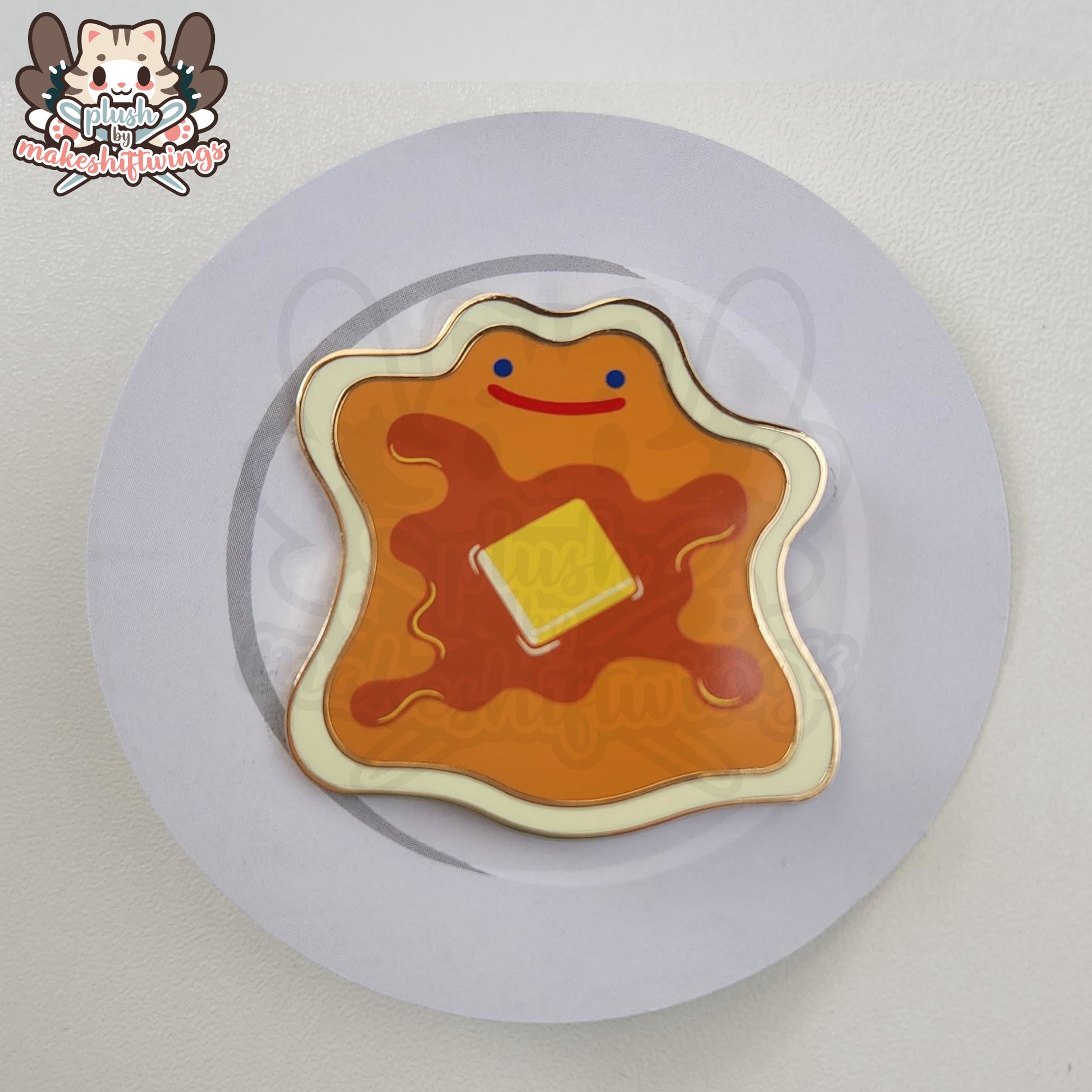The hard enamel pancake pins have gold plating with screen printed eyes, mouth, syrup, and butter. They are approximately 1.5" tall. Pins have 2 blue heart rubber backings and come with a plate backing card.