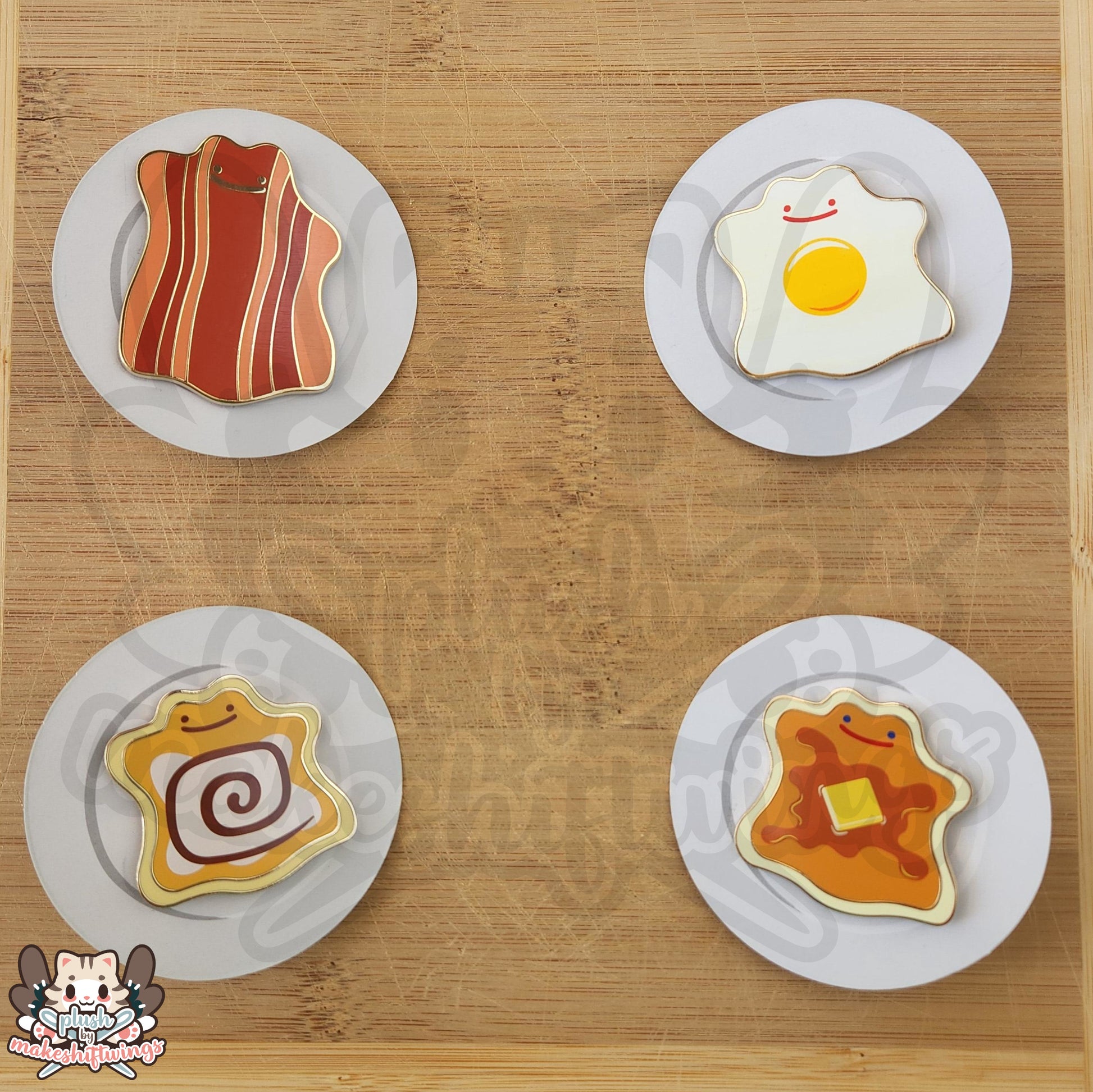 This is a full set of breakfast buddy pins. Each set comes with 1 of each design: bacon, egg, cinnamon roll, and pancake.