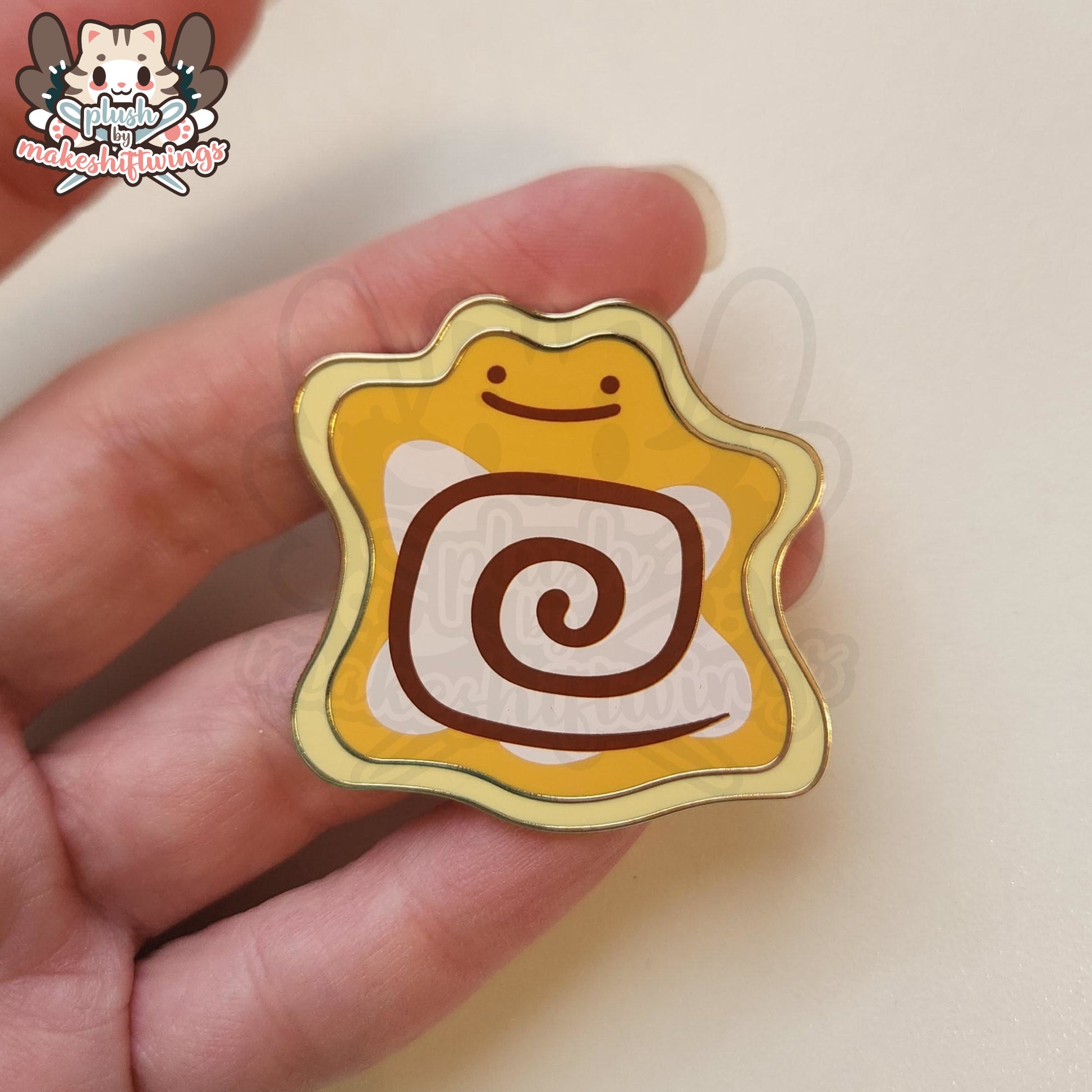 The hard enamel cinnamon roll pins have gold plating with screen printed eyes, mouth, frosting, and swirl. They are approximately 1.5" tall. Pins have 2 orange heart rubber backings and come with a plate backing card.