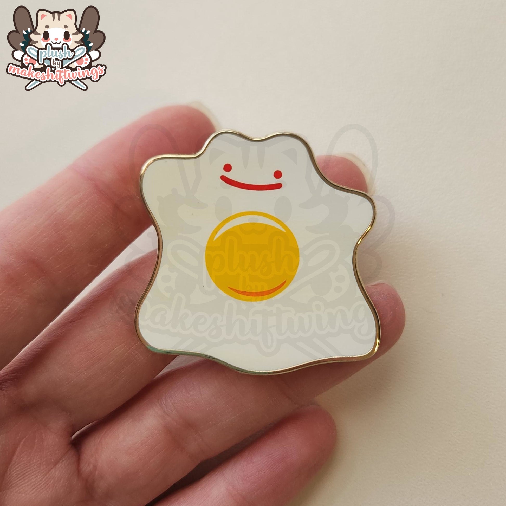 The hard enamel egg pins have gold plating with screen printed eyes, mouth, and egg. They are approximately 1.5" tall. Pins have 2 red heart rubber backings and come with a plate backing card.