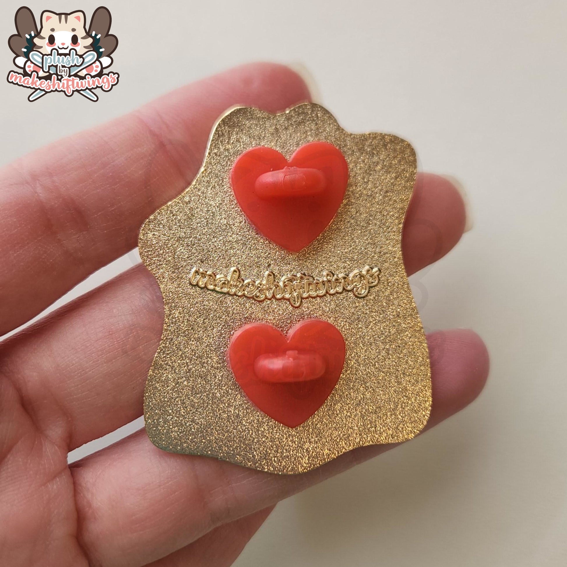 The hard enamel bacon pins have gold plating. They are approximately 2" tall. Pins have 2 red heart rubber backings and come with a plate backing card.