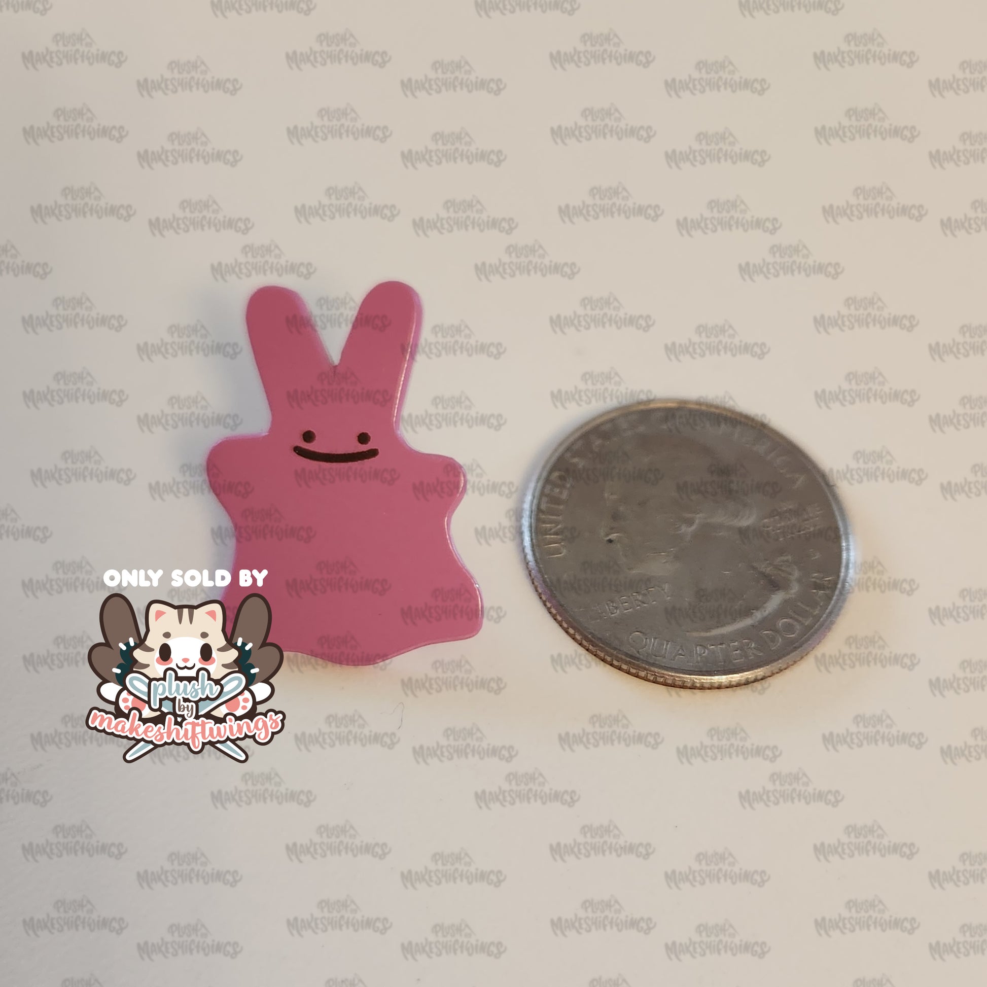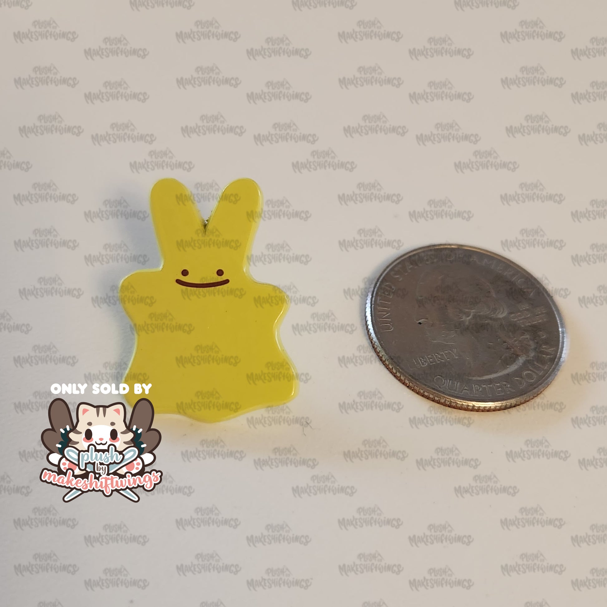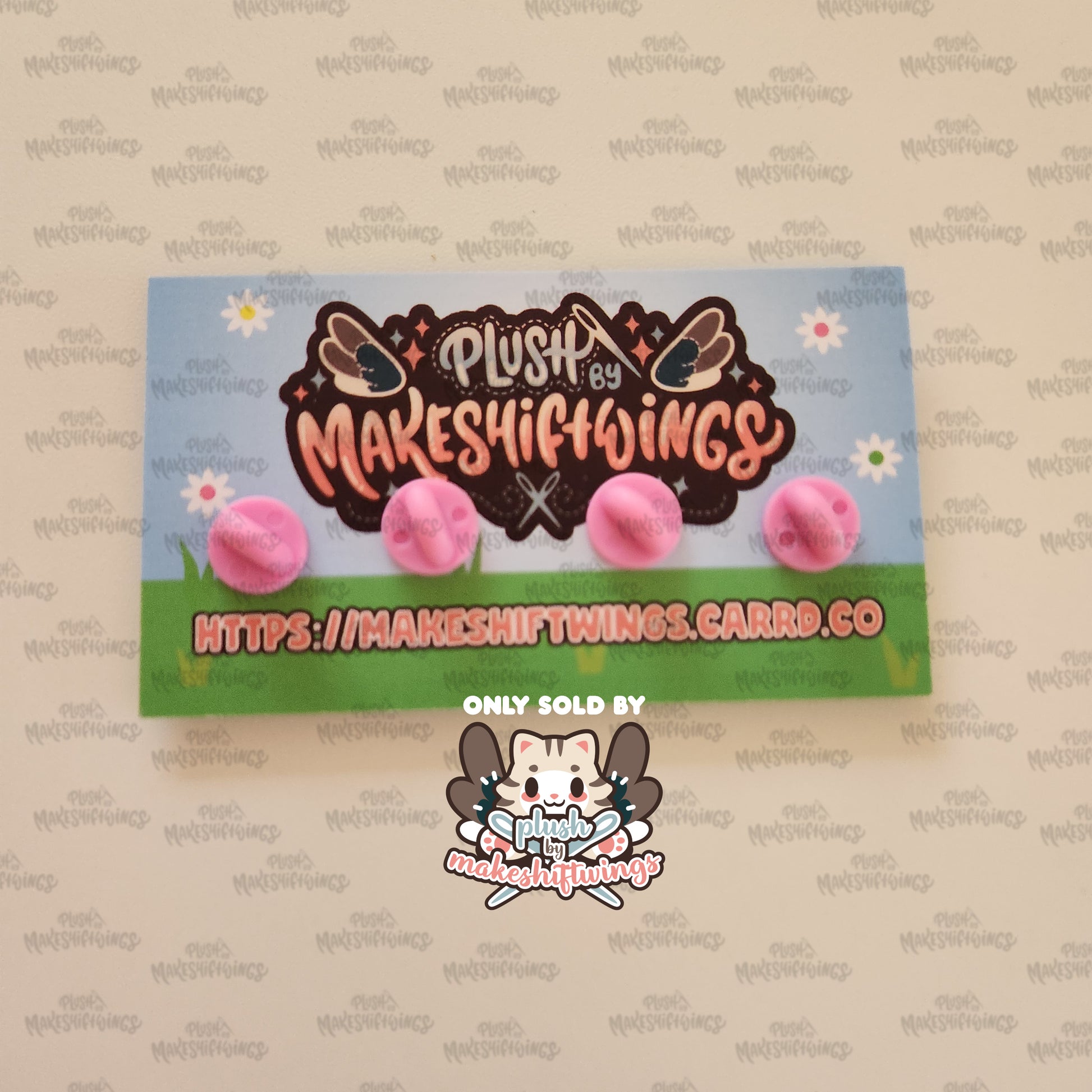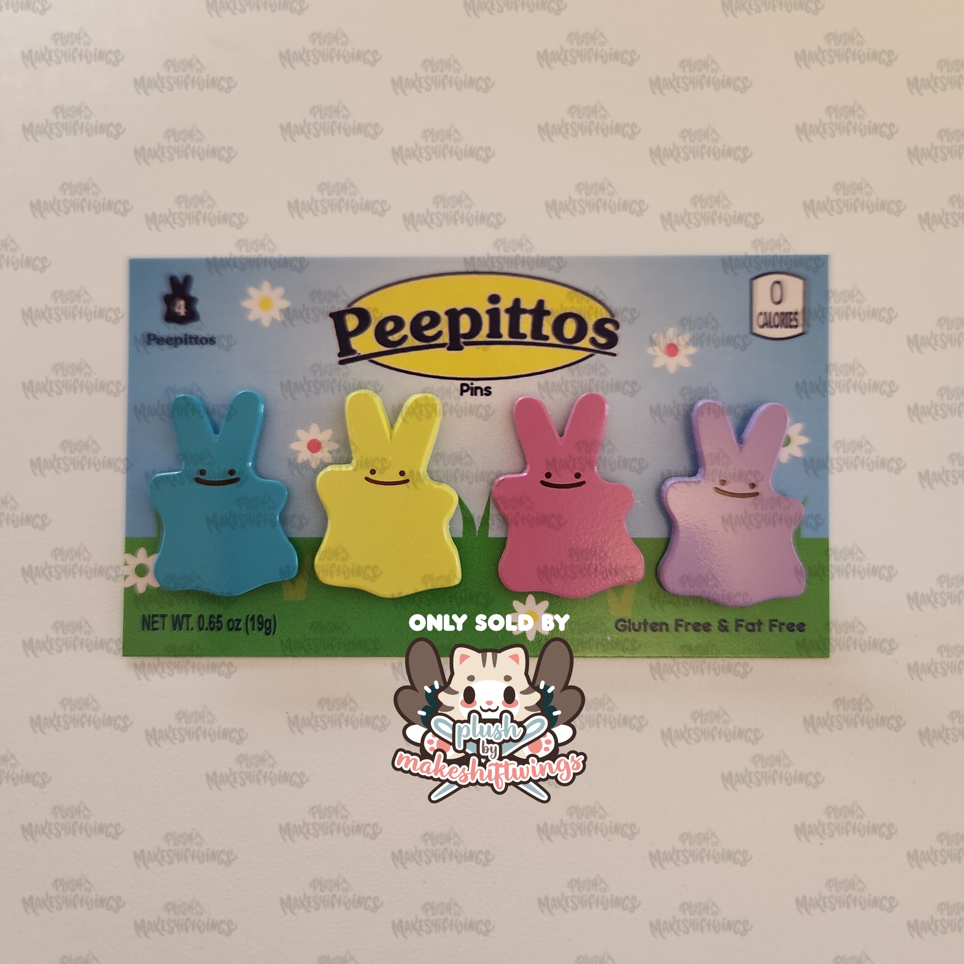 This is a full set of 4 mini peepitto pins! These are dyed enamel pins with a screen printed face. They are miniature pins at ~1" tall. They have a single post with a pink round rubber backing. The pins come on a themed backing card.