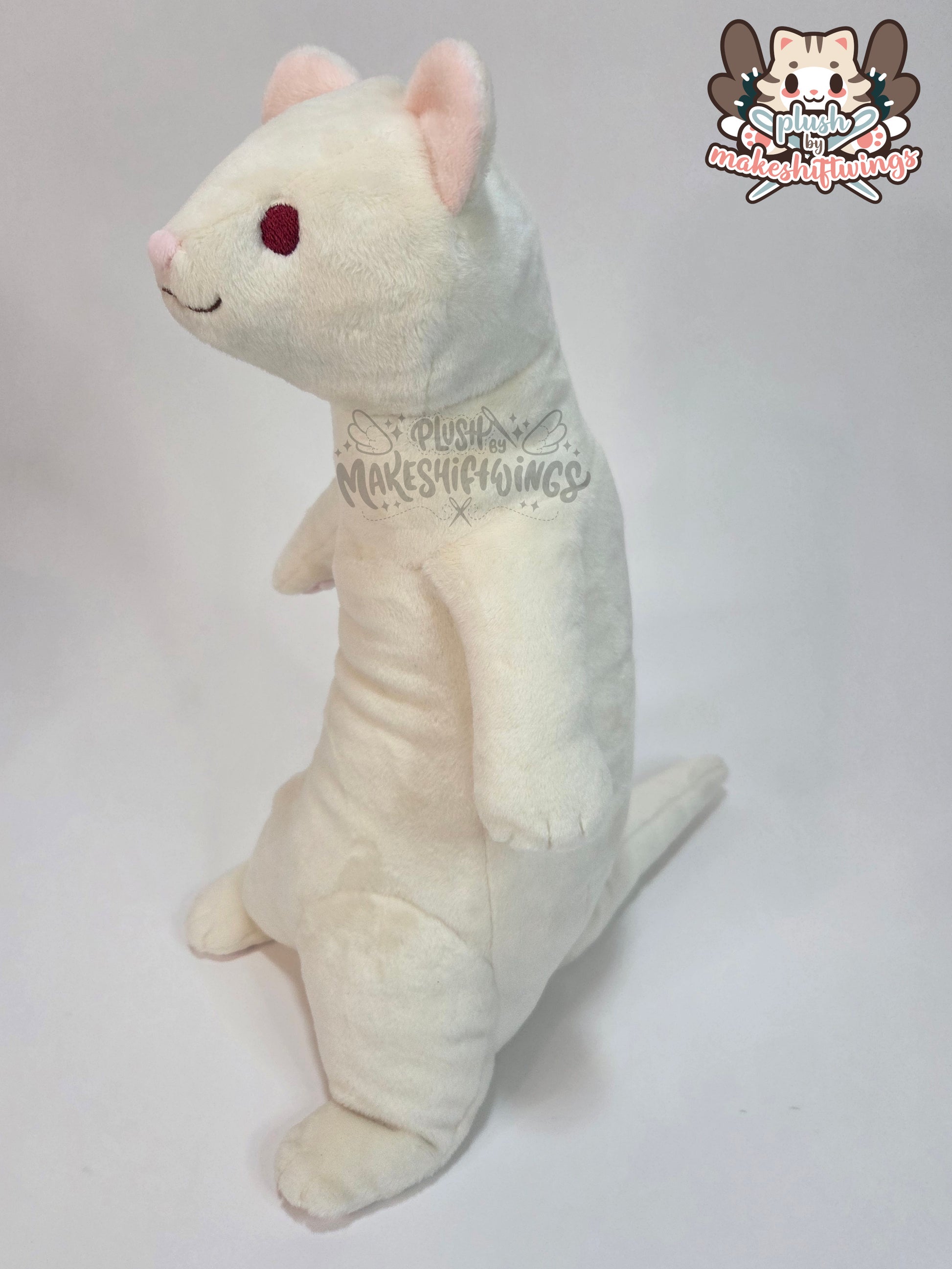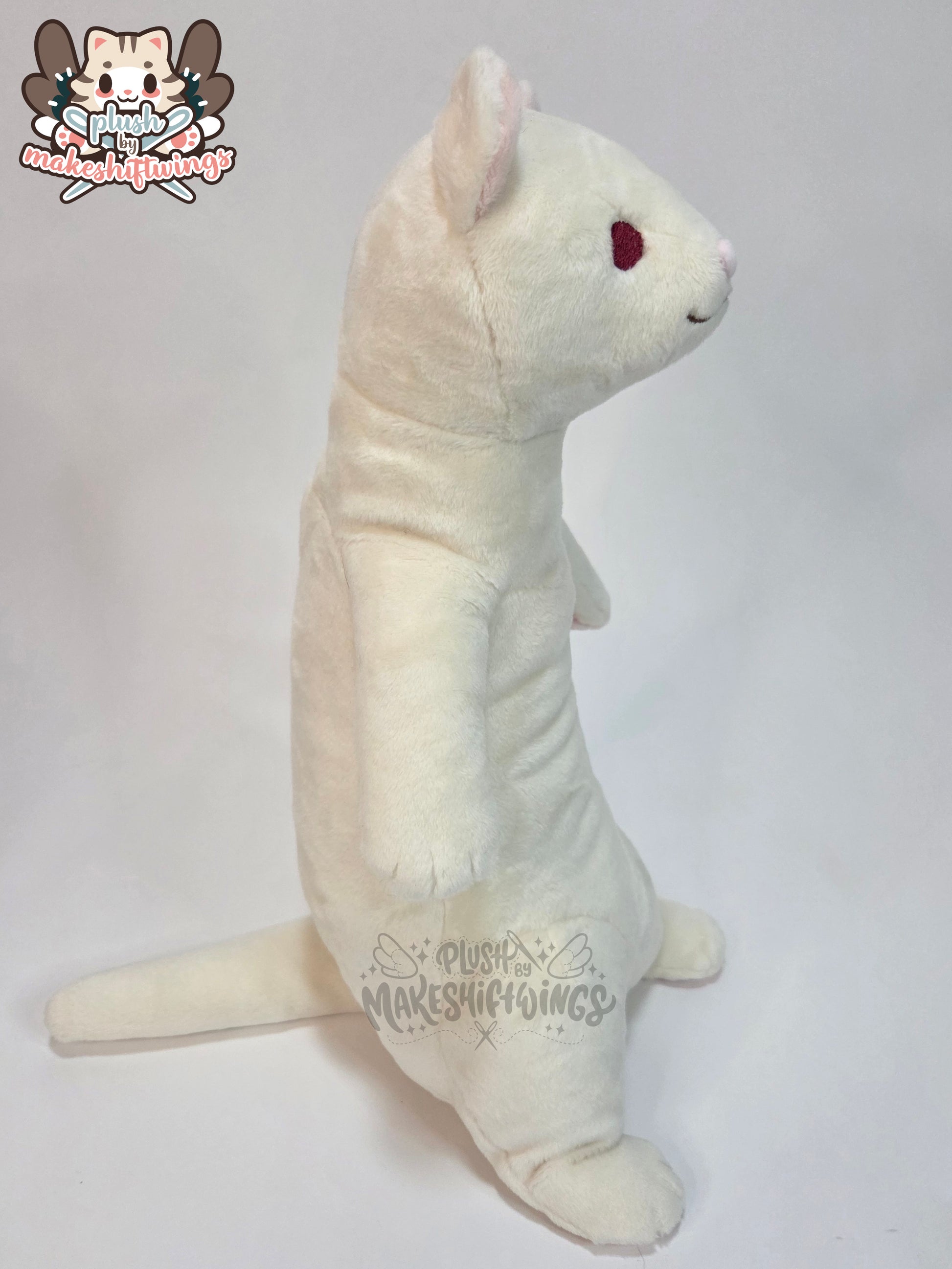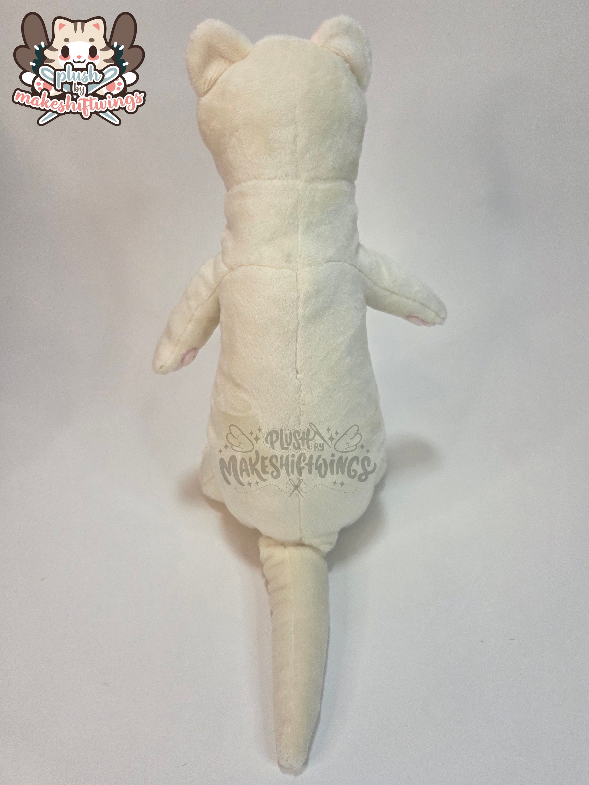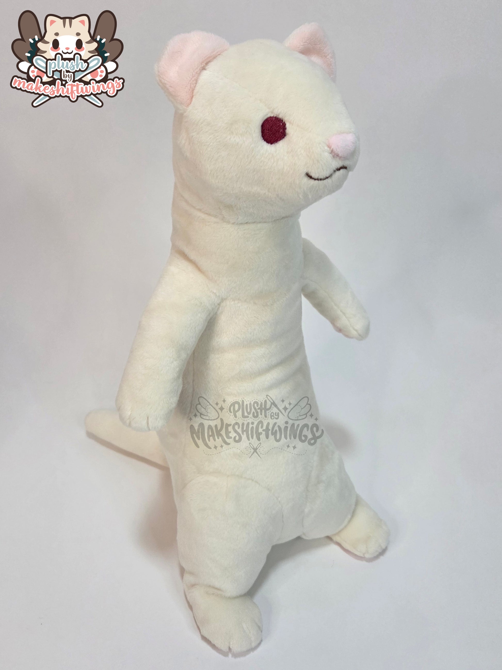 This ferret plush is made with a 3mm minky body and mochi minky paw pads. He has embroidered eyes and a fabric nose that is hand sewn on. The rest of the plush is machine sewn. Plush is approximately 12" tall without the hat.