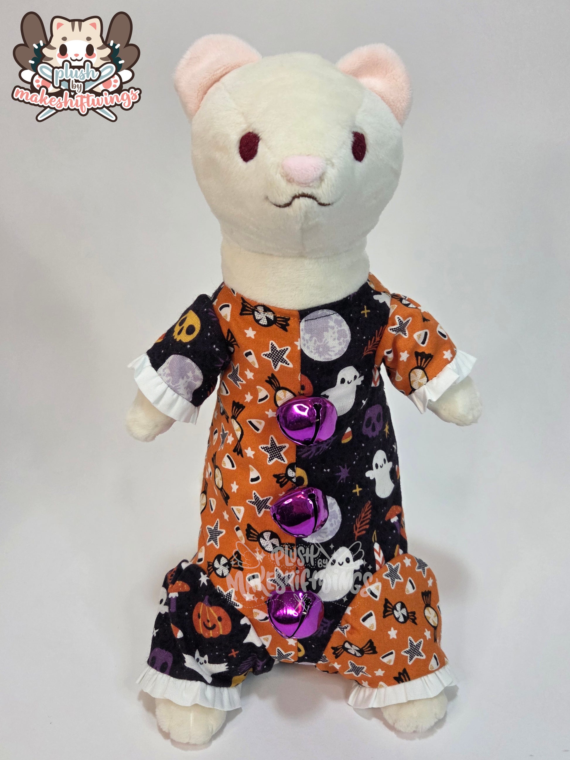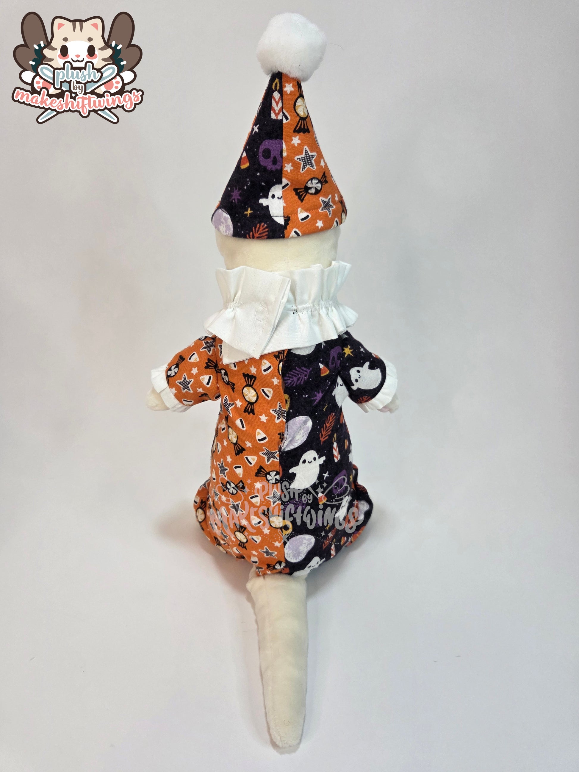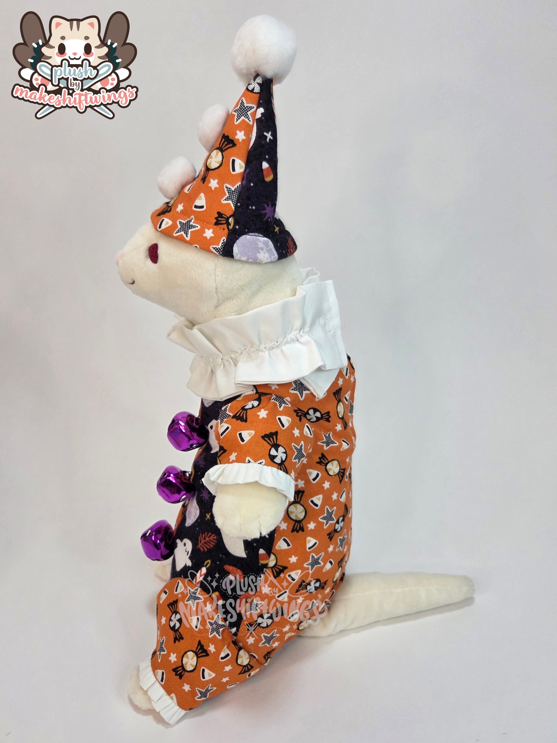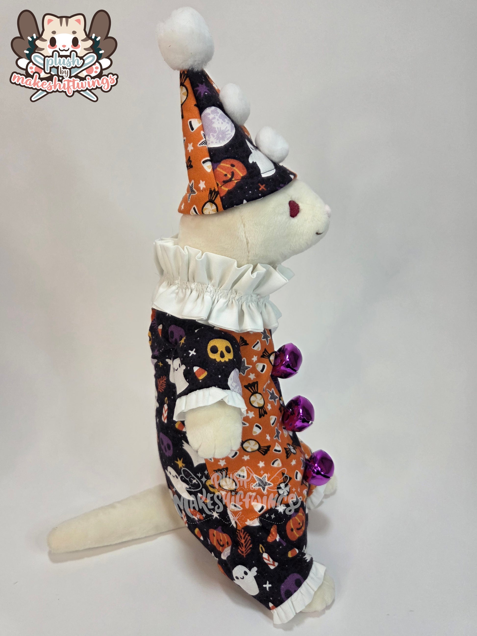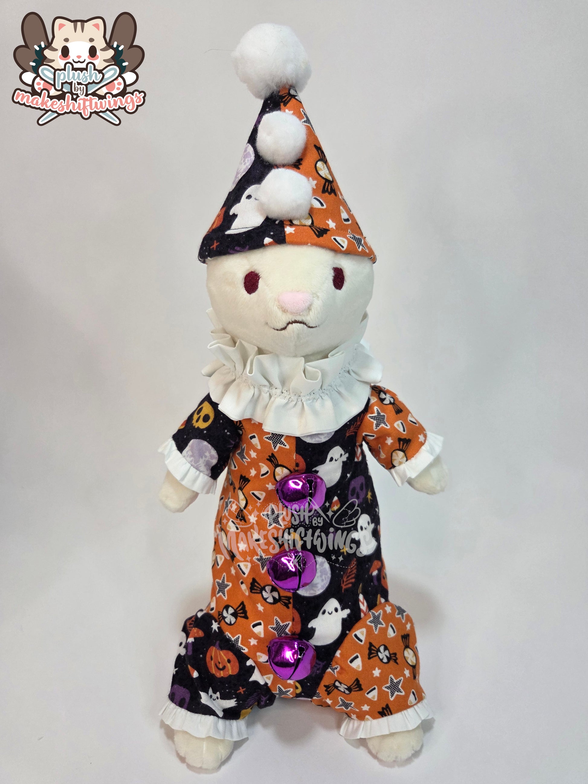 This plush comes with a removable cotton clown outfit that is halloween themed with purple bells on the romper and pom poms on the hat. The romper and collar close with snaps. The bells and pom poms are hand sewn on.
