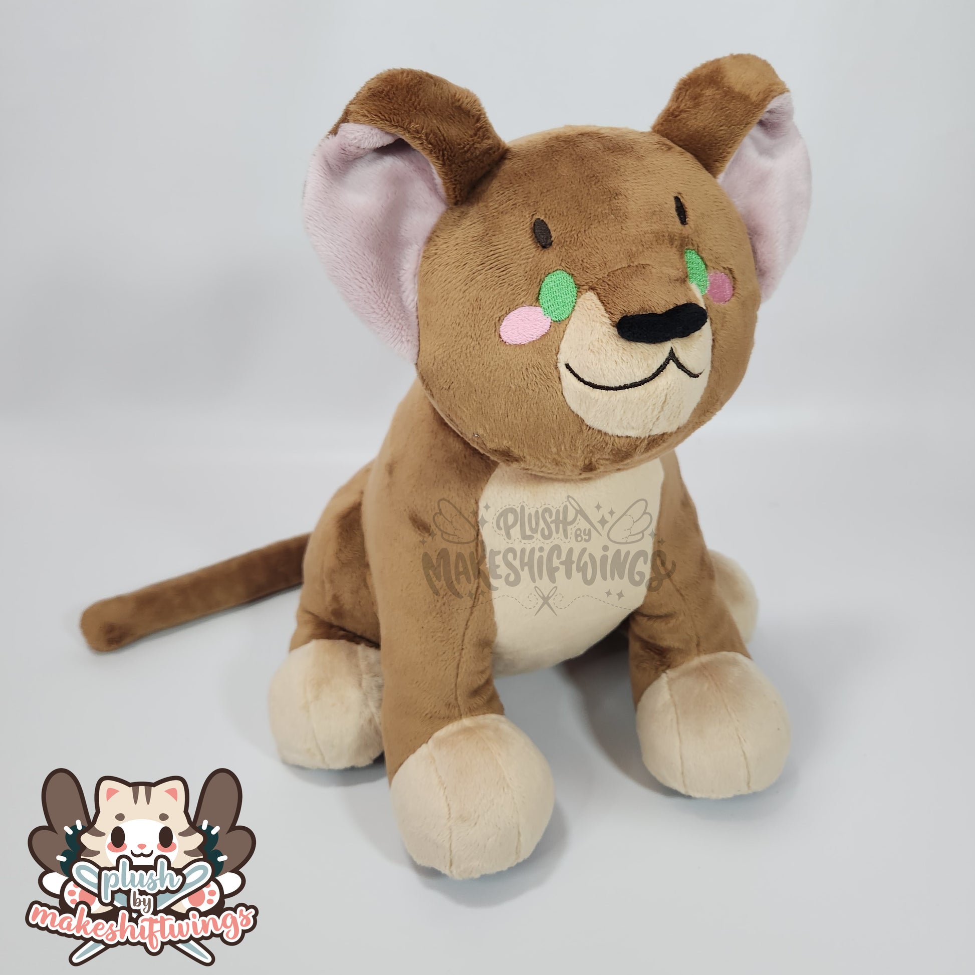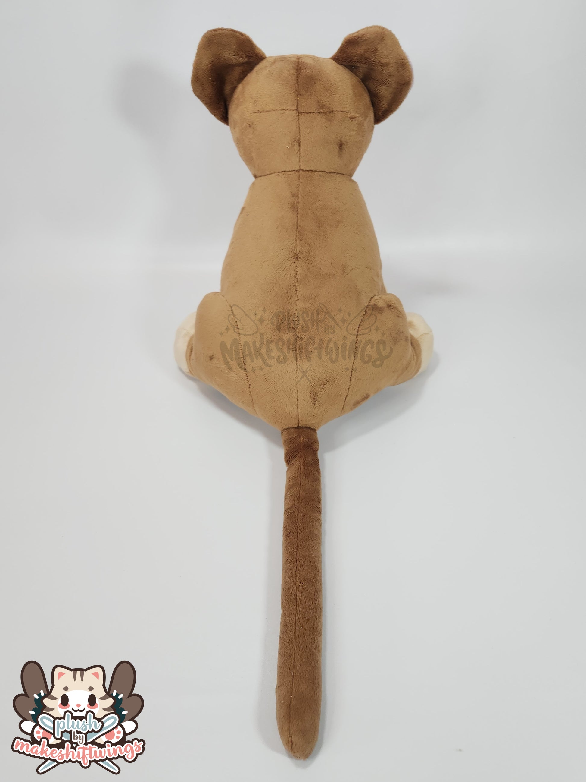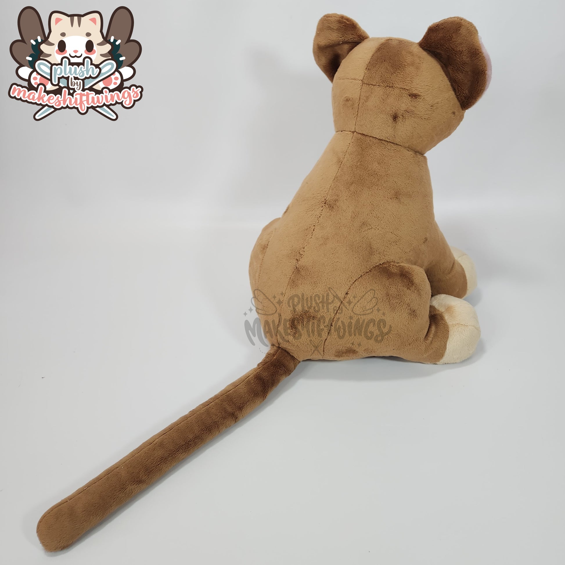 This is a lion cub plush made from minky with puffy mochi minky paw pads and a mochi minky nose. He has embroidered eyes and an embroidered mouth. He is ~13" tall and entirely machine sewn, except for his nose which is hand sewn on.