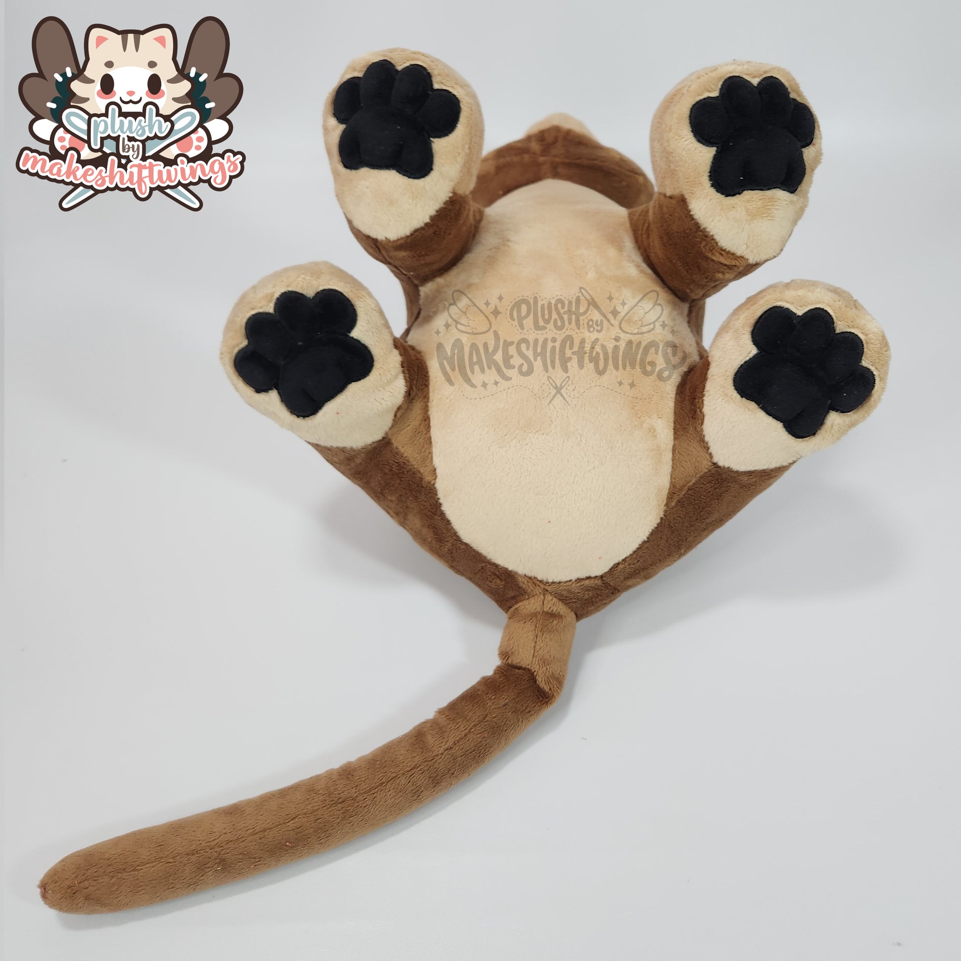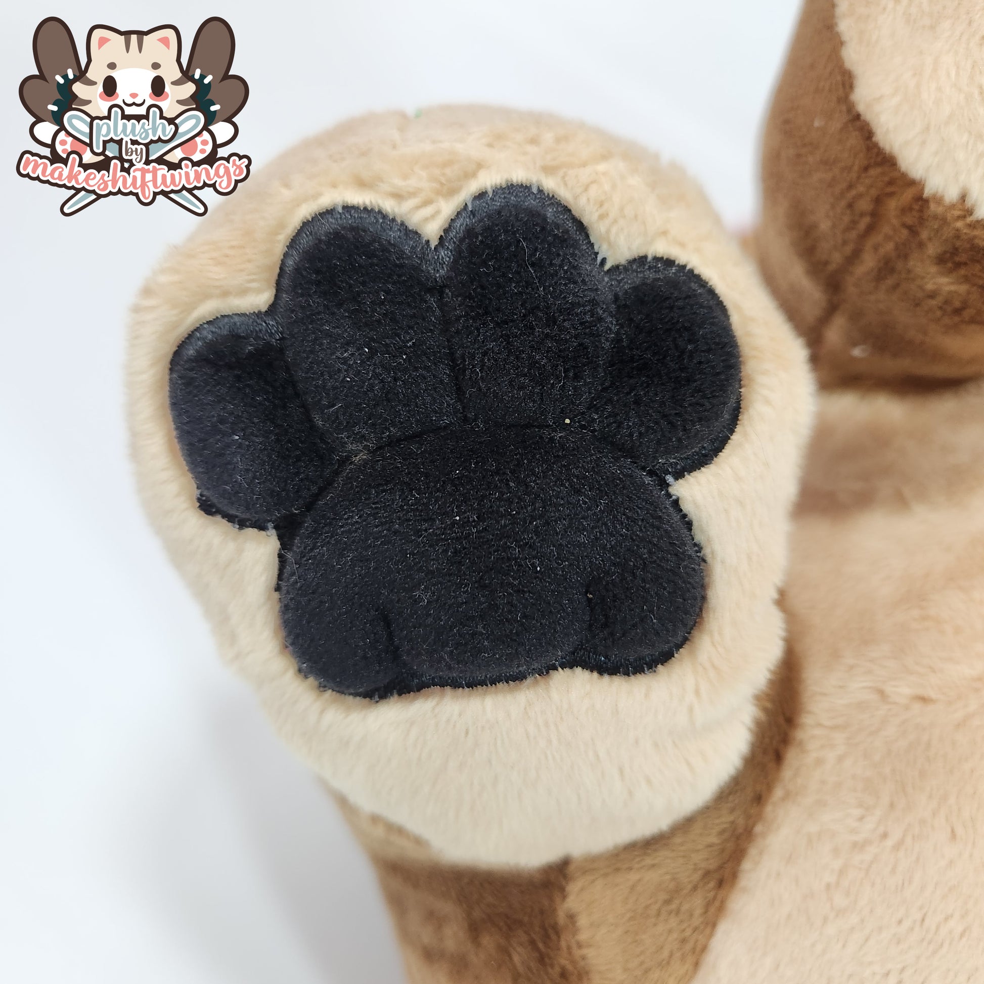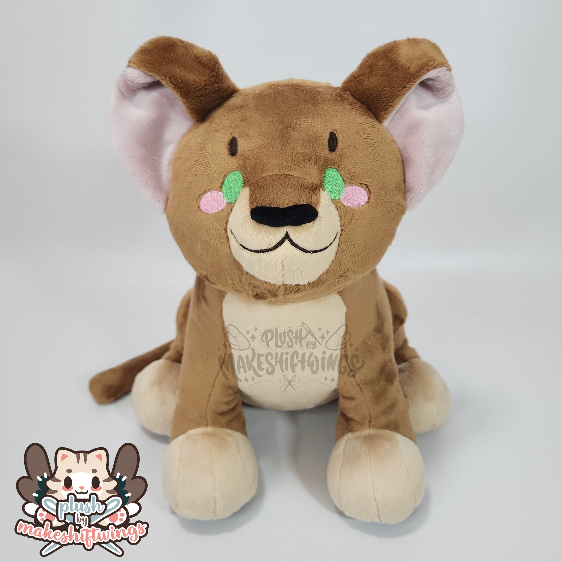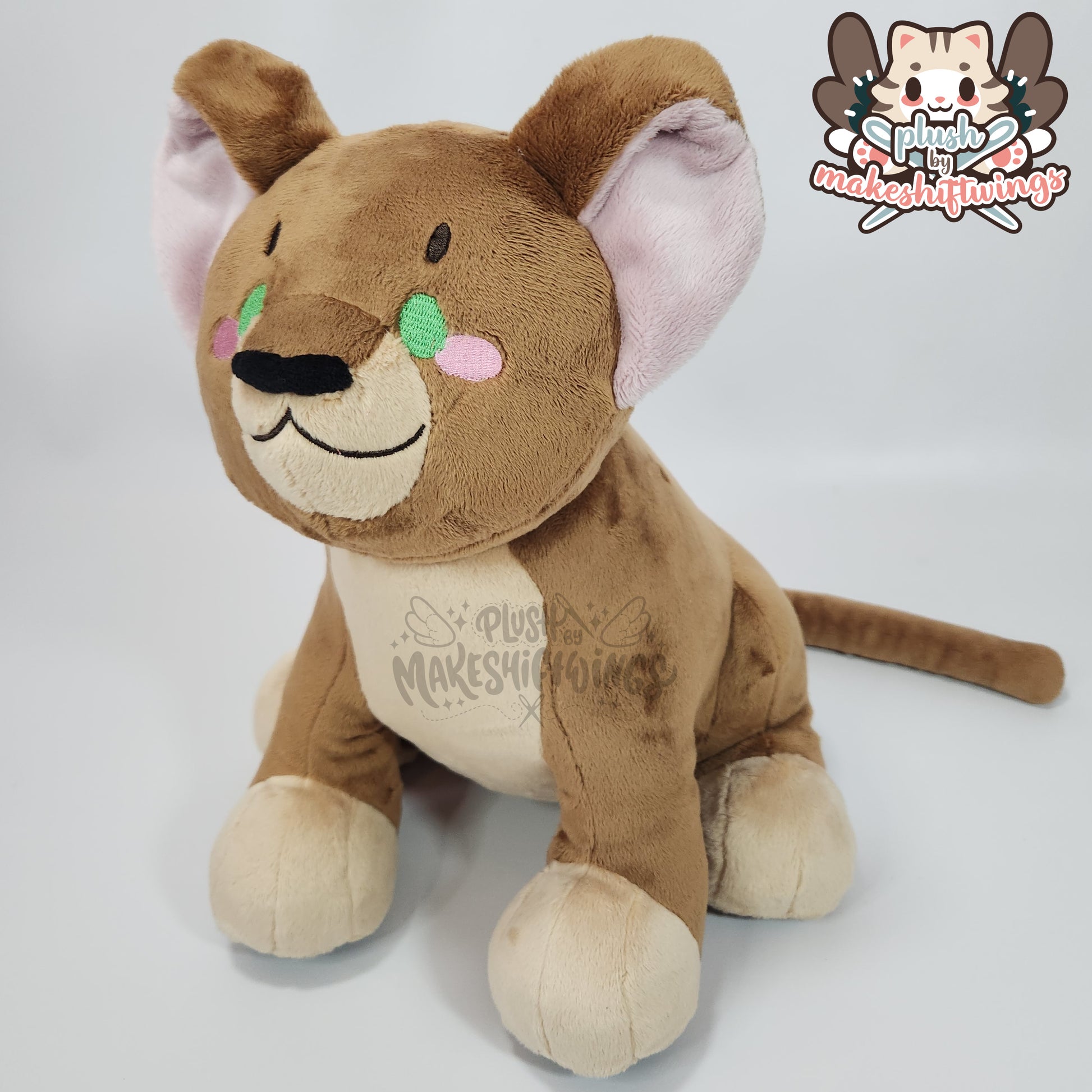 This is a lion cub plush made from minky with puffy mochi minky paw pads and a mochi minky nose. He has embroidered eyes and an embroidered mouth. He is ~13" tall and entirely machine sewn, except for his nose which is hand sewn on.