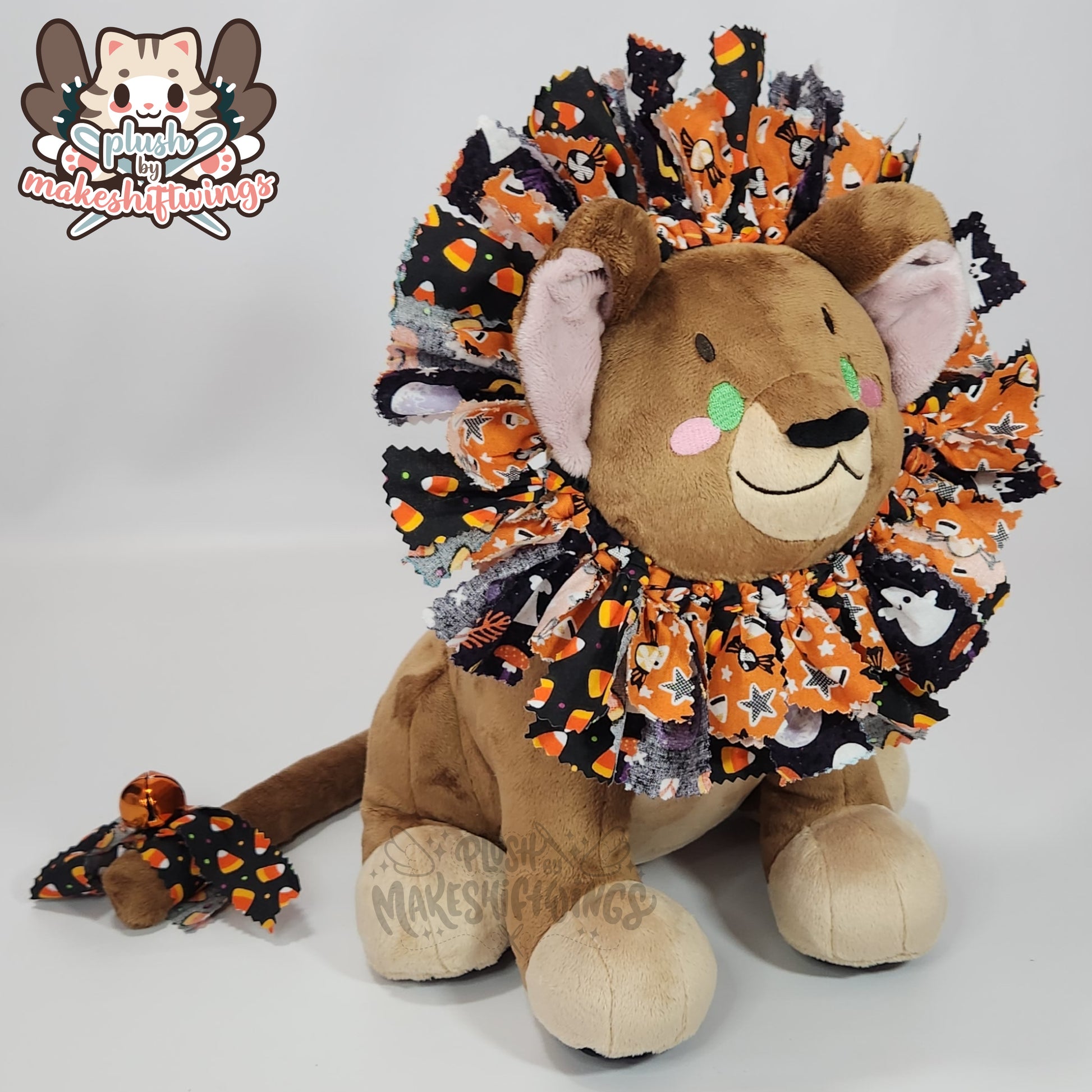 He comes with a removable fabric wreath mane with Halloween quilting cotton. While the quilting fabrics were cut with pinking shears to reduce it, excess handling of the manes can cause them to fray.