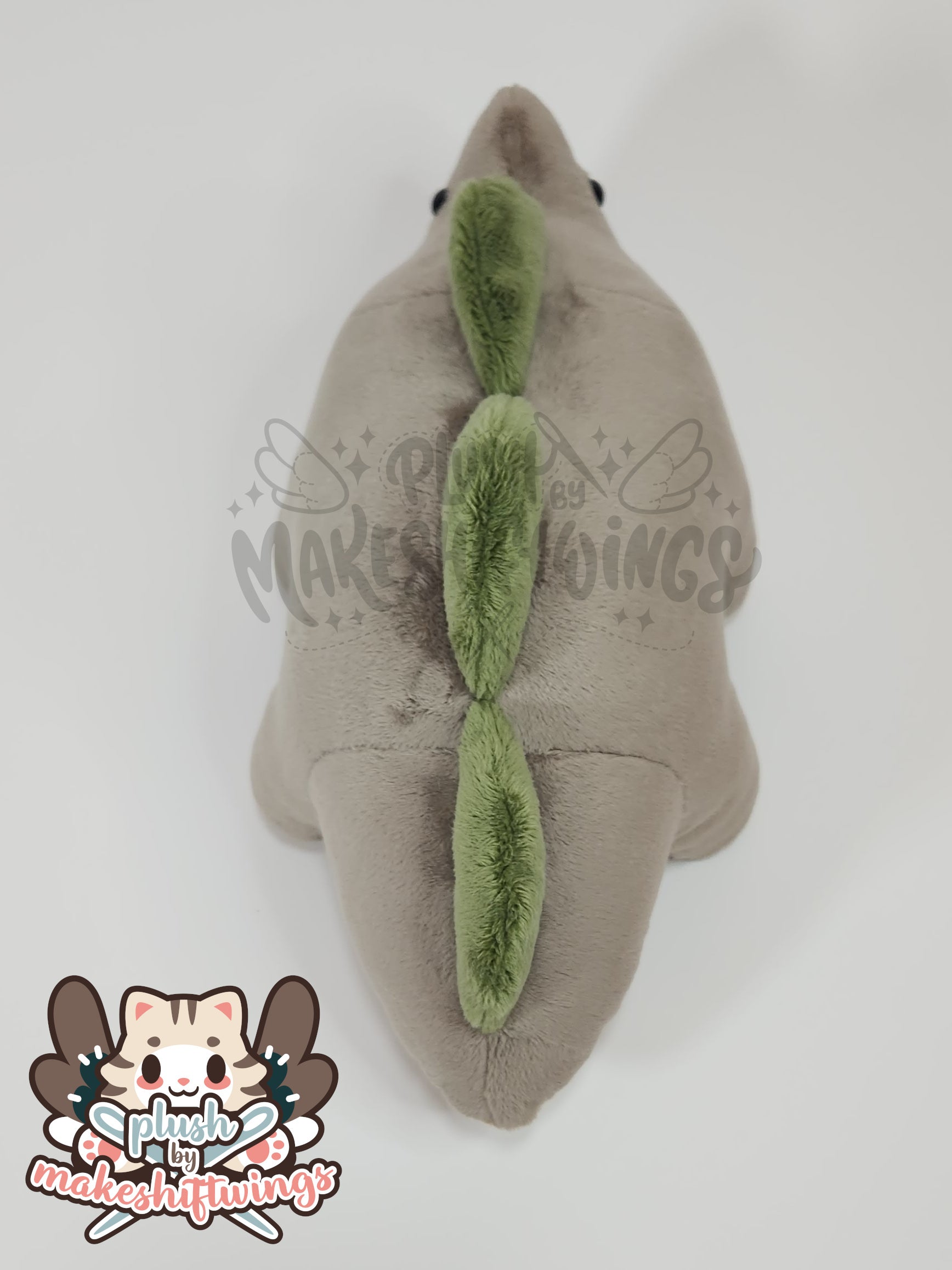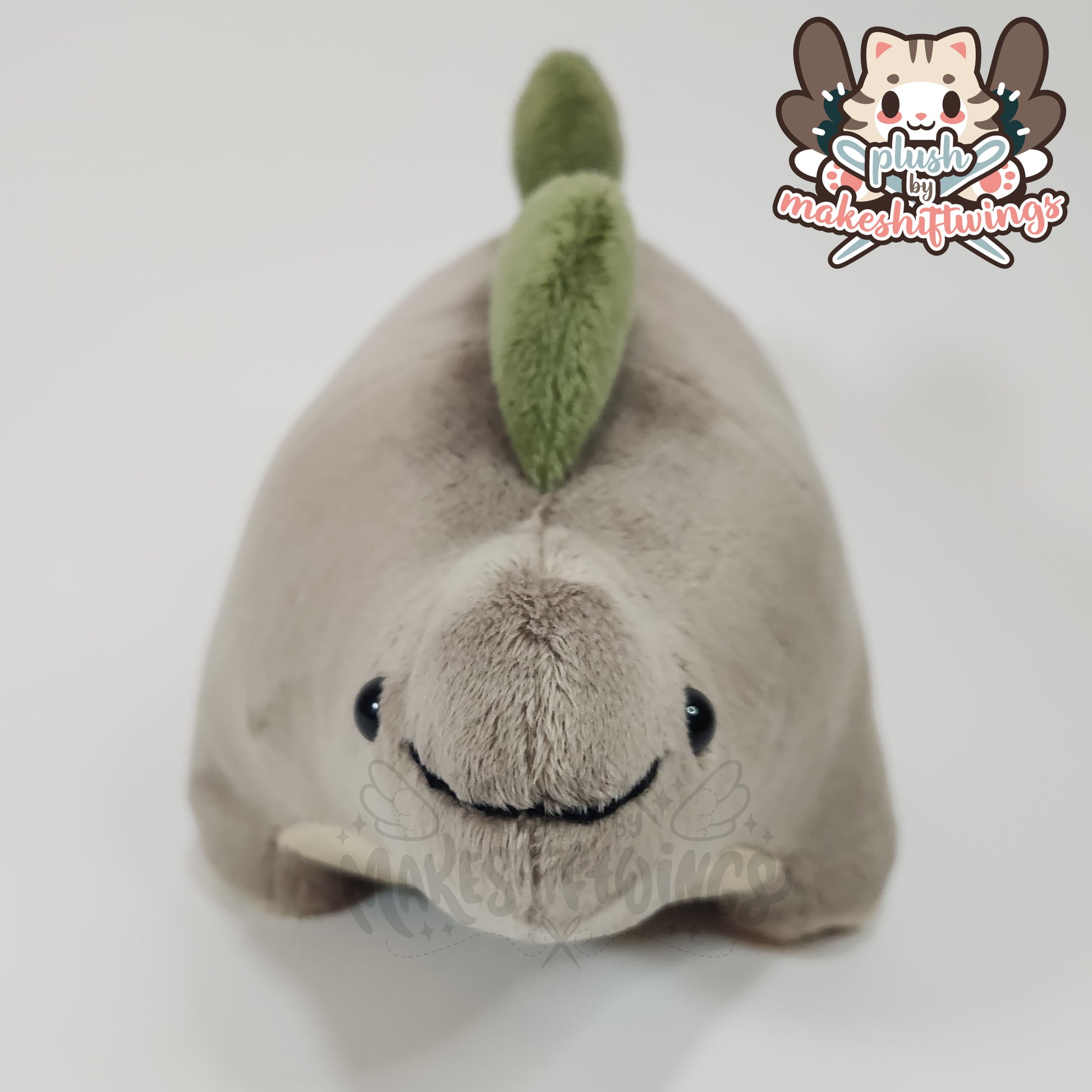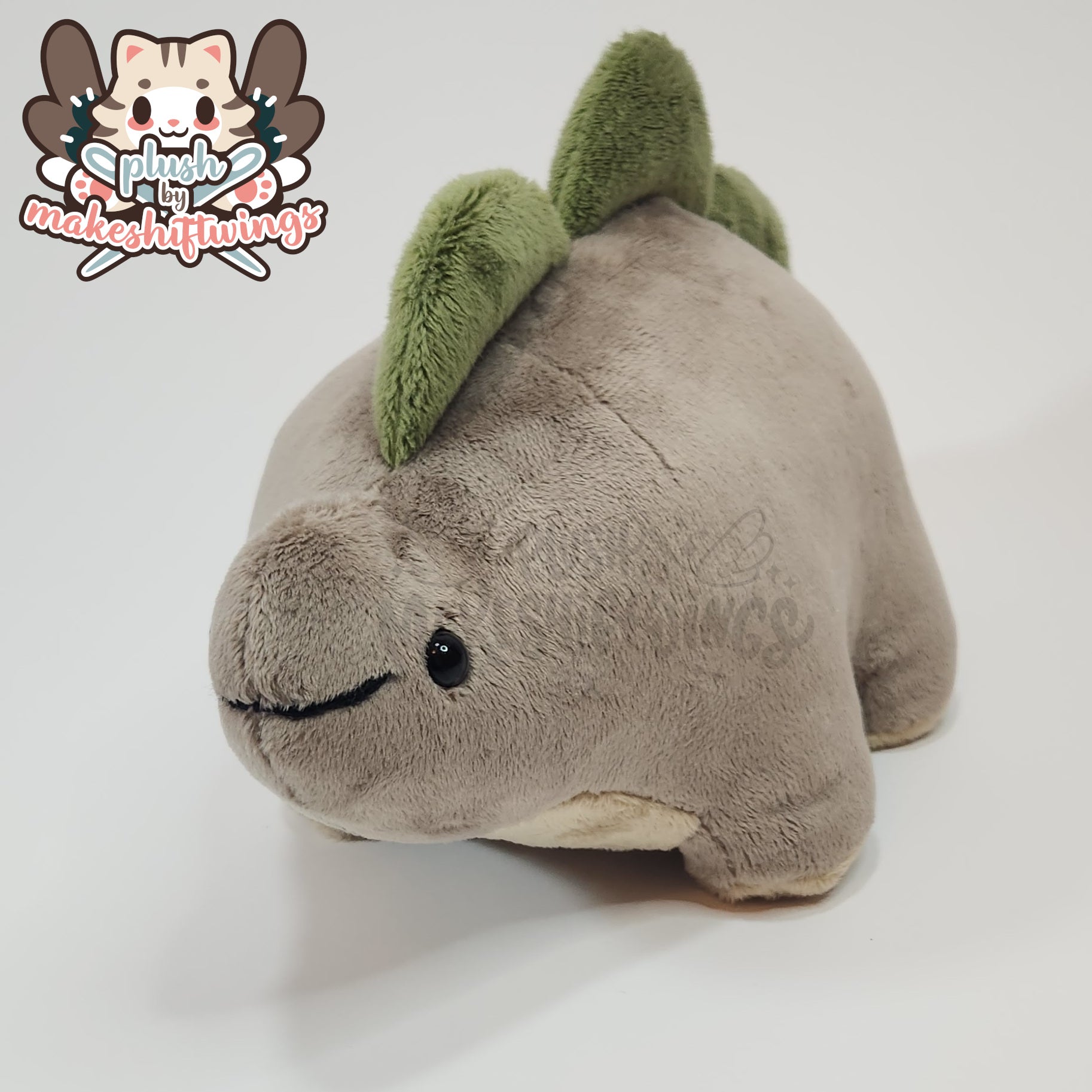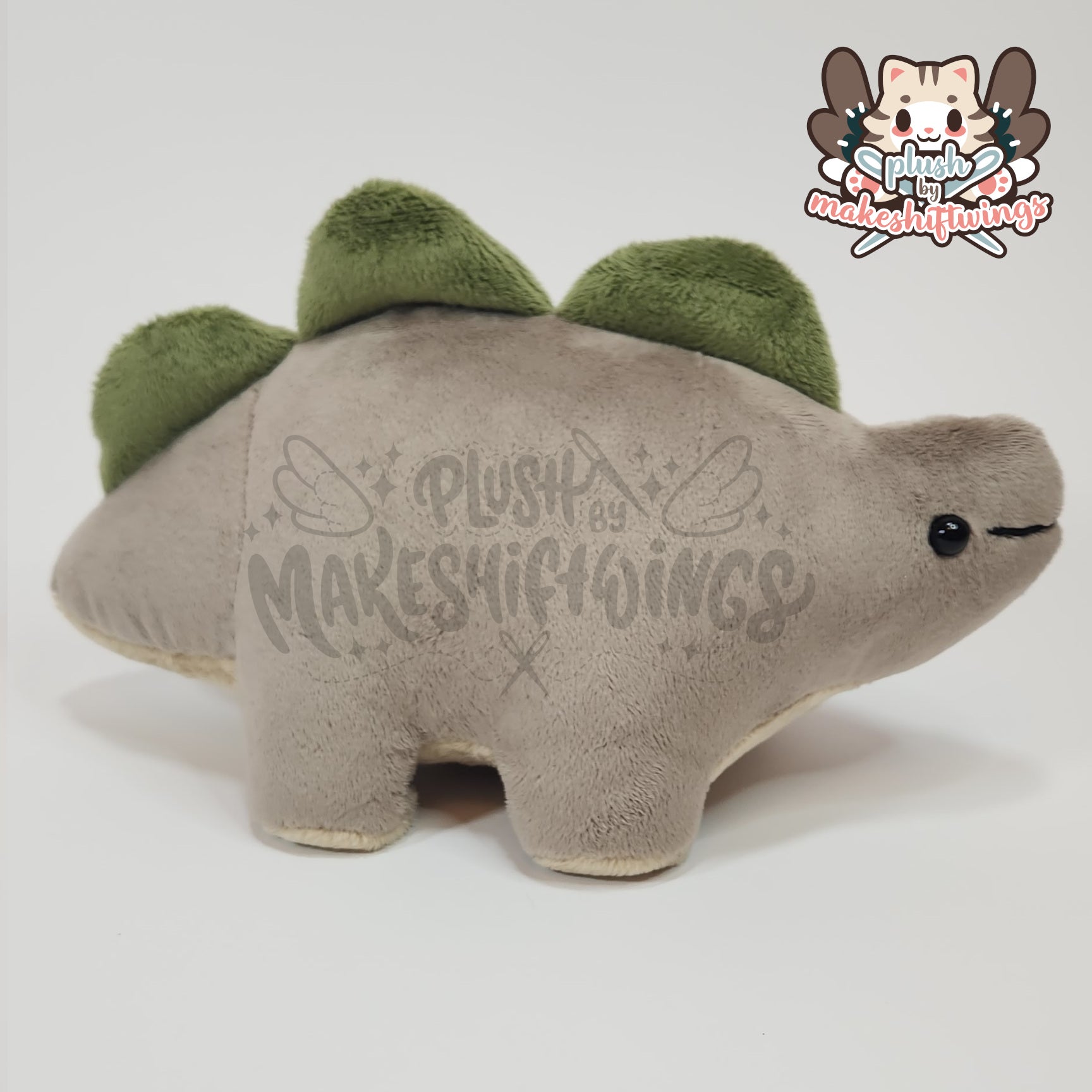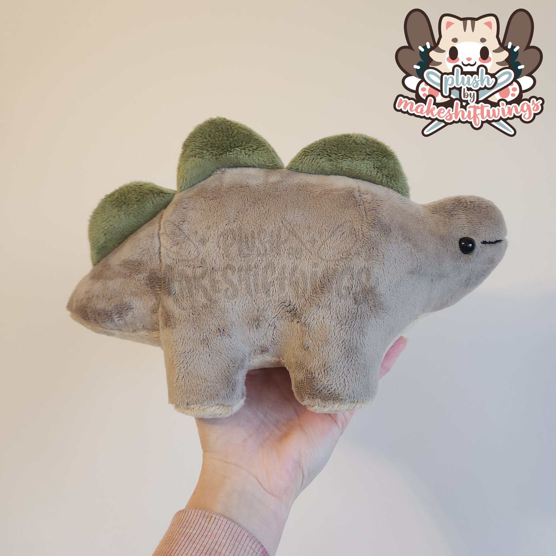 This stegosaurus plush is made from Shannon 3mm minky with safety eyes and a hand stitched mouth. It is about 5" tall.