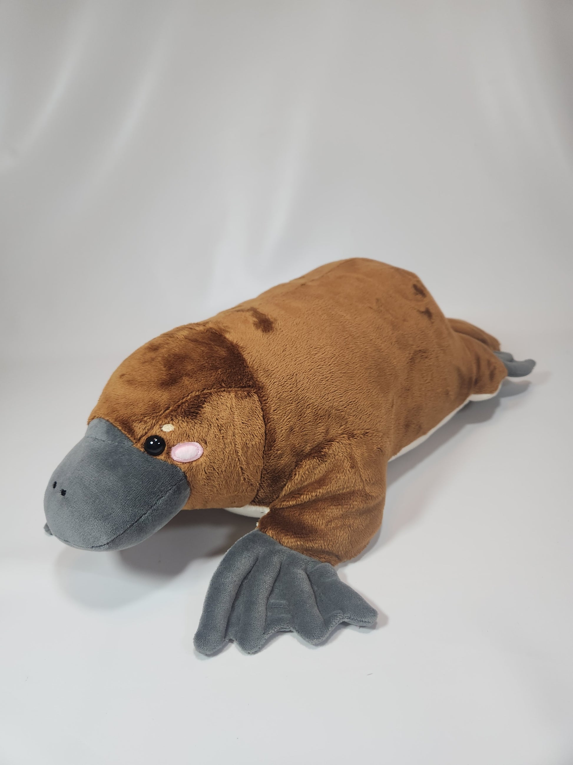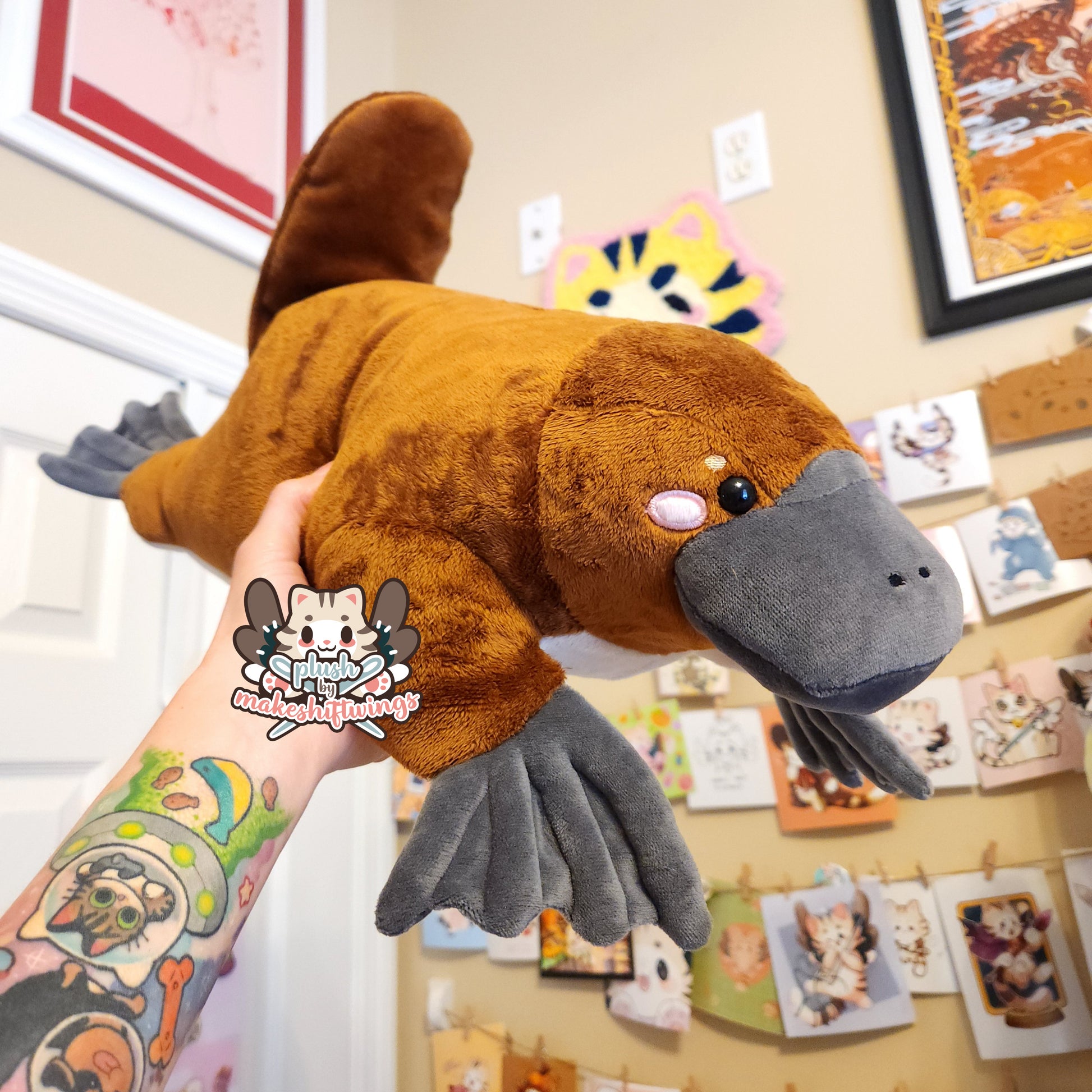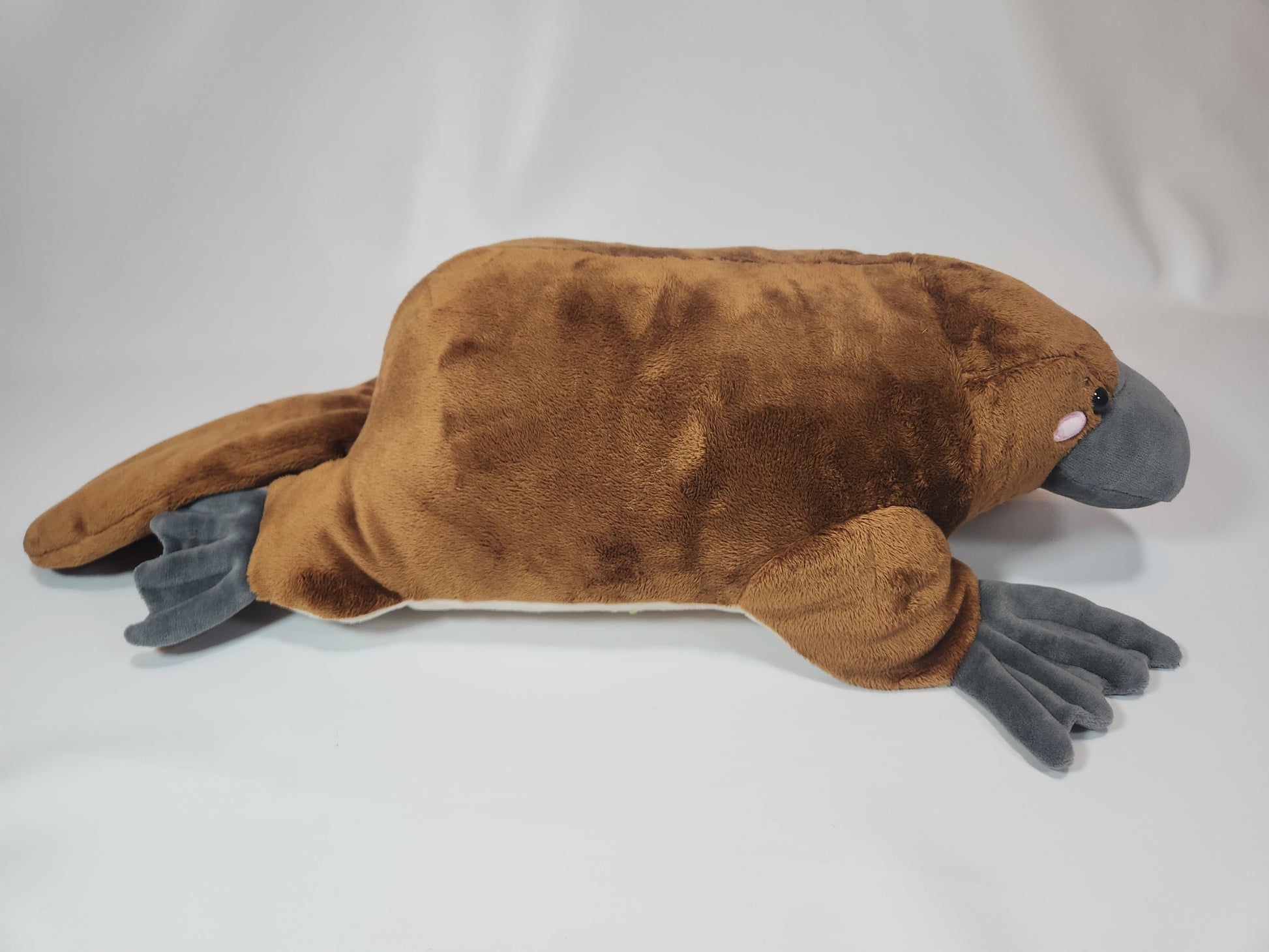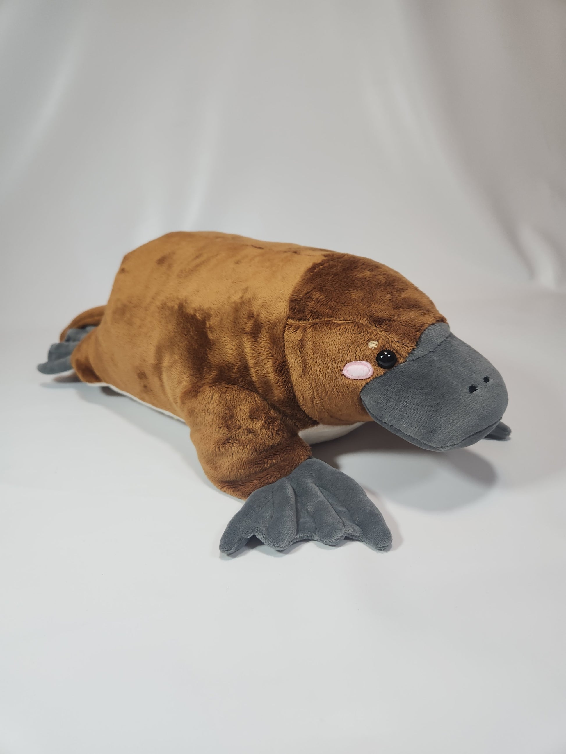 This is a platypus plush made from 3mm minky and mochi minky. He has plastic safety eyes, applique blush, and embroidered ear slits. He is about 20" long and stuffed with mochi stuffing, so he is very soft! Entirely machine sewn.