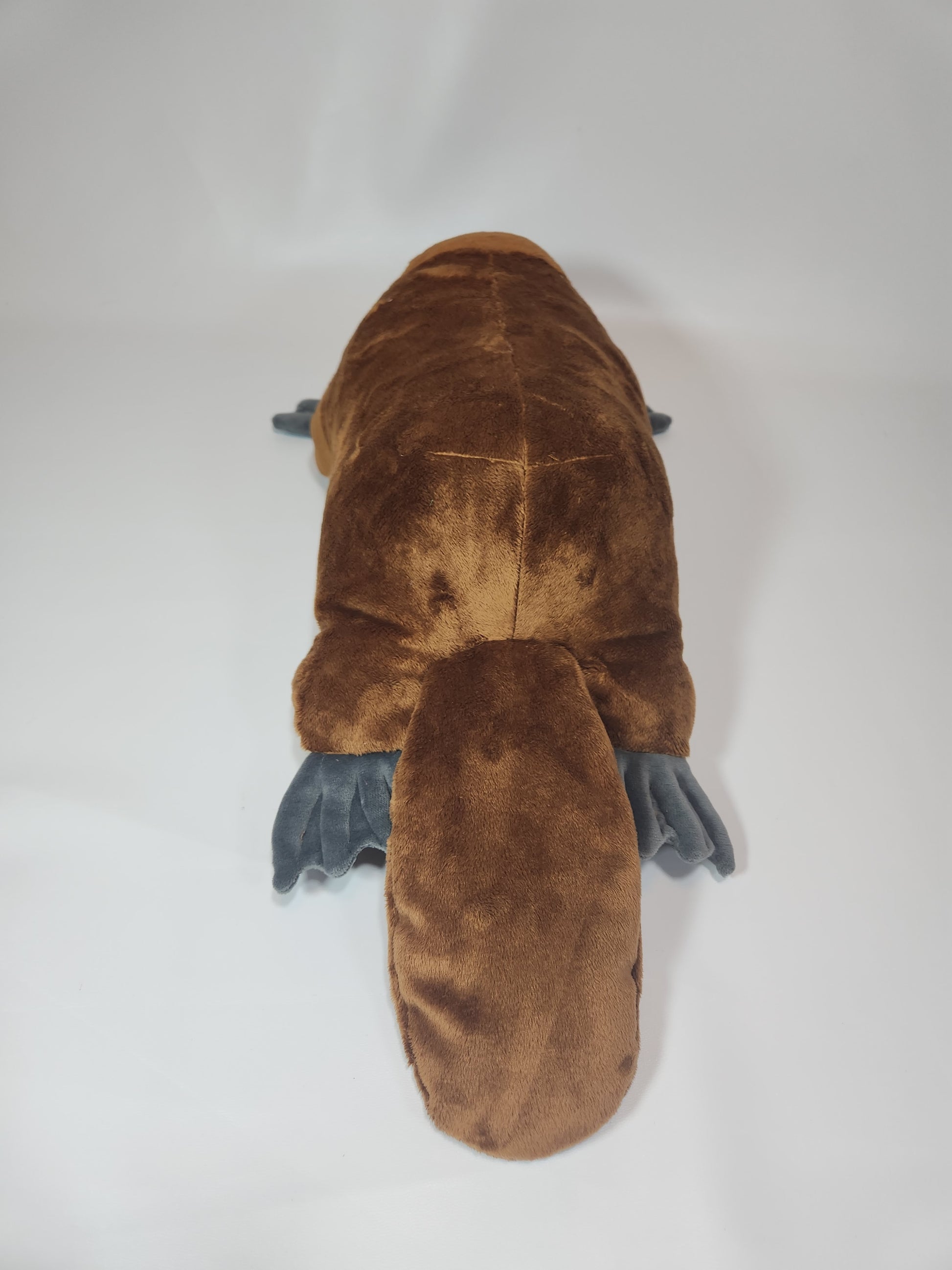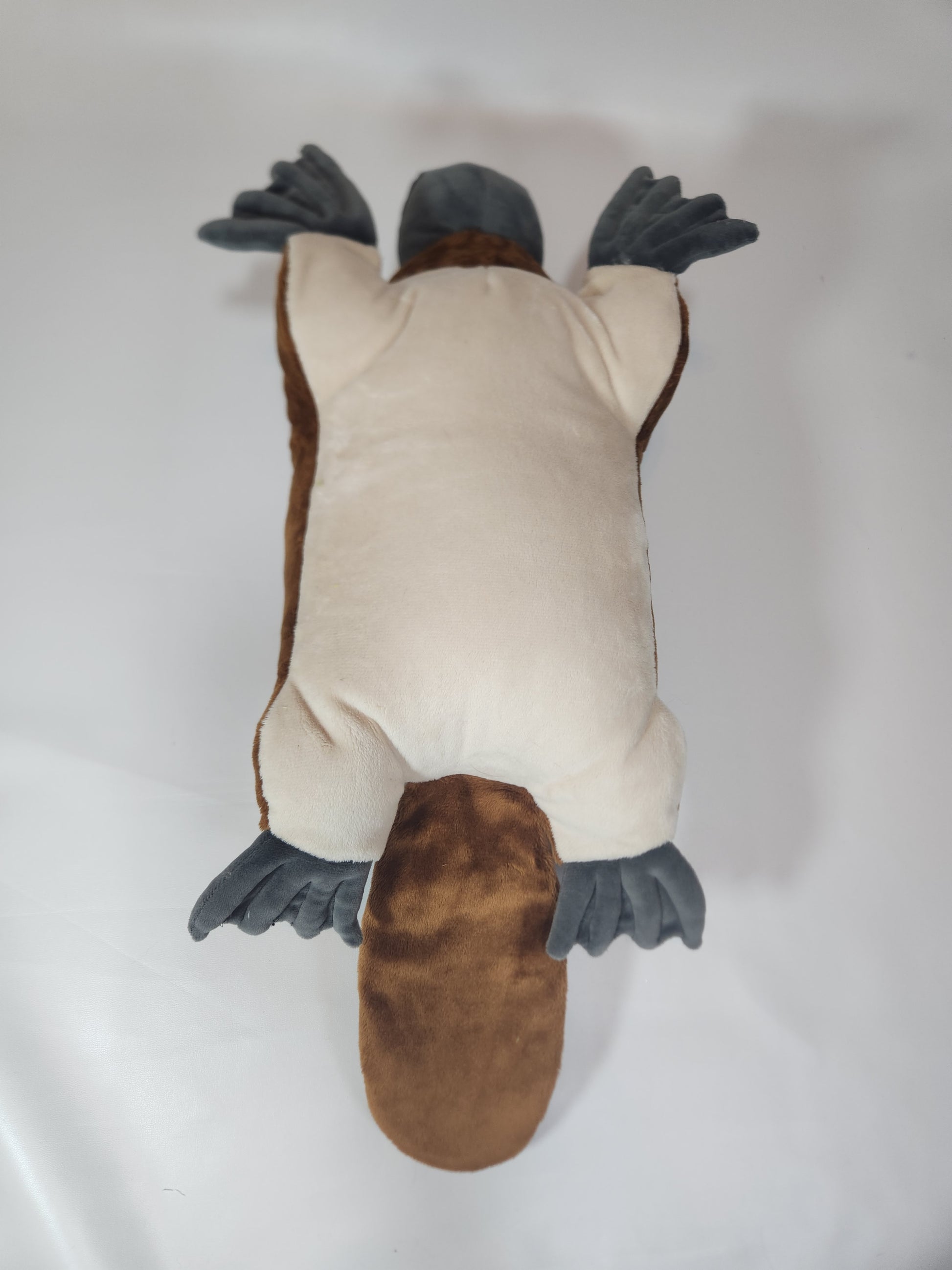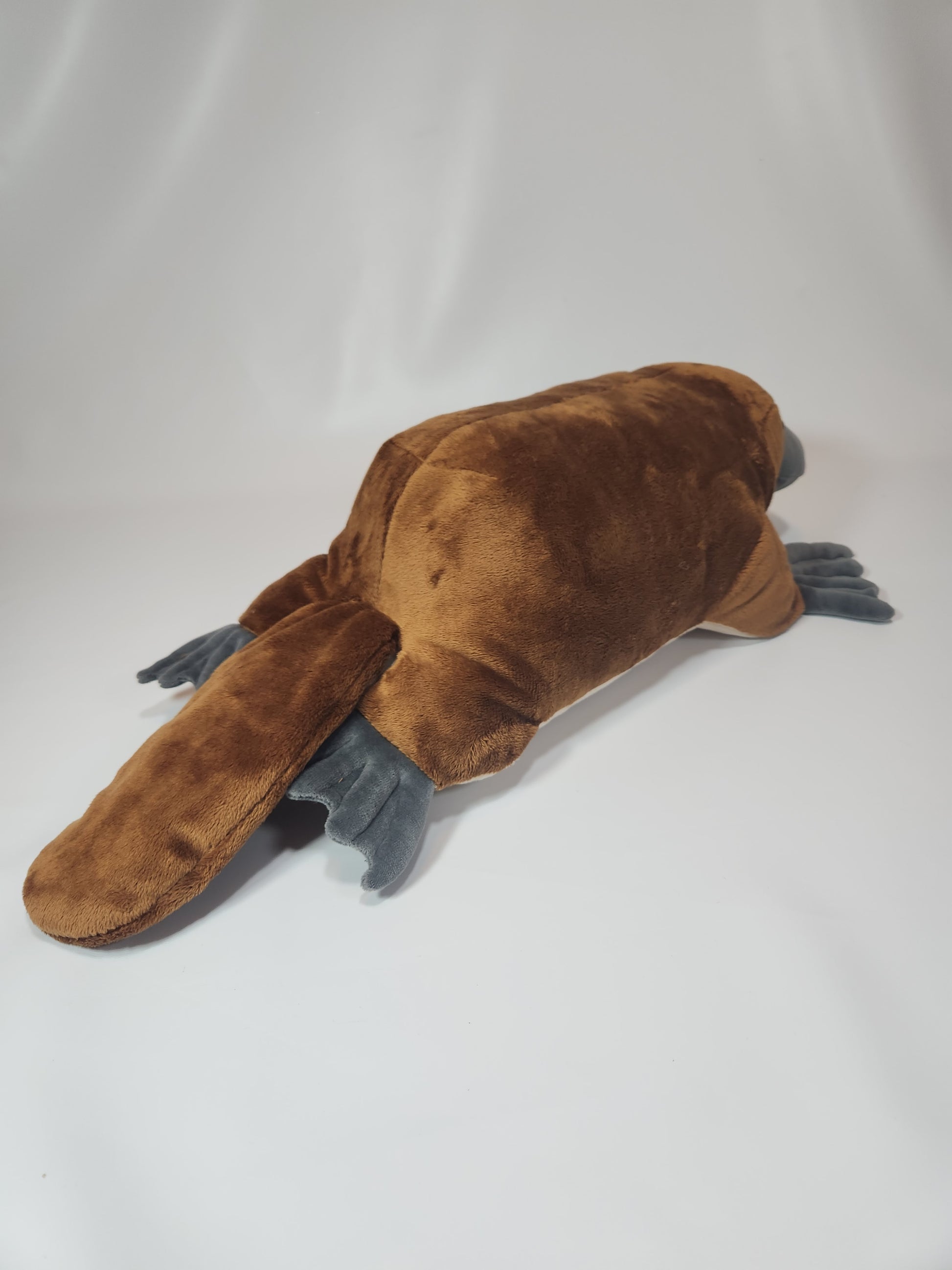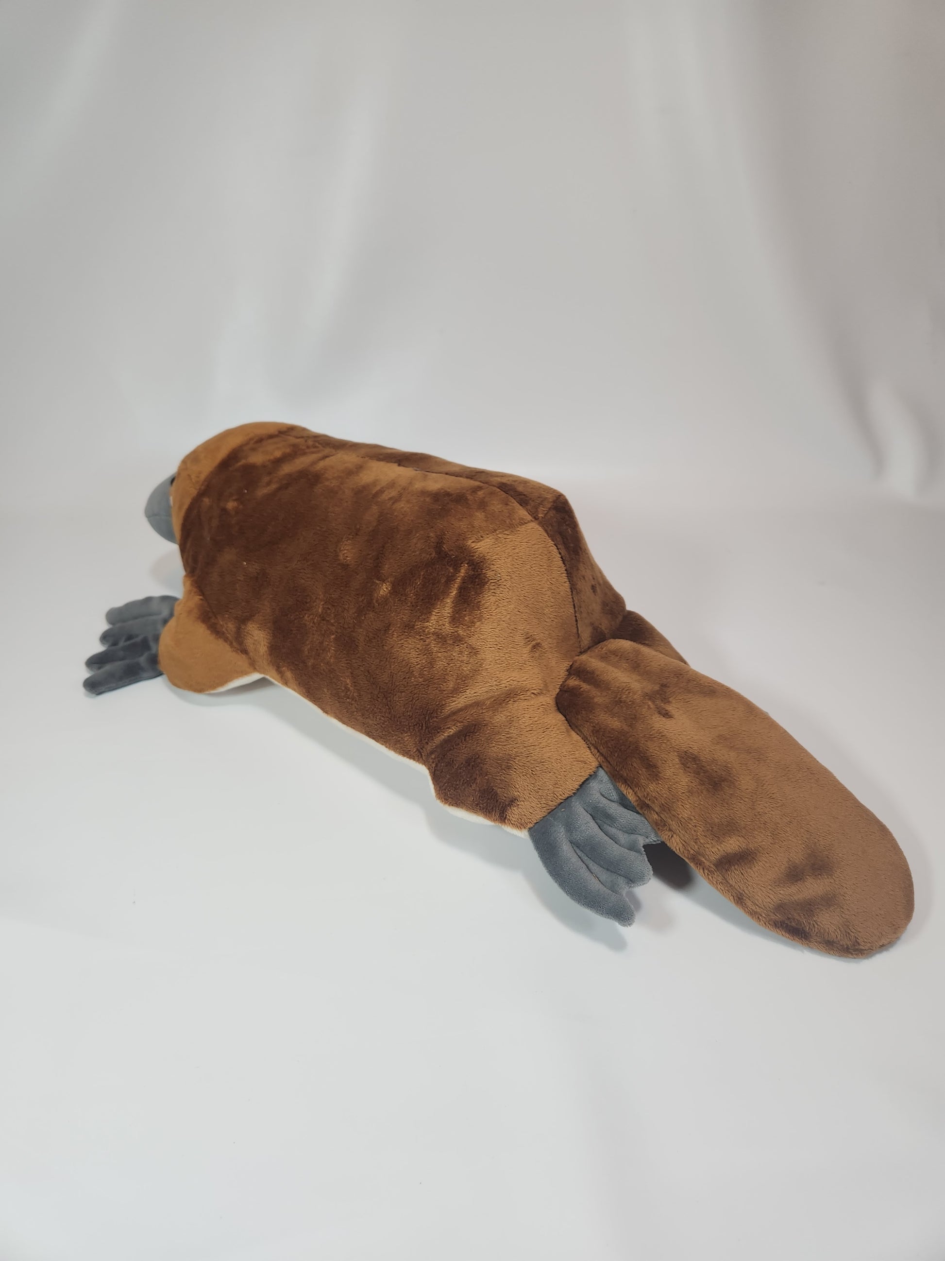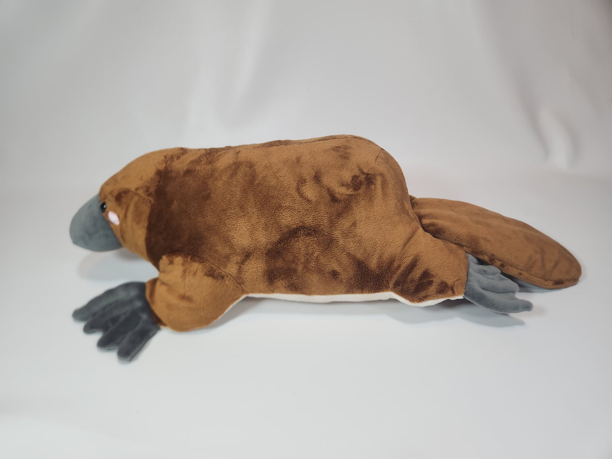 This is a platypus plush made from 3mm minky and mochi minky. He has plastic safety eyes, applique blush, and embroidered ear slits. He is about 20" long and stuffed with mochi stuffing, so he is very soft! Entirely machine sewn.