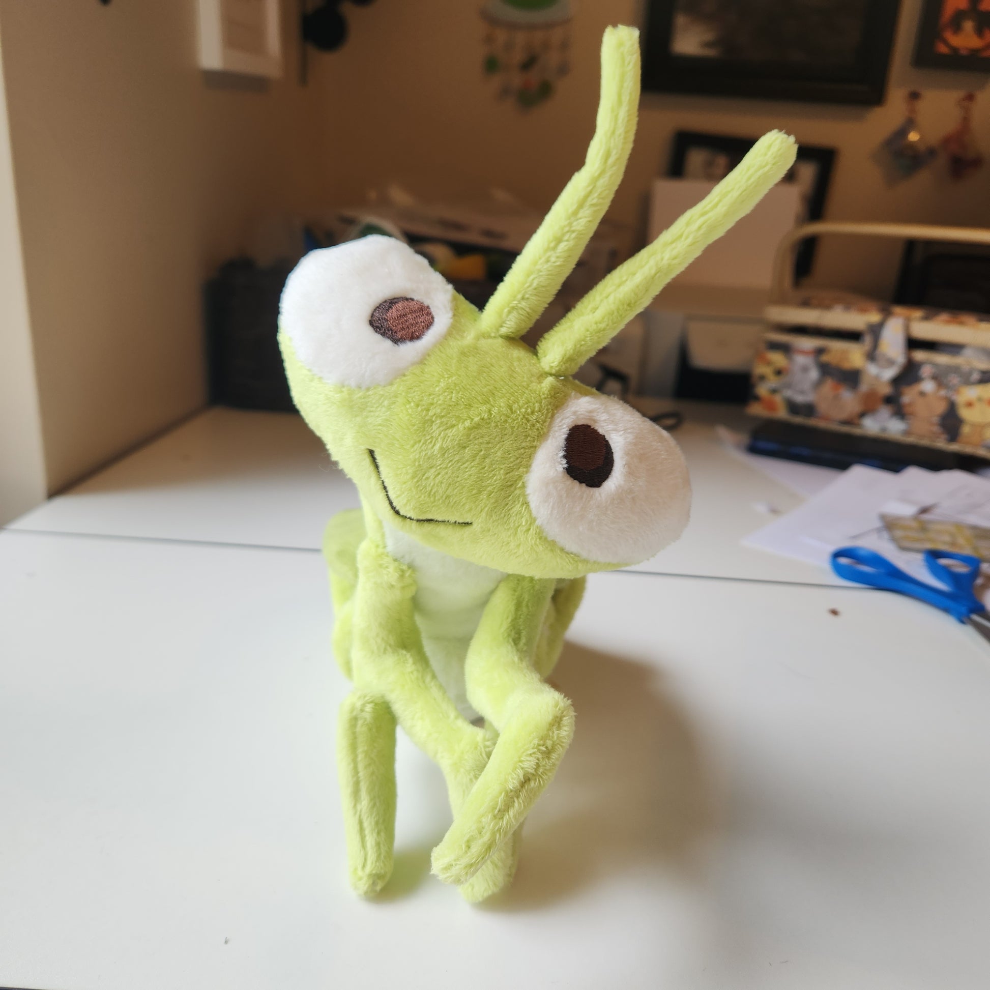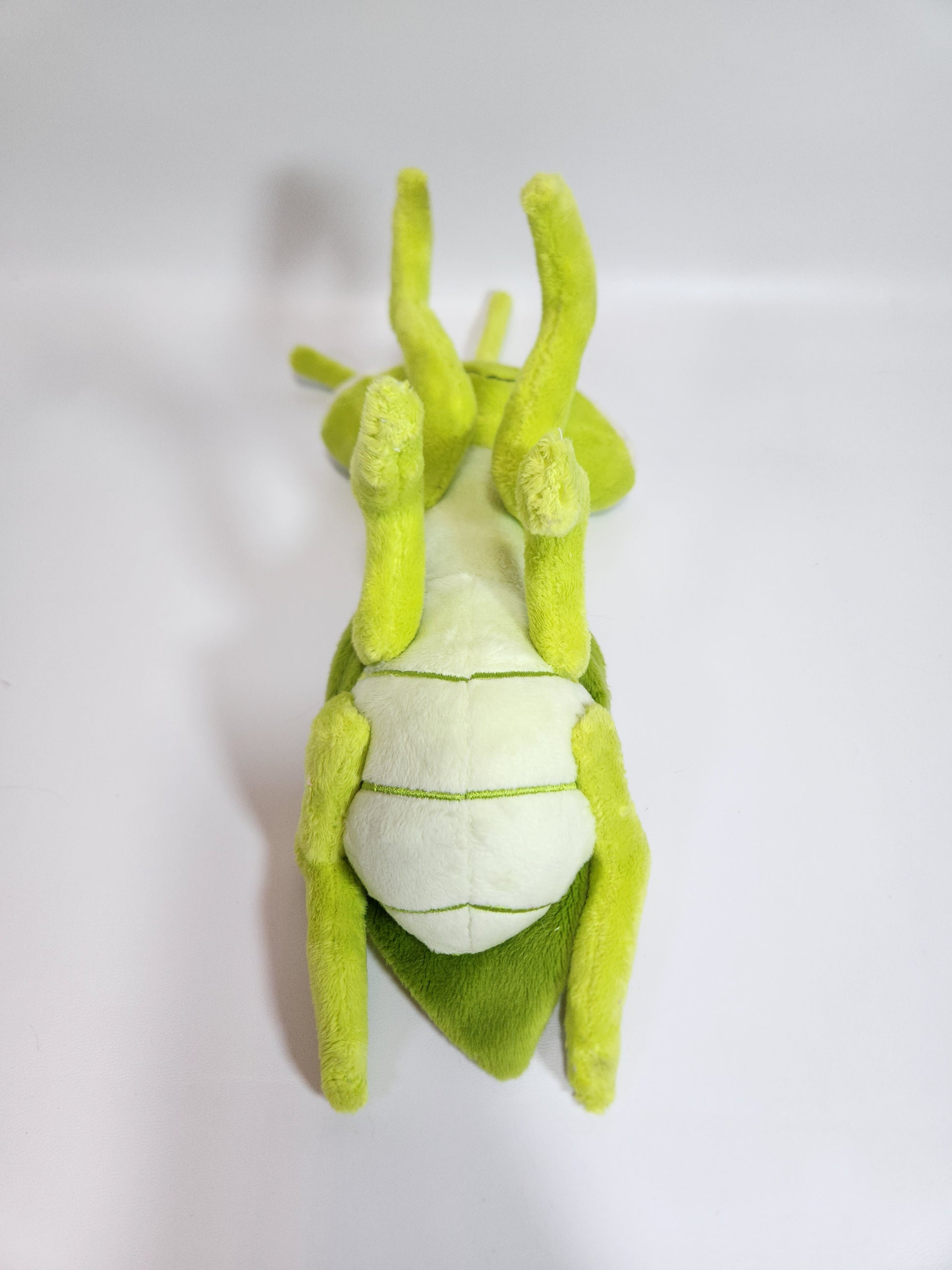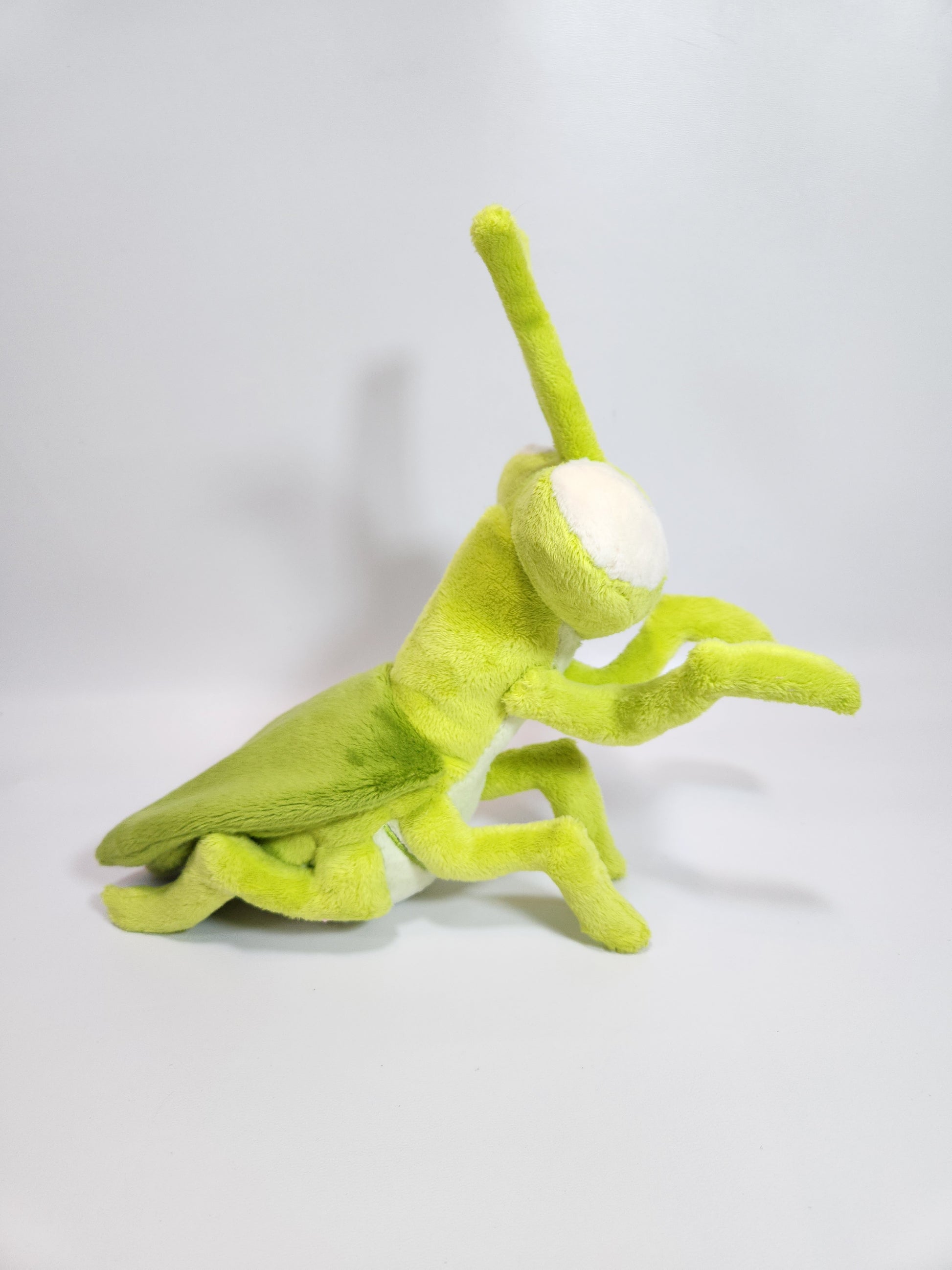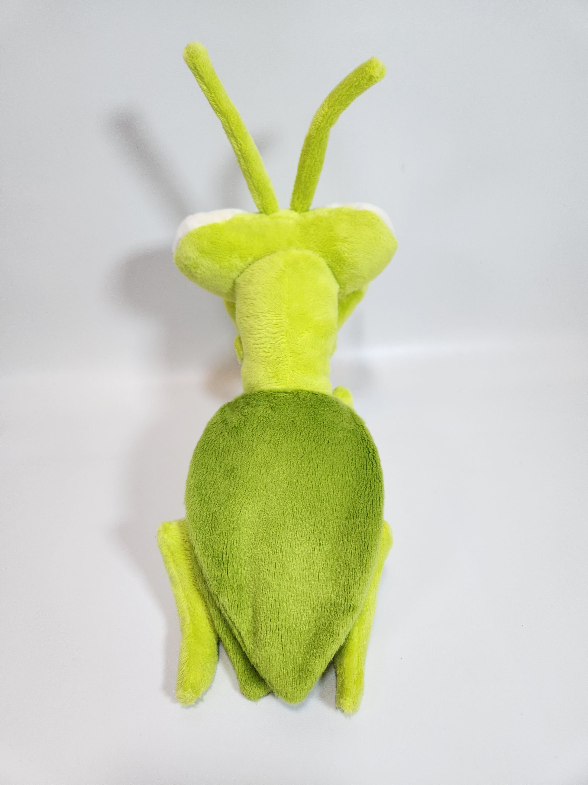 This is a chibi praying mantis plush. It is 7" tall without antennae and 10" tall with antennae. It is made from 3mm minky and weighted with glass beads in its butt and wires in its legs to help it stand. Its arms are jointed and wired so they can be posed. Its head is also jointed and can be rotated, which is a feature that did not make it into the final version of this pattern.