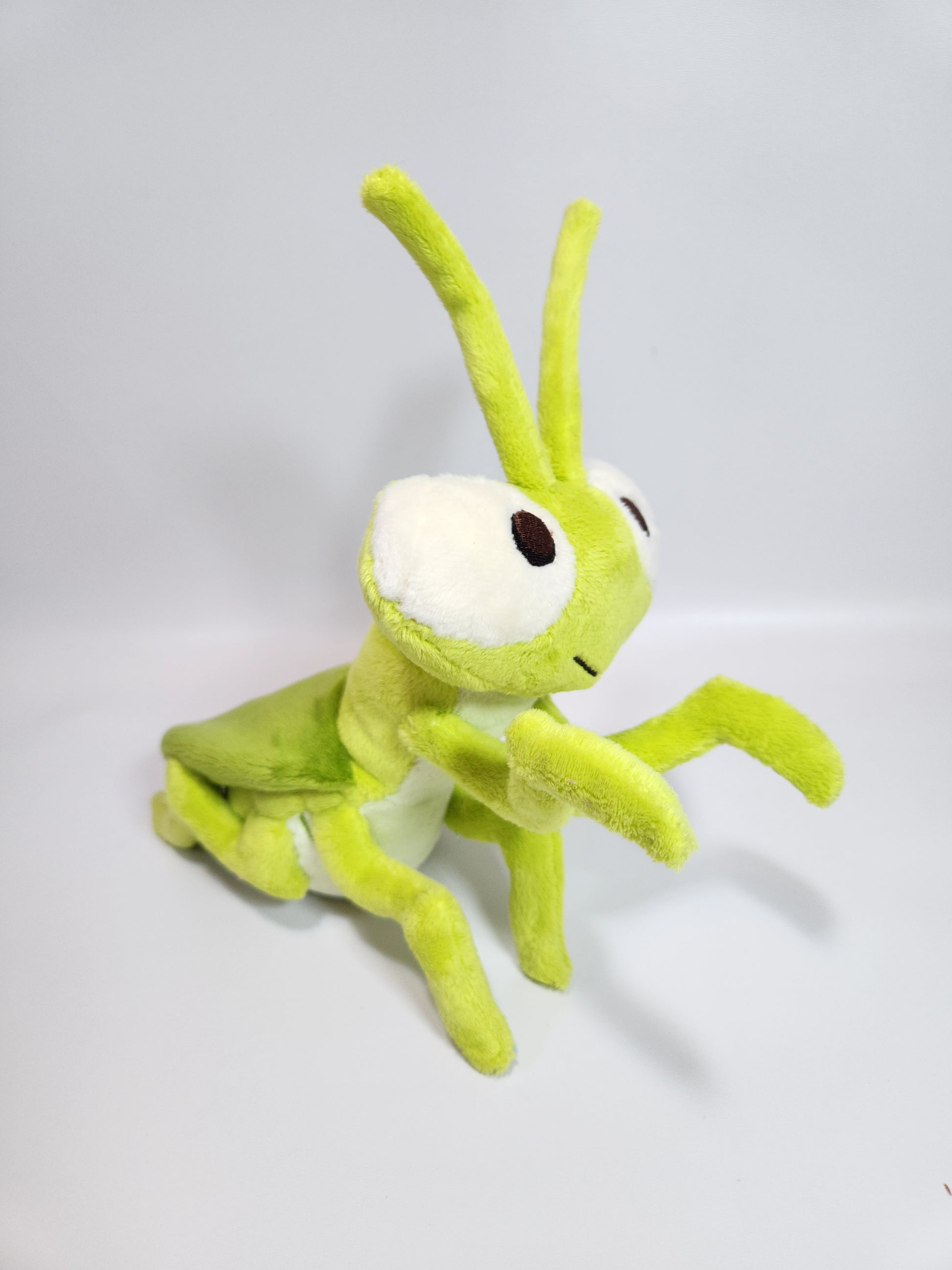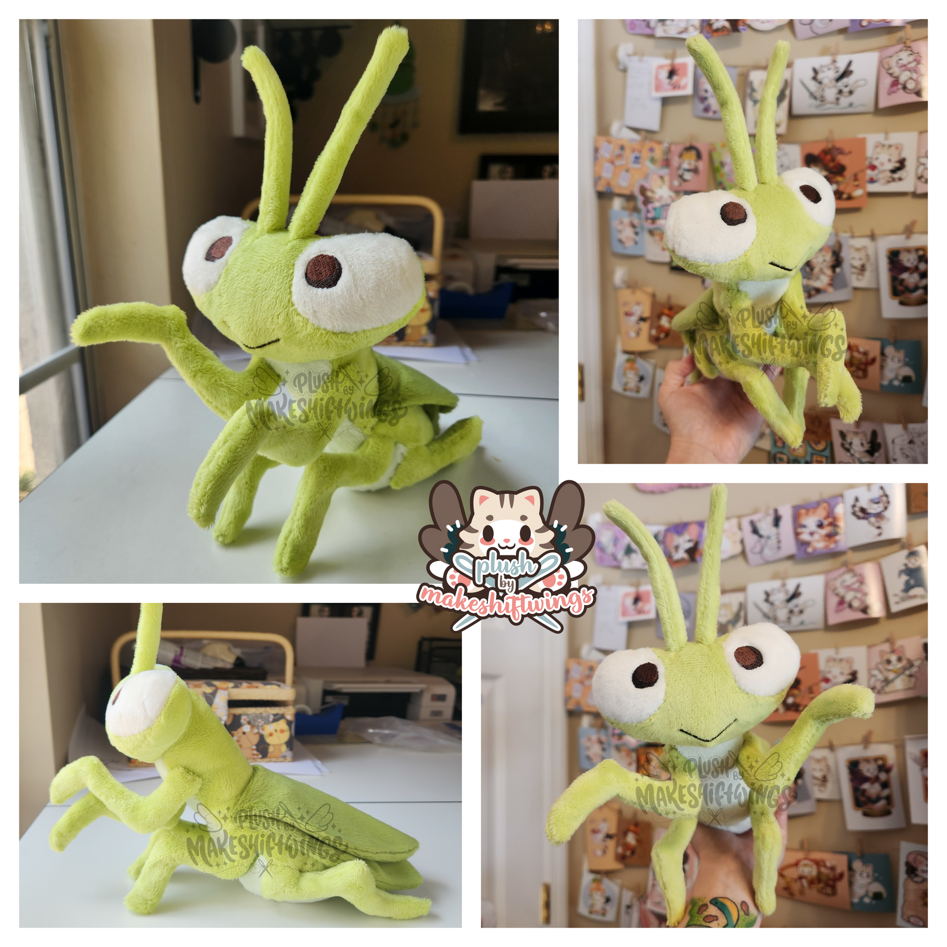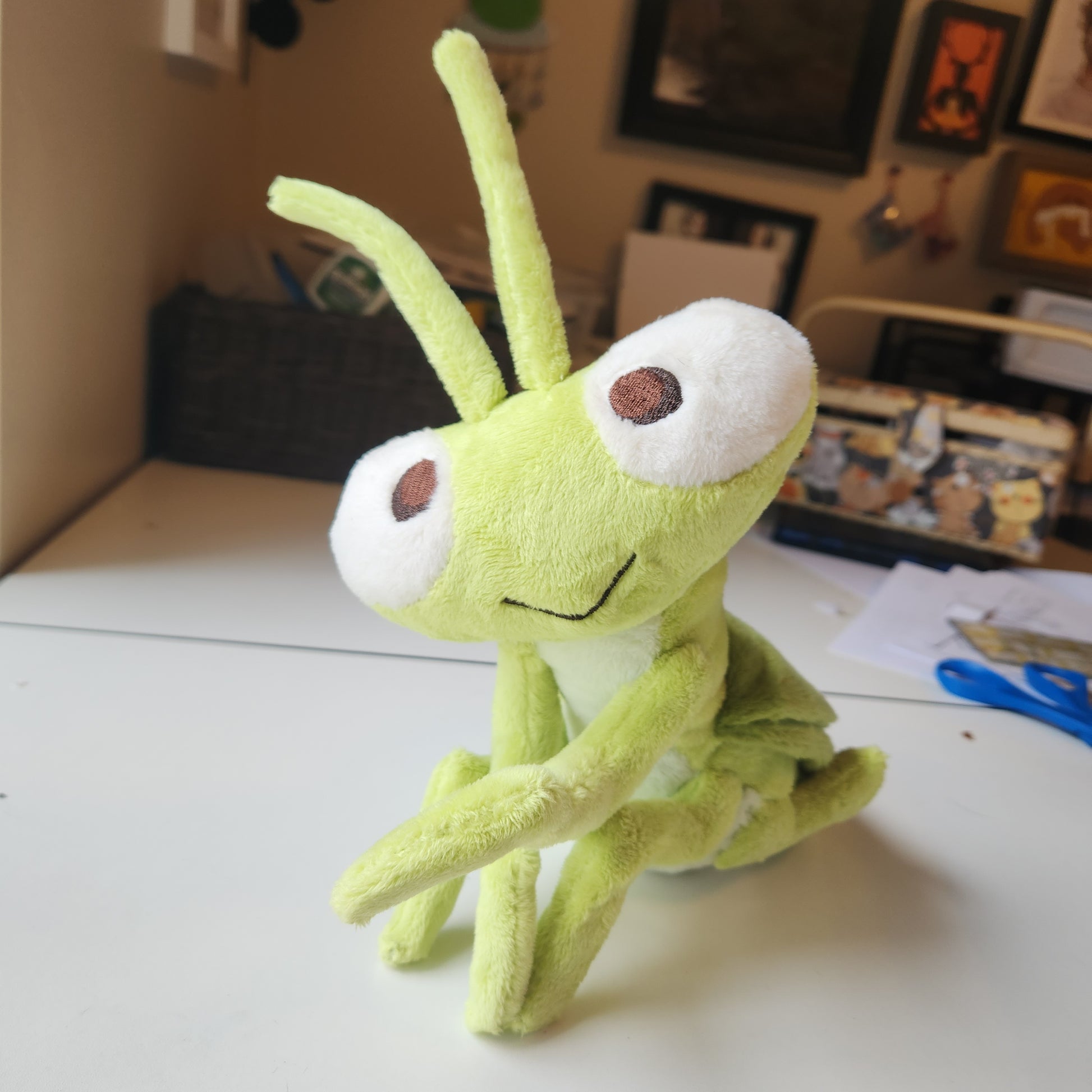 This is a chibi praying mantis plush. It is 7" tall without antennae and 10" tall with antennae. It is made from 3mm minky and weighted with glass beads in its butt and wires in its legs to help it stand. Its arms are jointed and wired so they can be posed. Its head is also jointed and can be rotated, which is a feature that did not make it into the final version of this pattern.