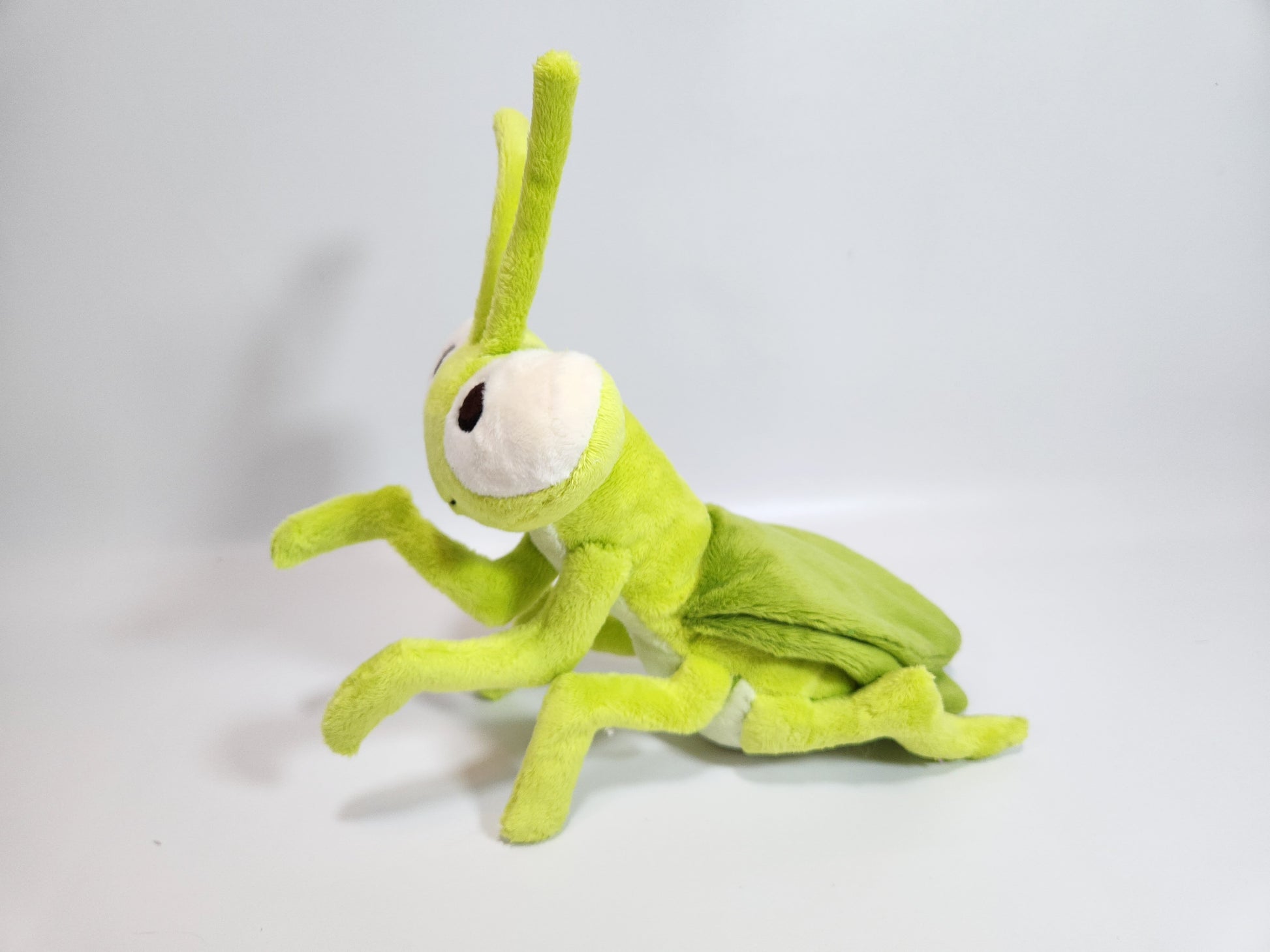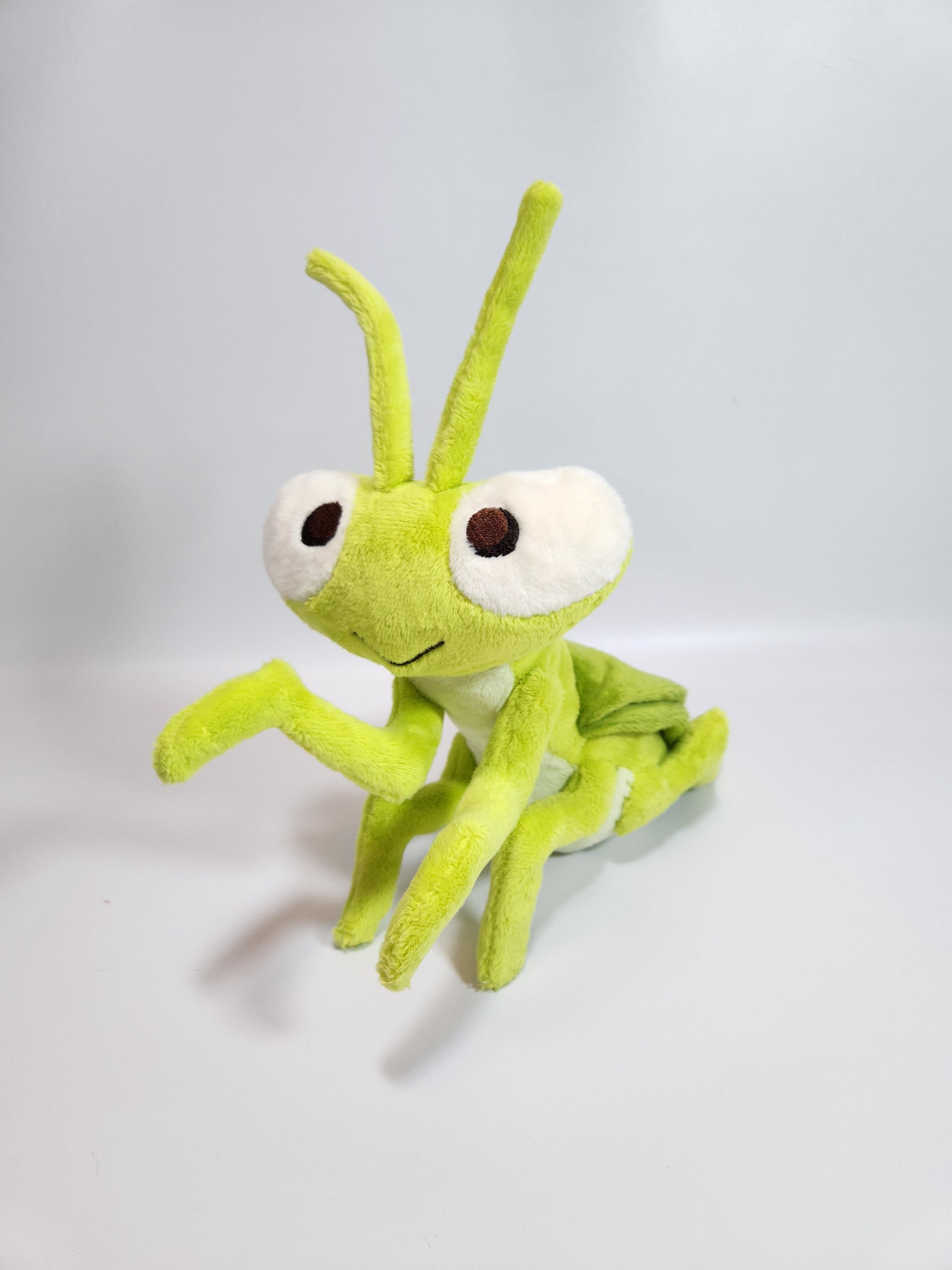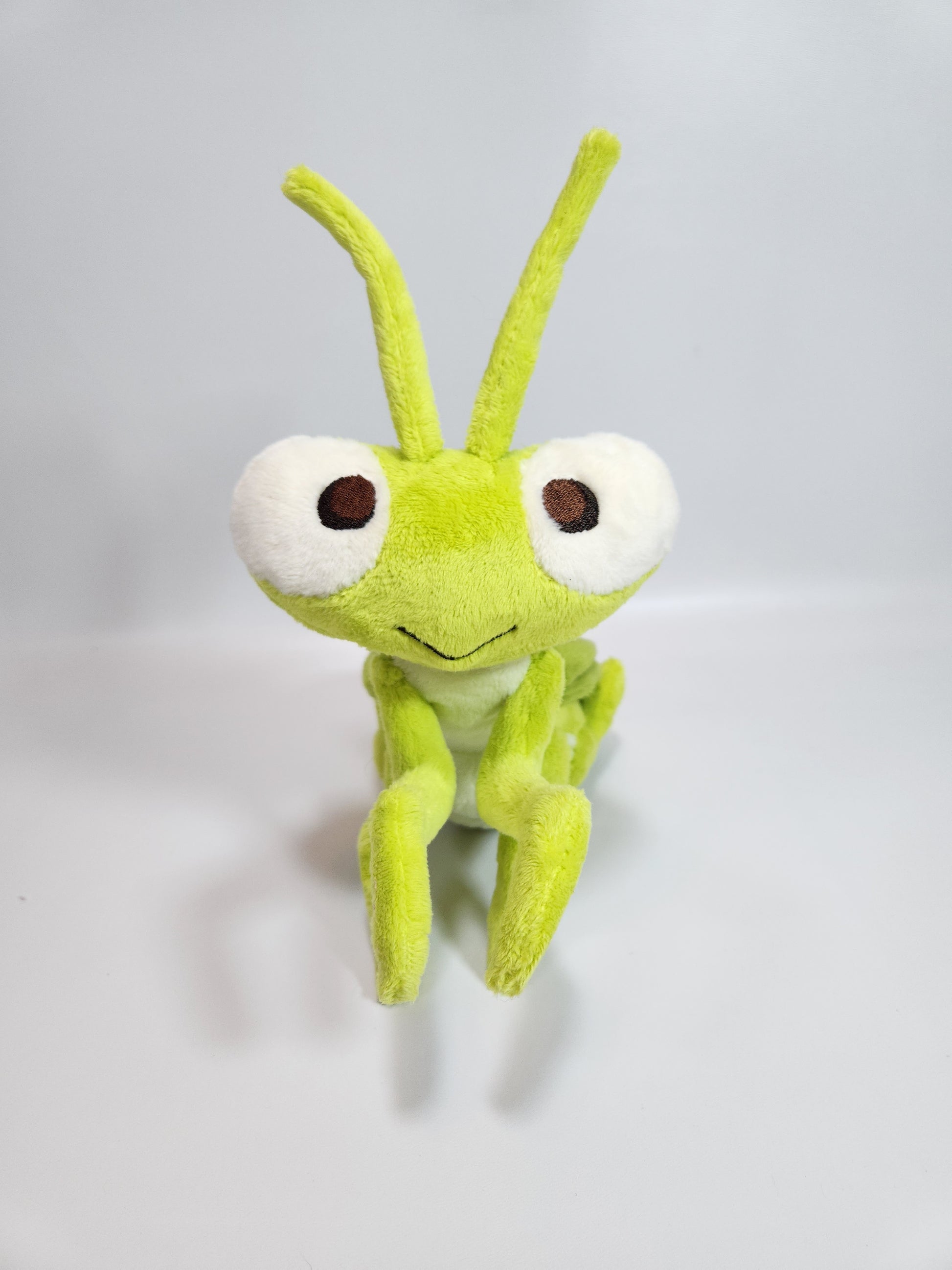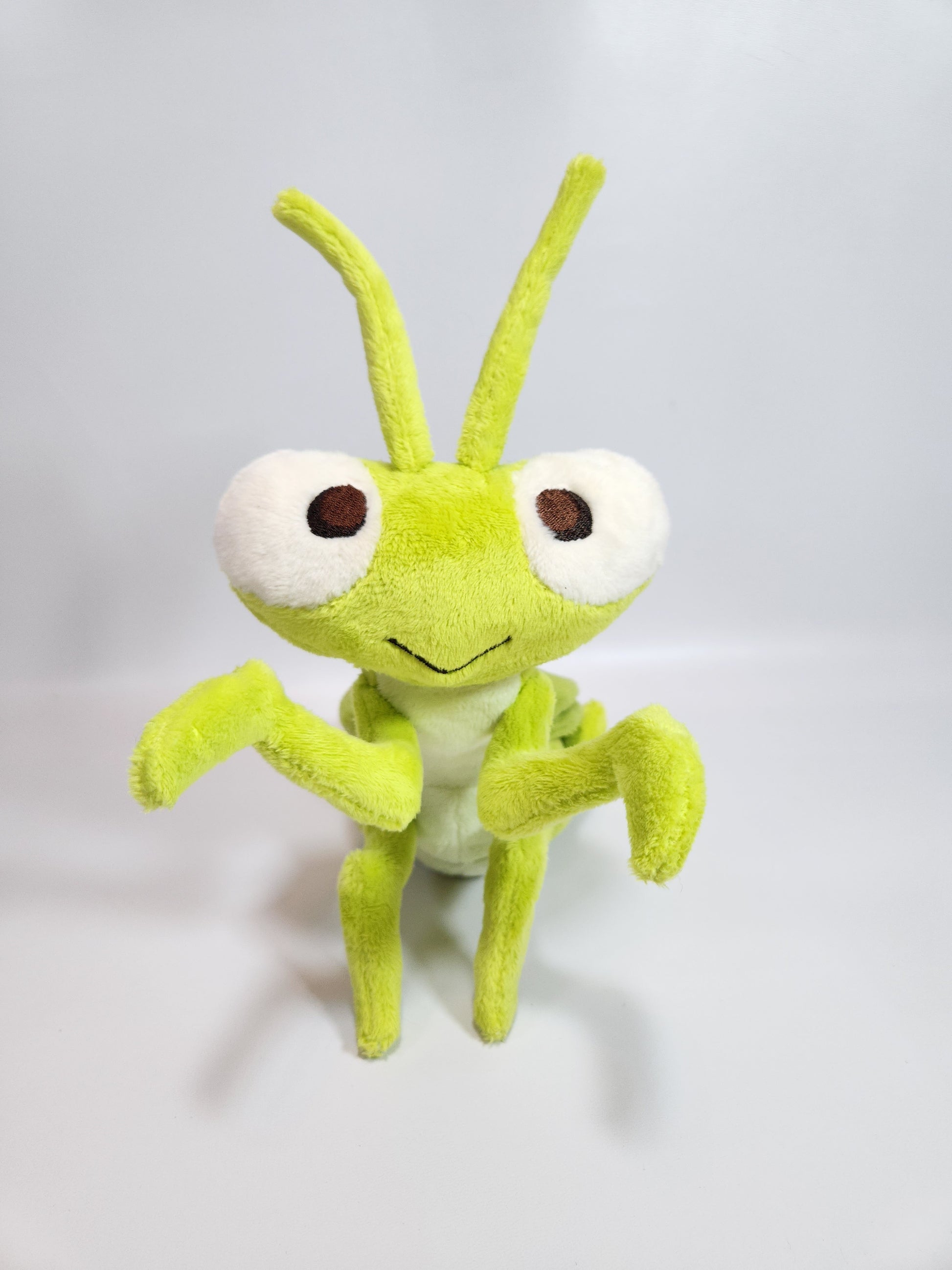 This is a chibi praying mantis plush. It is 7" tall without antennae and 10" tall with antennae. It is made from 3mm minky and weighted with glass beads in its butt and wires in its legs to help it stand. Its arms are jointed and wired so they can be posed. Its head is also jointed and can be rotated, which is a feature that did not make it into the final version of this pattern.