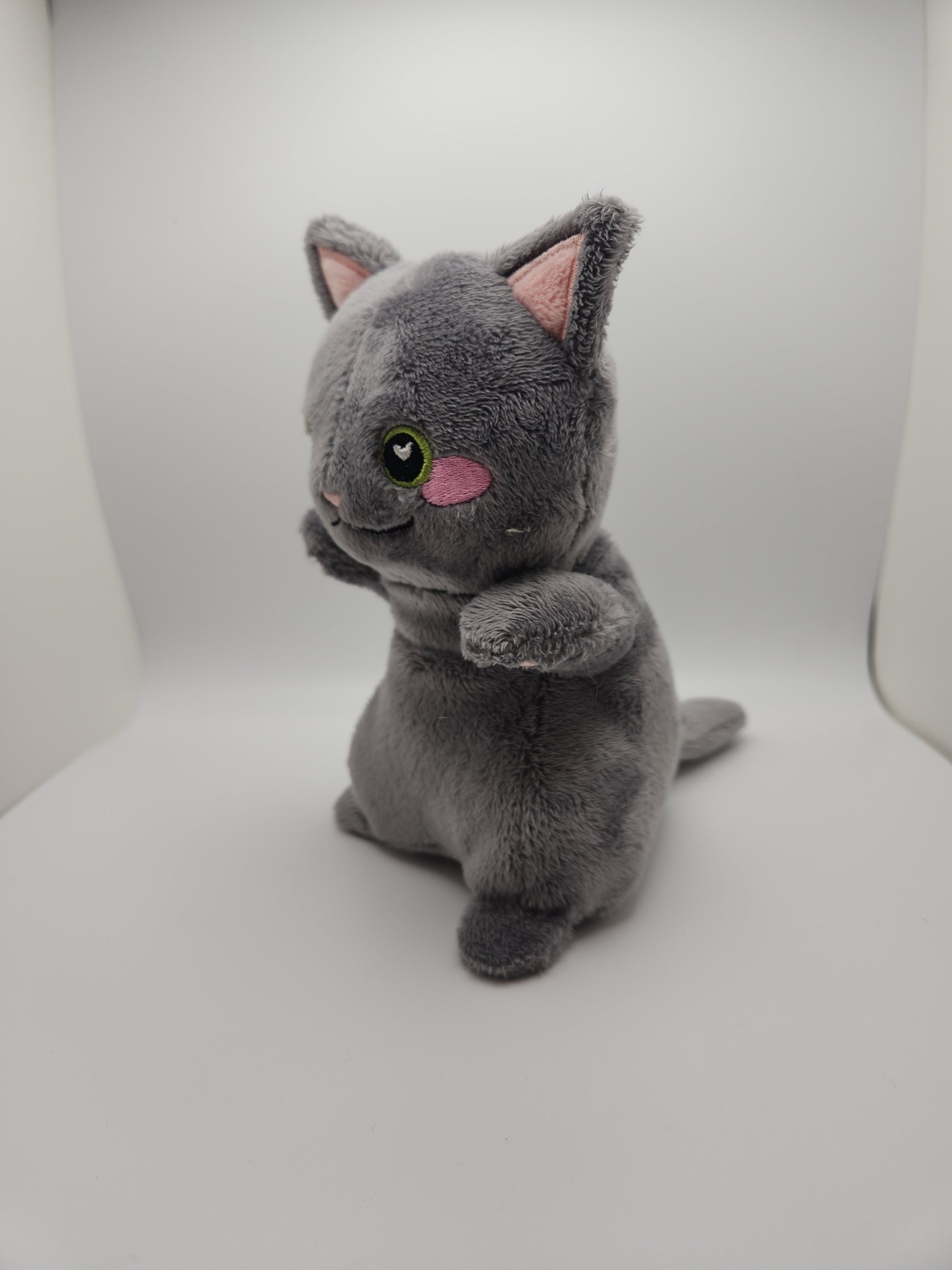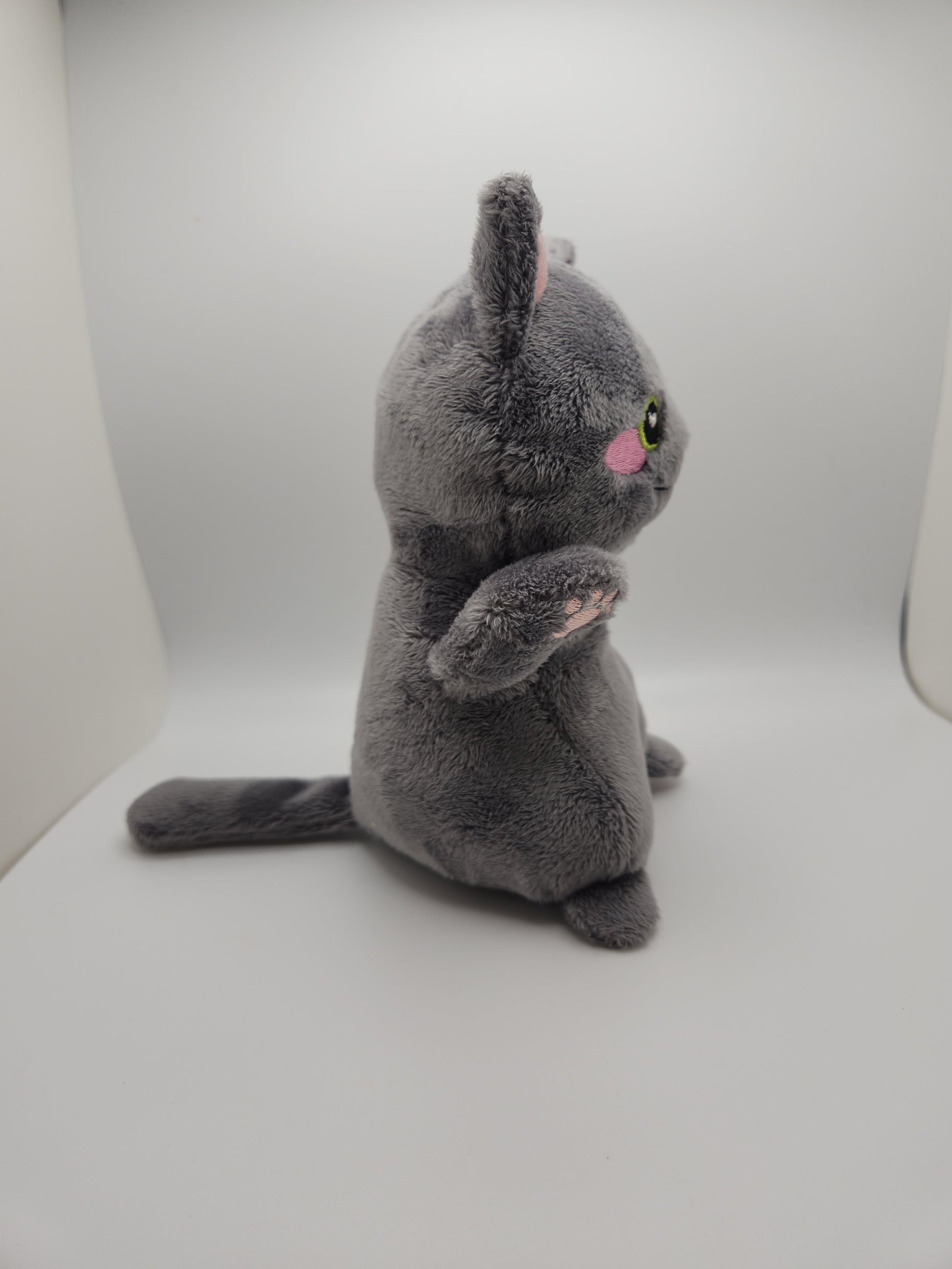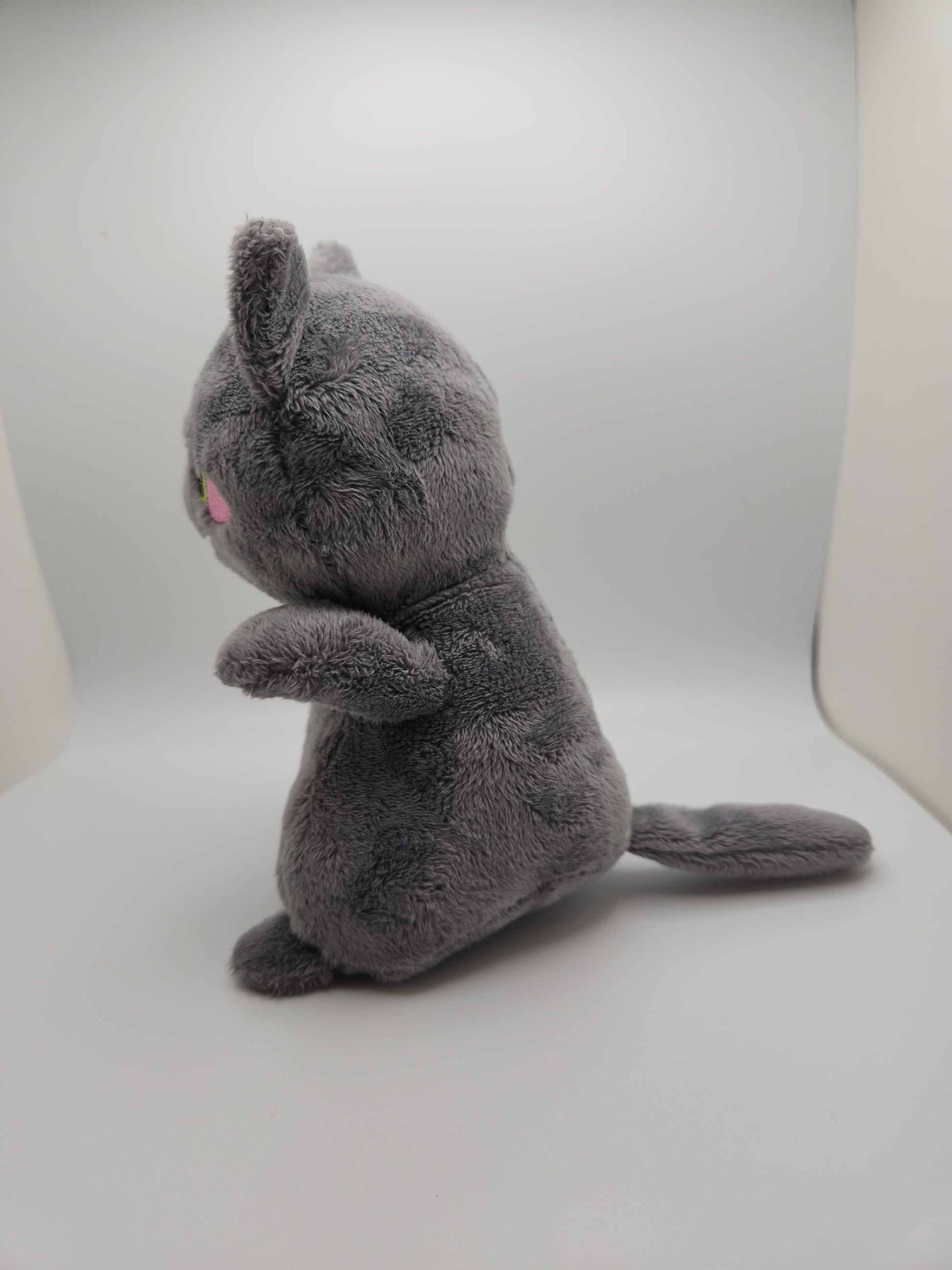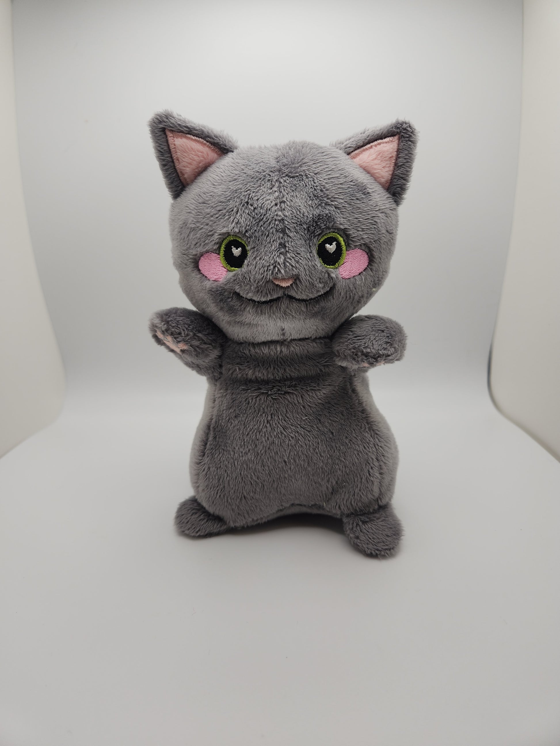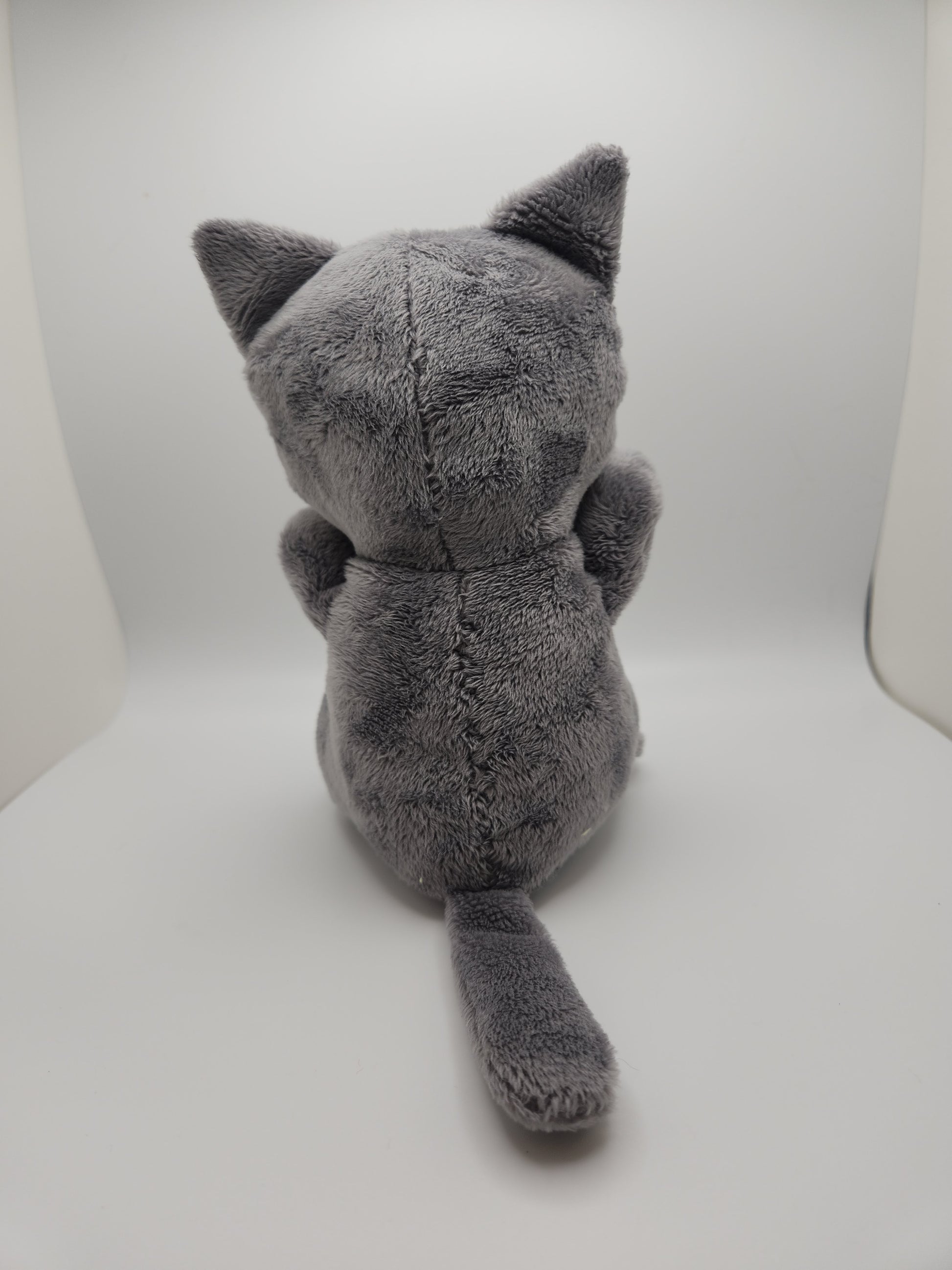 This is a 7" tall grey cat made from minky with embroidered eyes. He comes with a removable flannel box with "TREATS" embroidered on the front. The box is slightly larger than other plushies I'm selling with this pattern. The cat was a prototype plush made while developing the pattern, and is slightly different from the final design, mostly in the arms.