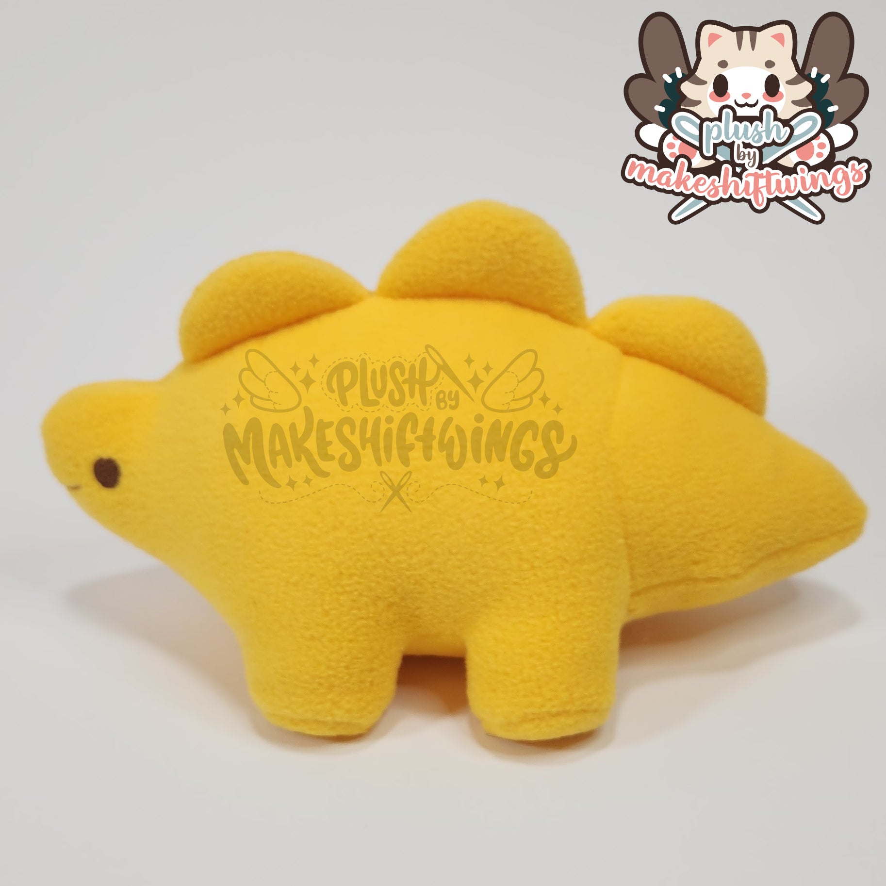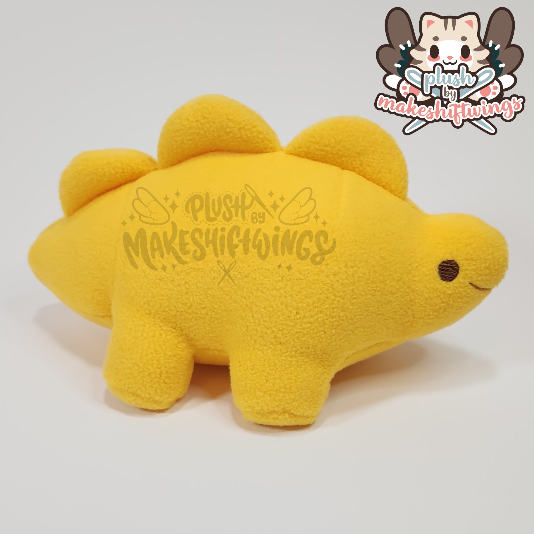 This stegosaurus dino nuggie plush is made from anti-pill fleece with machine embroidered eyes and mouth. It is about 5" tall. Features an earlier design of this plush which has a lower placed mouth than the final.