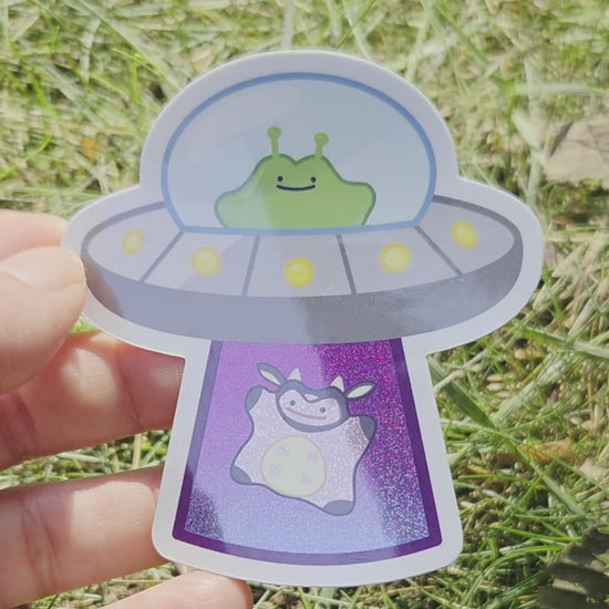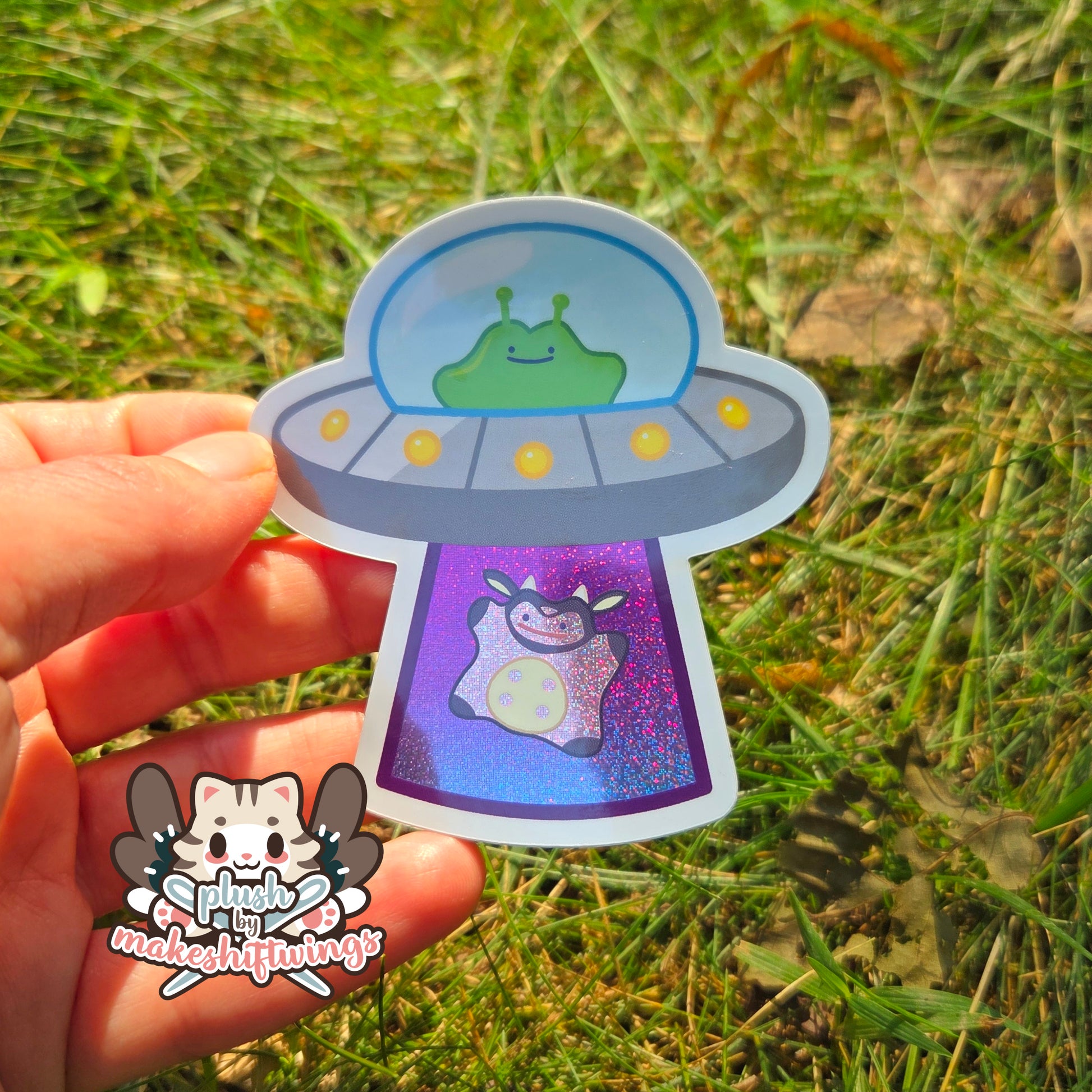 This UFO sticker features a shiny gloss finish with glittery beam. It is approximately 3" tall. The stickers are weatherproof for 2-4 years. This means they will hold up in the rain, sun, snow, dishwashers, microwaves, etc.