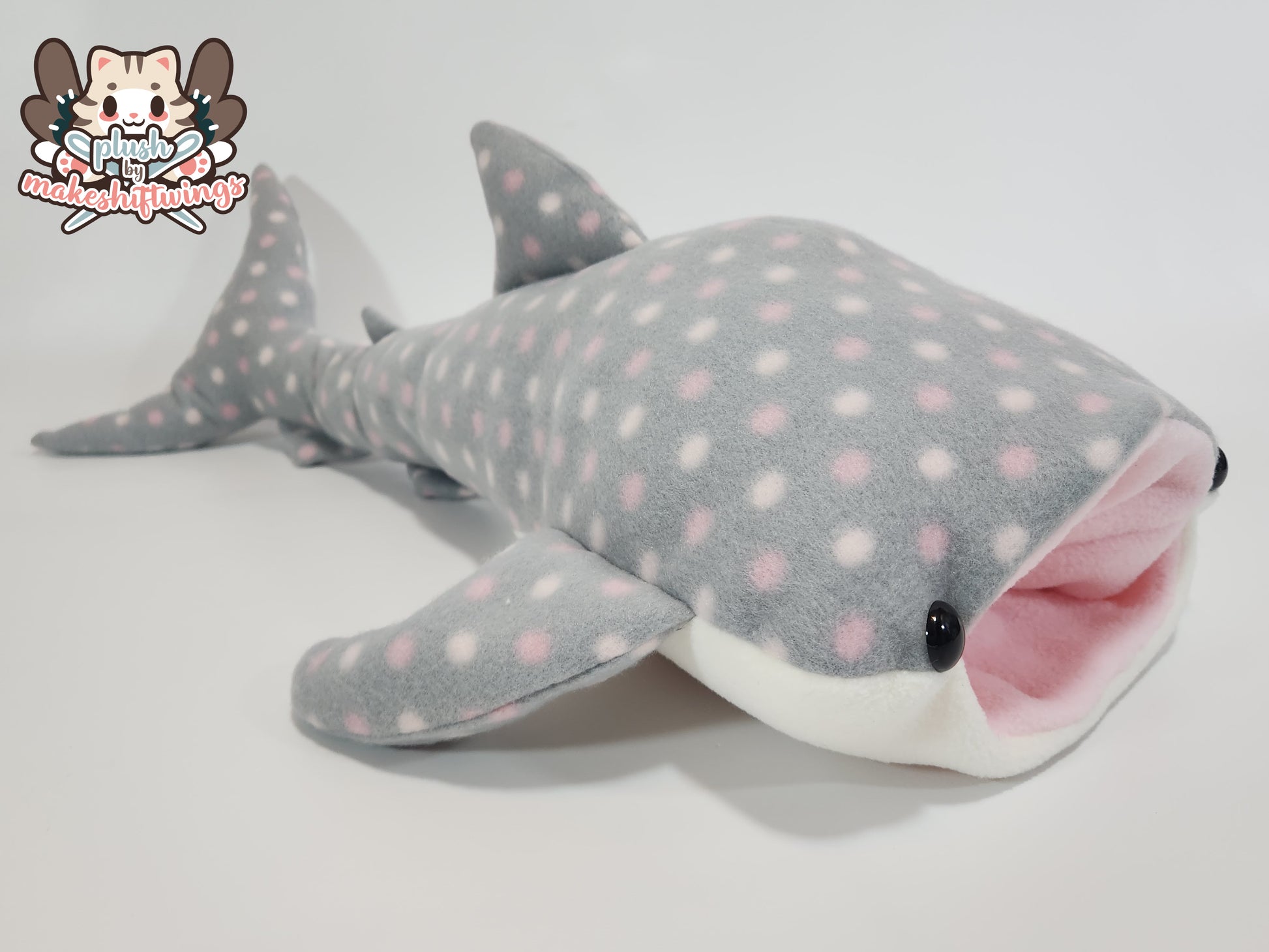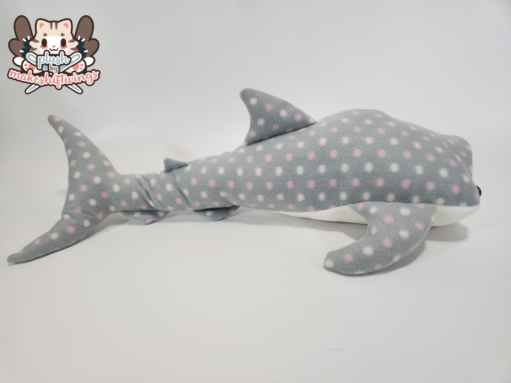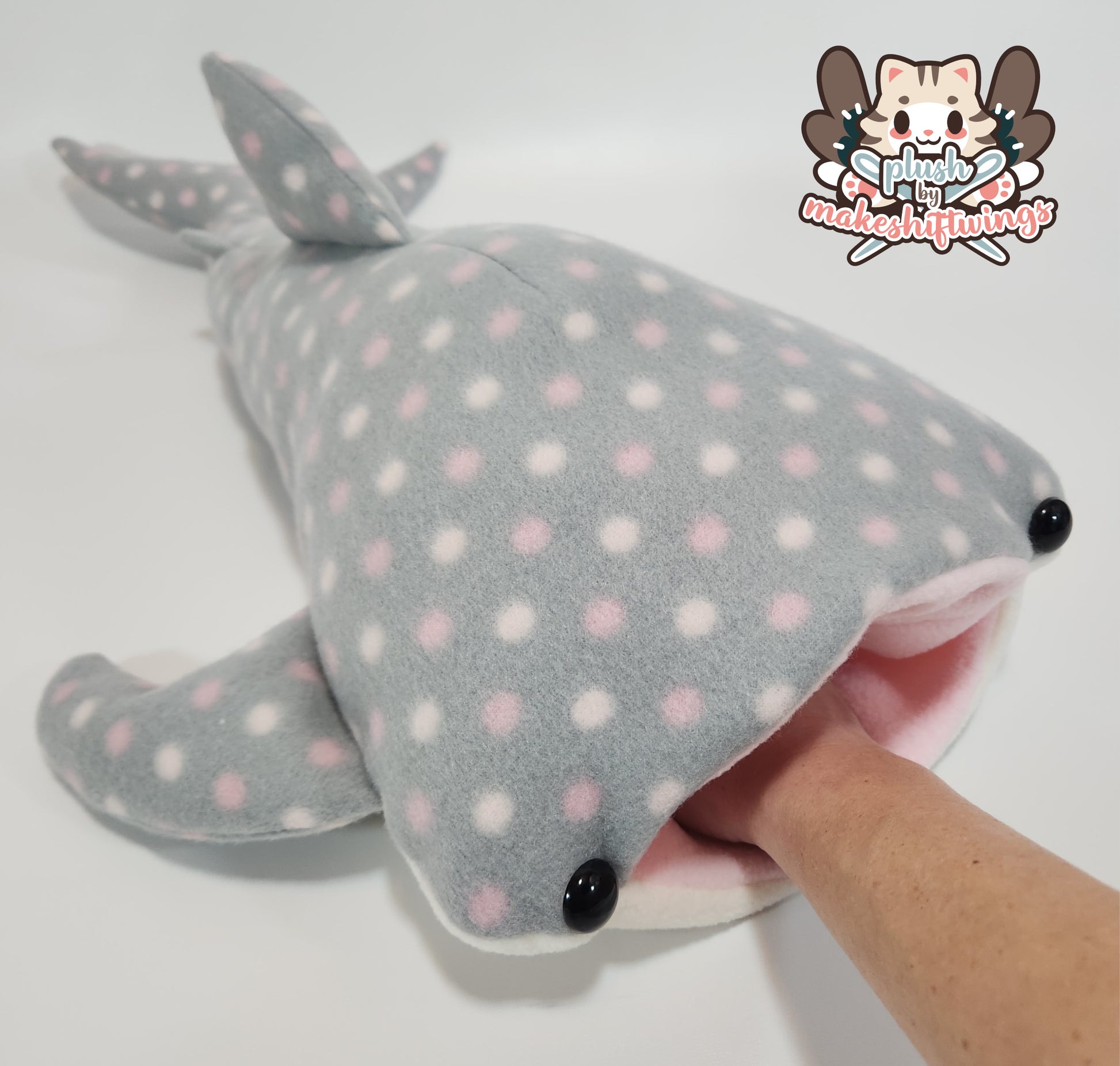This is a large whale plush made from fleece. It is approximately 25" long and stuffed with mochi stuffing. He has a pocket mouth for hiding small objects or plushies. He has safety eyes and is entirely machine sewn.