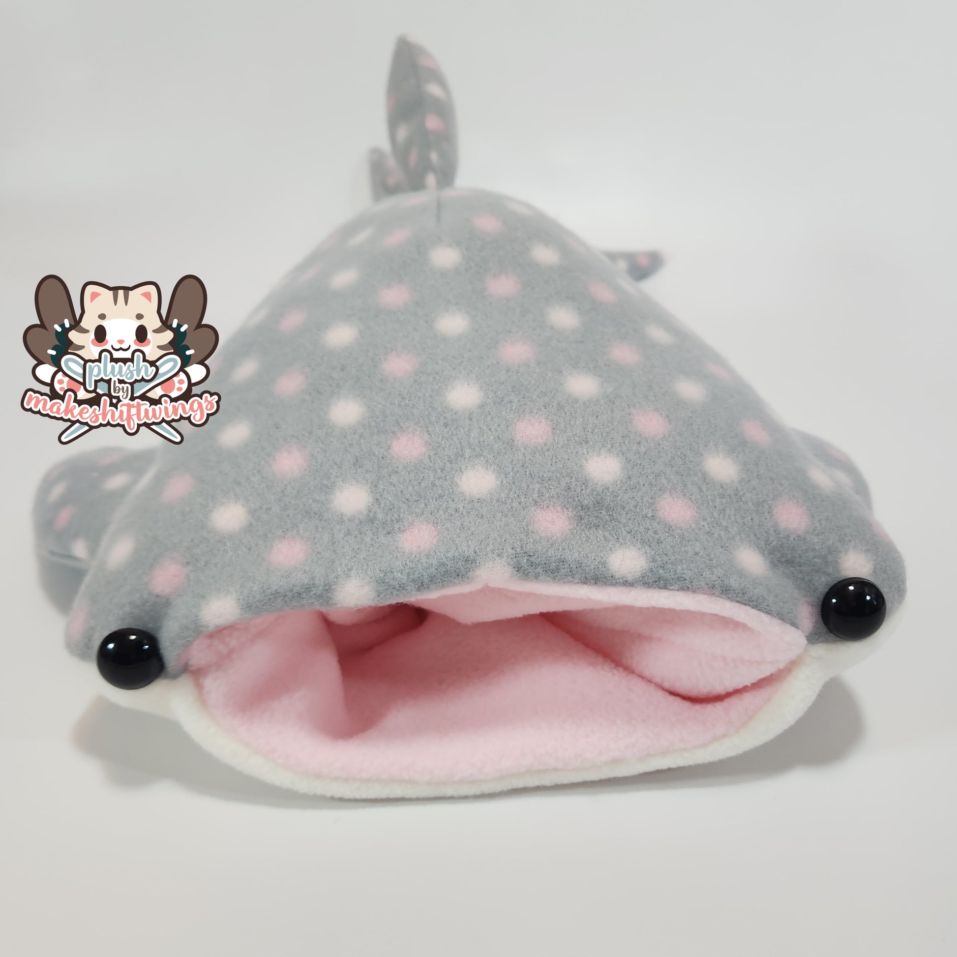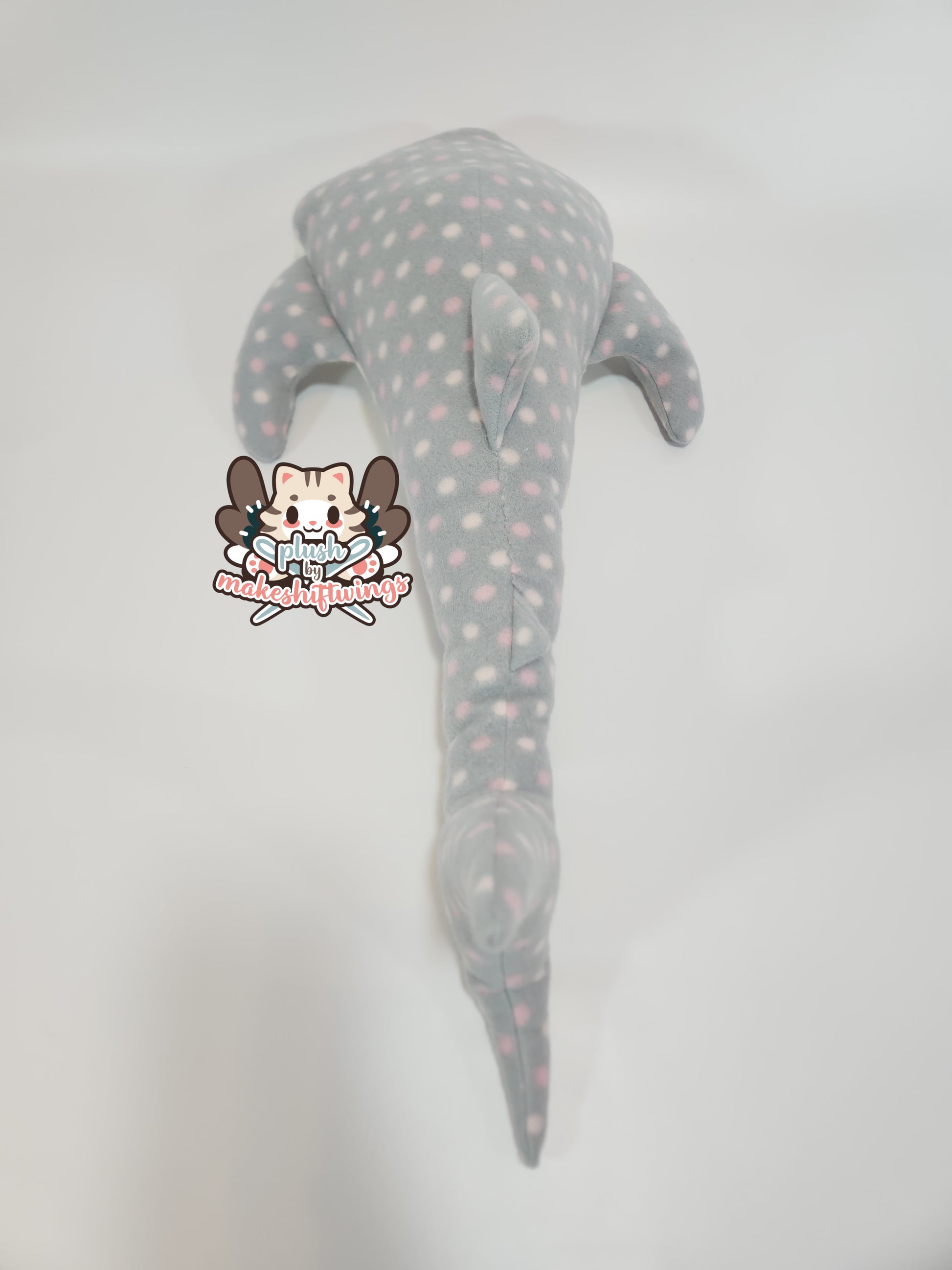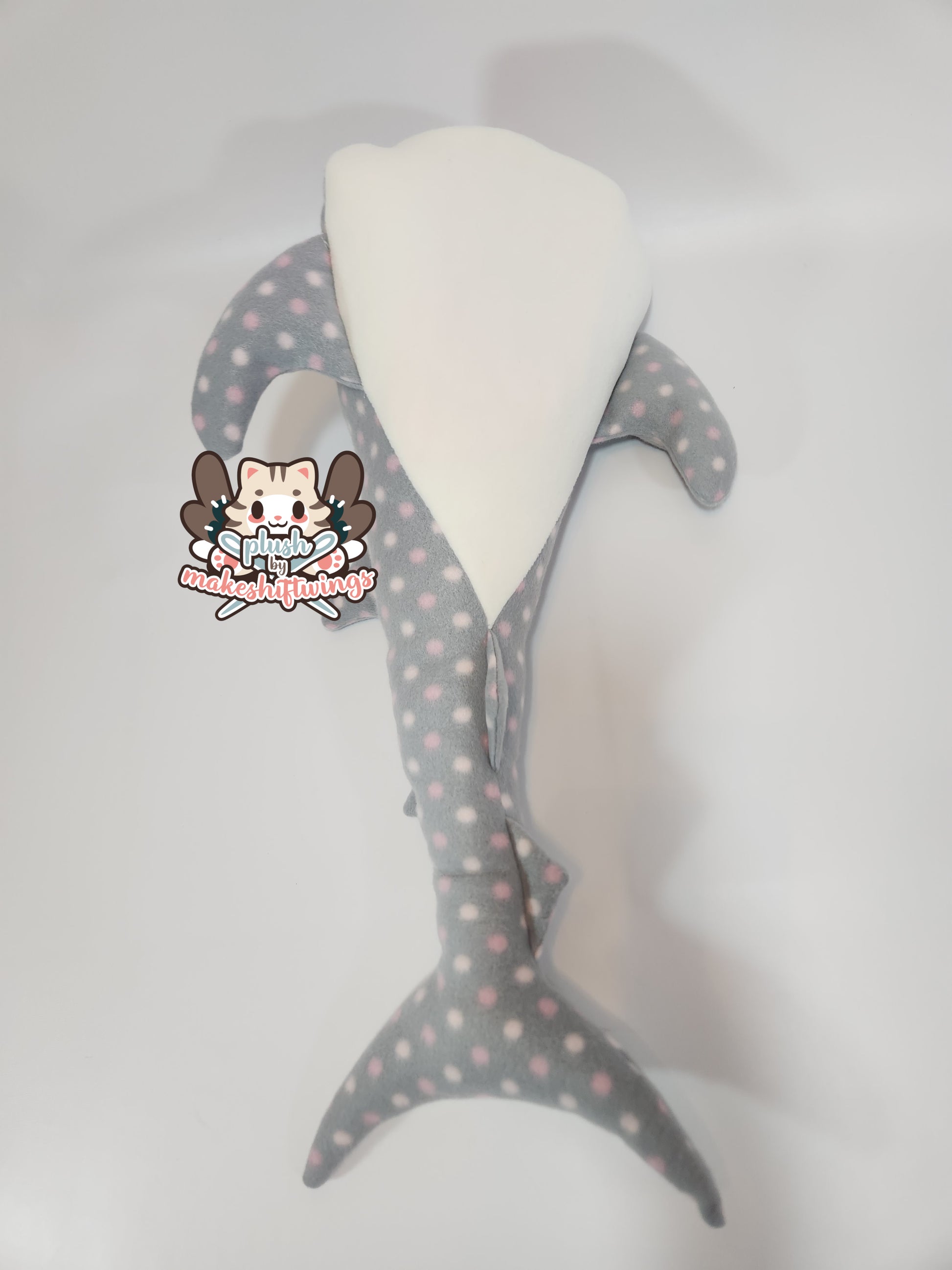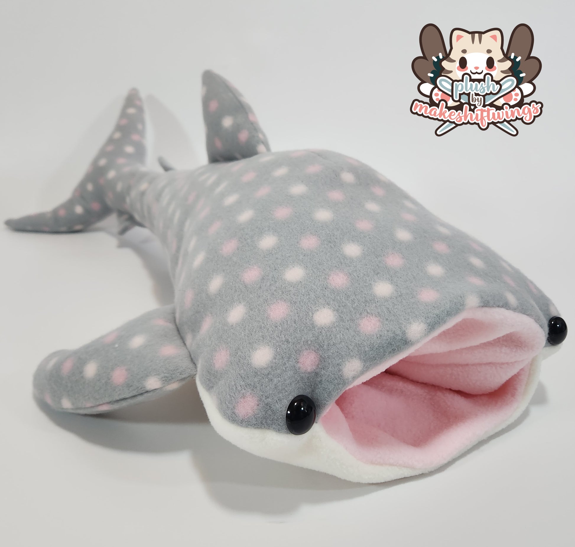 This is a large whale plush made from fleece. It is approximately 25" long and stuffed with mochi stuffing. He has a pocket mouth for hiding small objects or plushies. He has safety eyes and is entirely machine sewn.